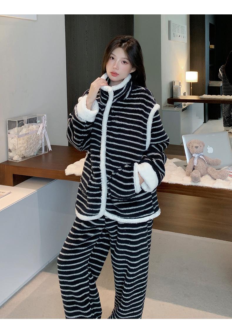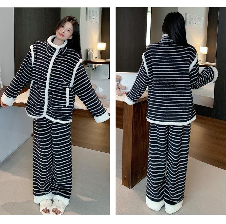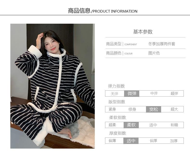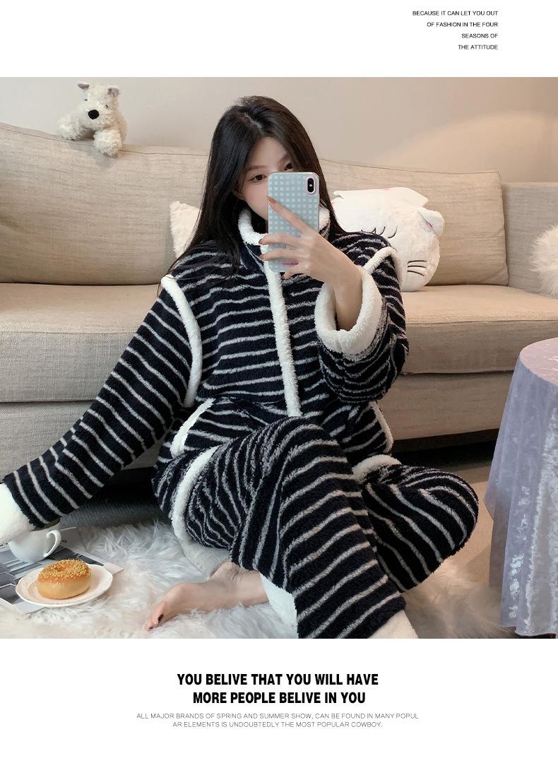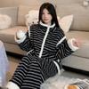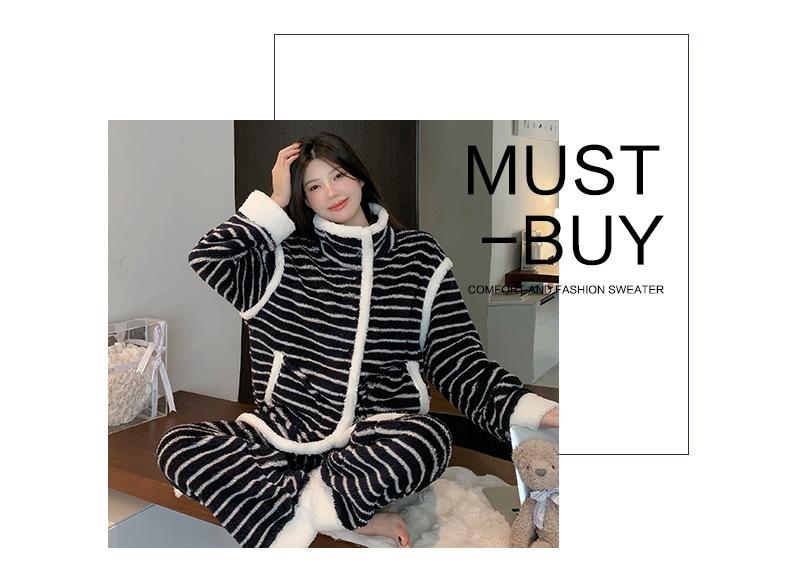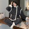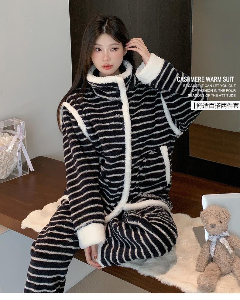Ropa exterior de cuello alto a rayas para el hogar, de manga larga, plus terciopelo, grueso, pijama de forro polar de coral, nuevo para la temporada de otoño e invierno para mujer, conjunto cielo