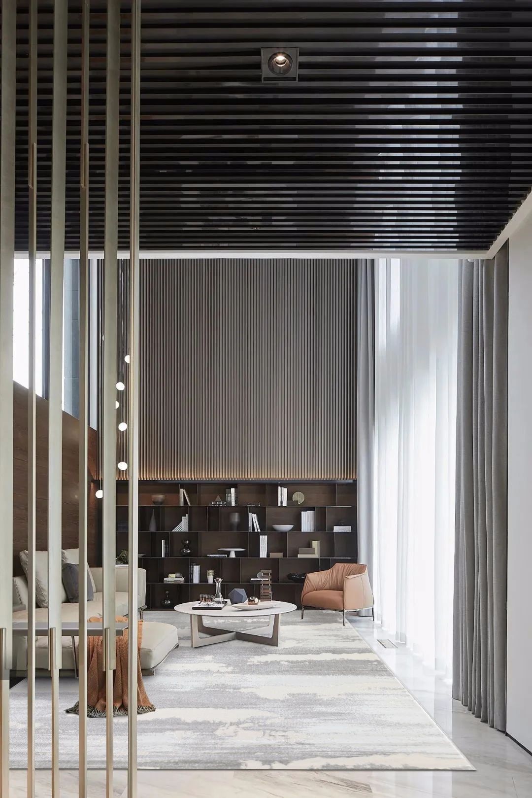El contraste entre la luz y la oscuridad es claro, dando a la sala de estar una sensación diferente de profundidad; y el material en sí es una exhibición silenciosa de textura; el diseño simple de patrón geométrico tiene líneas limpias y ordenadas.