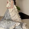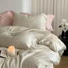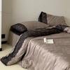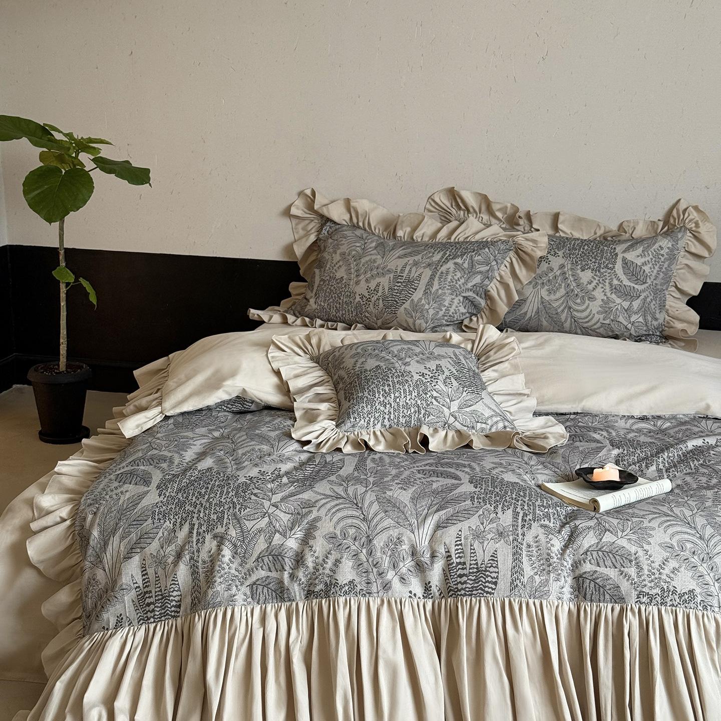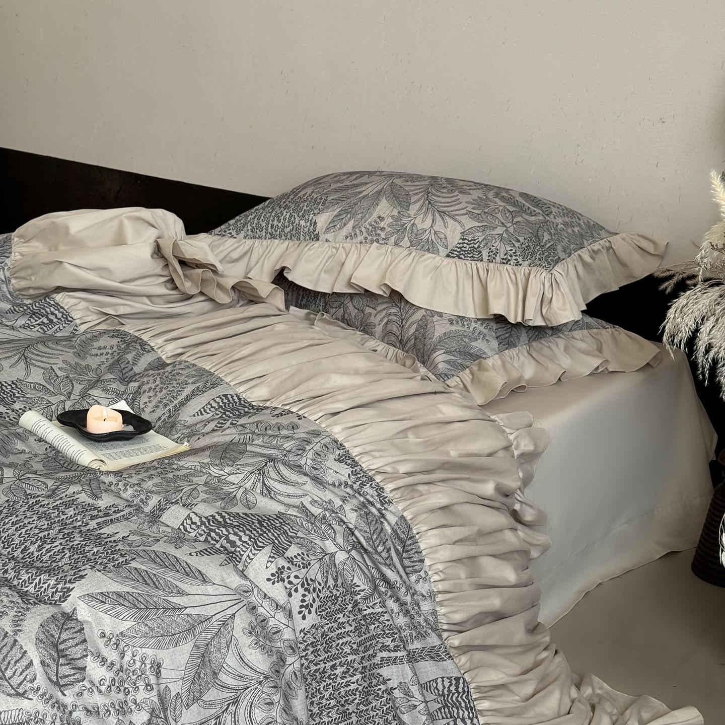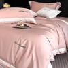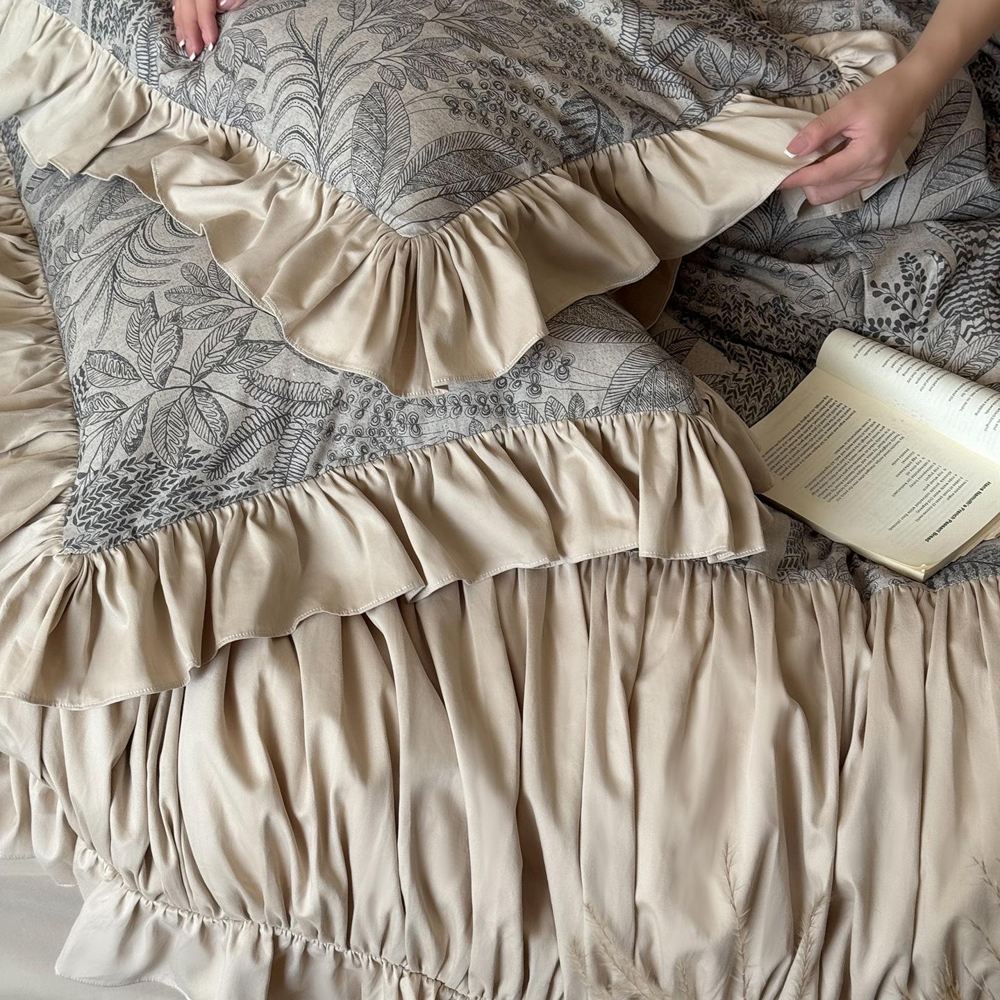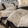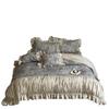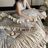 Juego de Cuatro Piezas de Algodón Lino de Lujo Ligero Francés Estilo Princesa Satén Tributo Cepillado Ropa de Cama Encaje Otoño Invierno Funda Nórdica Gruesa Sábana