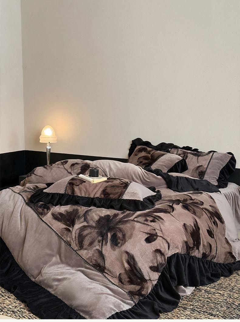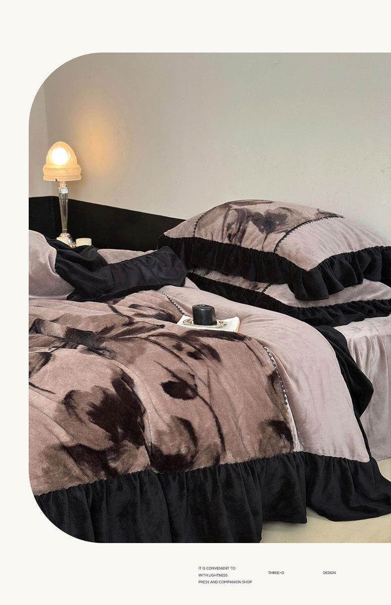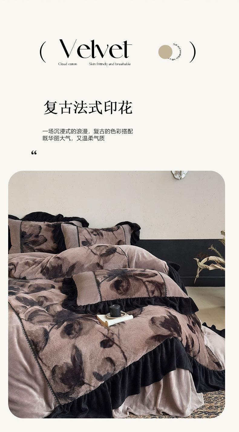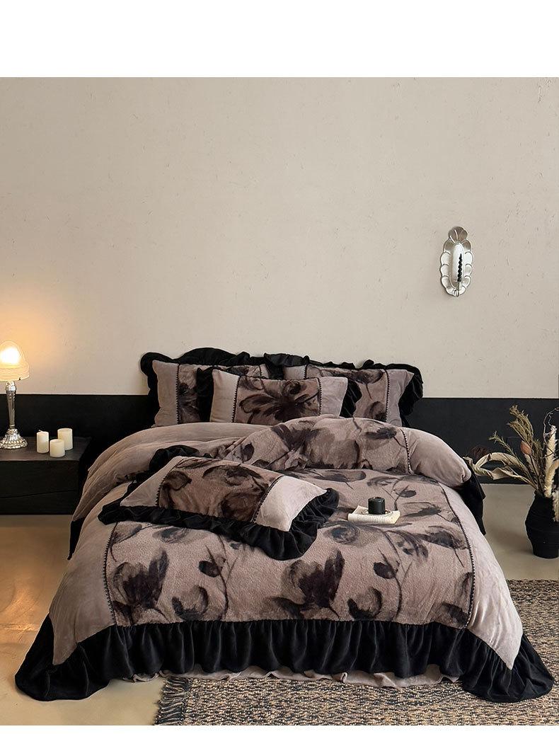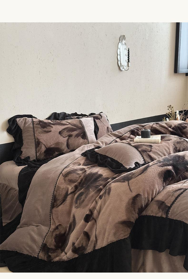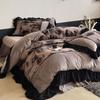 Clase A Retro Terciopelo de Piel Sintética Terciopelo de Leche Retro Encaje Francés Ropa de Cama Juego de Cuatro Piezas Funda Nórdica más Sábana Bajera Ajustable de Terciopelo Estilo Falda de Cama