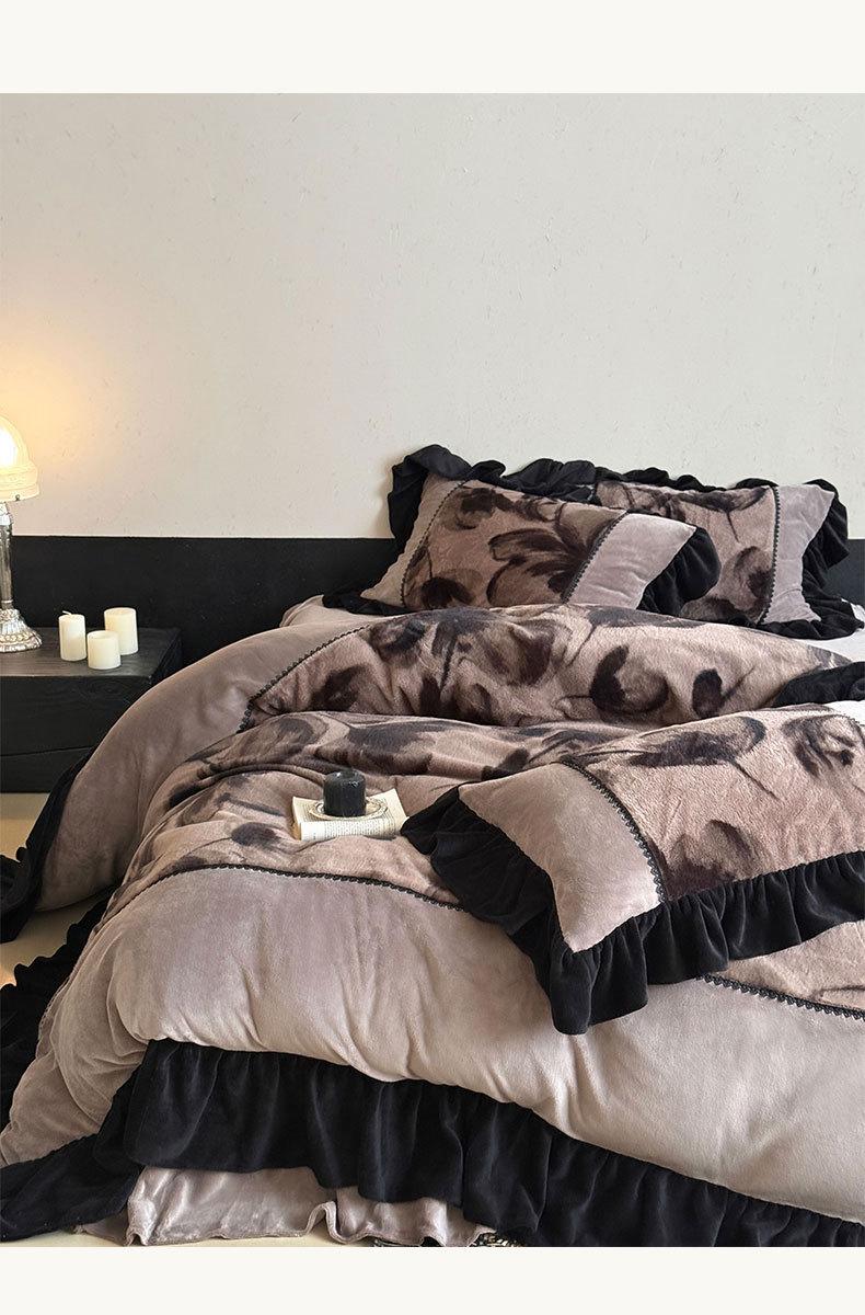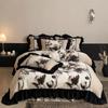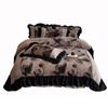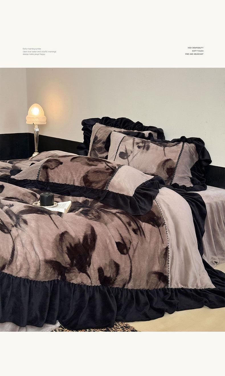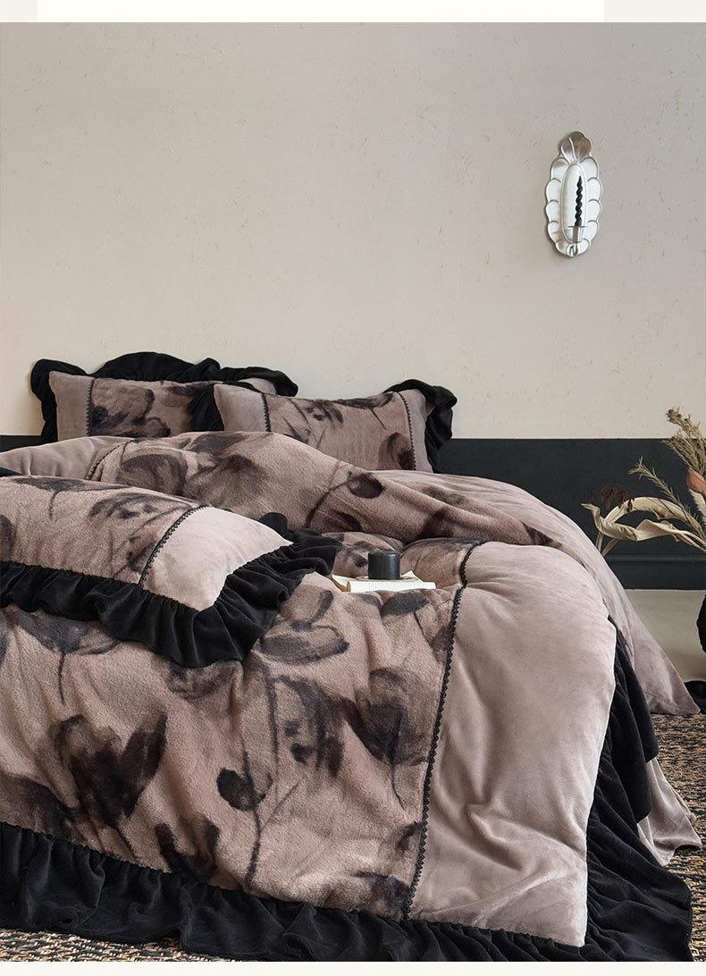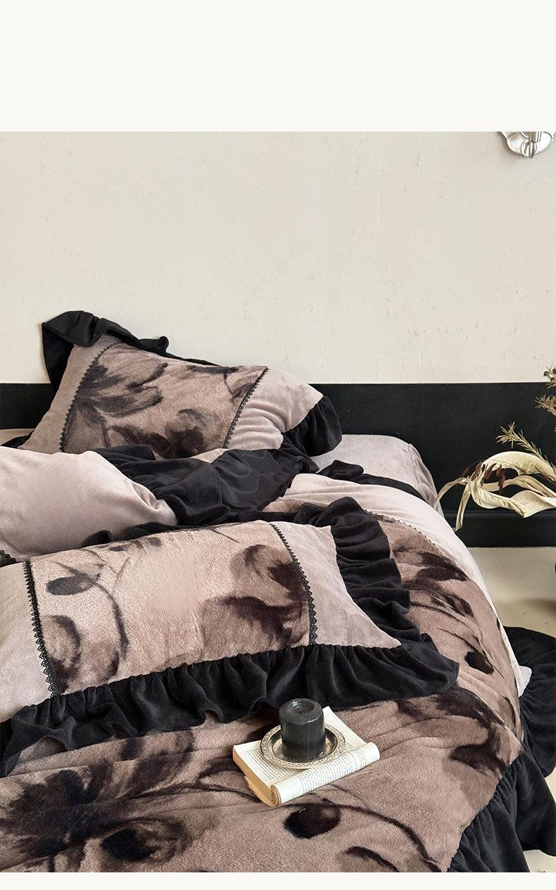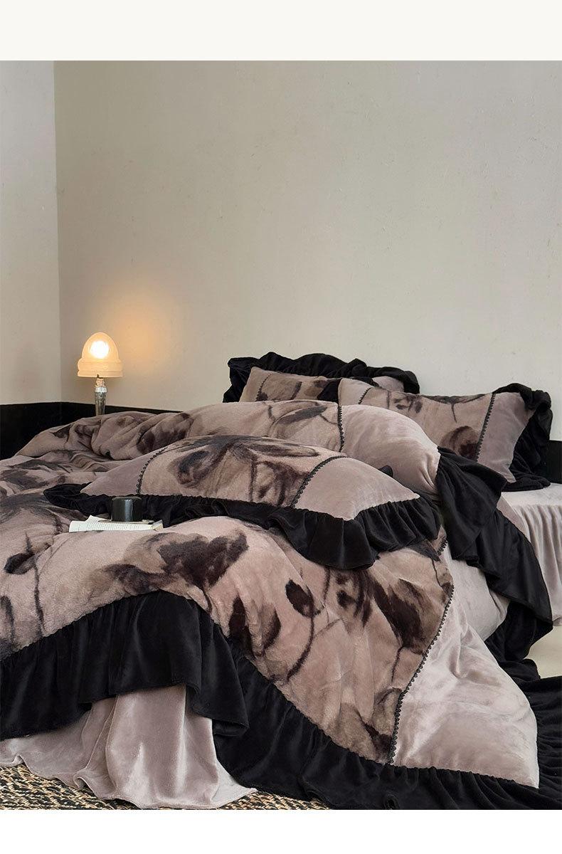 Clase A Retro Terciopelo de Piel Sintética Terciopelo de Leche Retro Encaje Francés Ropa de Cama Juego de Cuatro Piezas Funda Nórdica más Sábana Bajera Ajustable de Terciopelo Estilo Falda de Cama