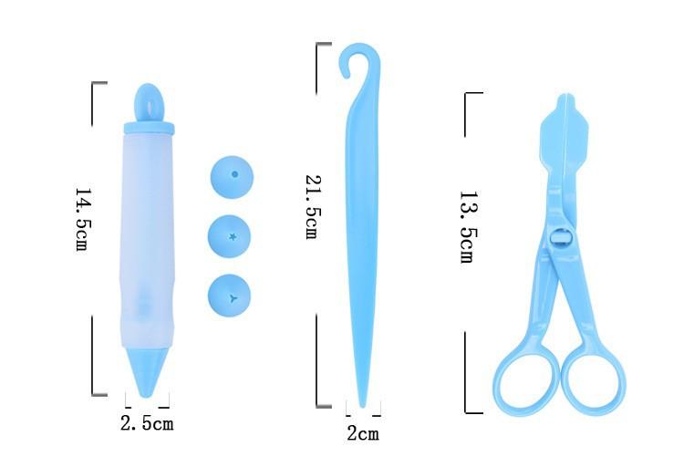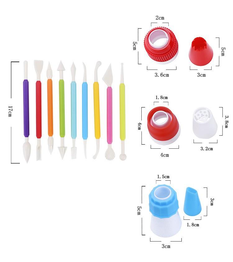 (1 pluma decoradora + 3 puntas de pluma decoradora) (1 juego de 5 cucharas medidoras) (9 cuchillos para tallar) (1 cuchillo desmoldador)