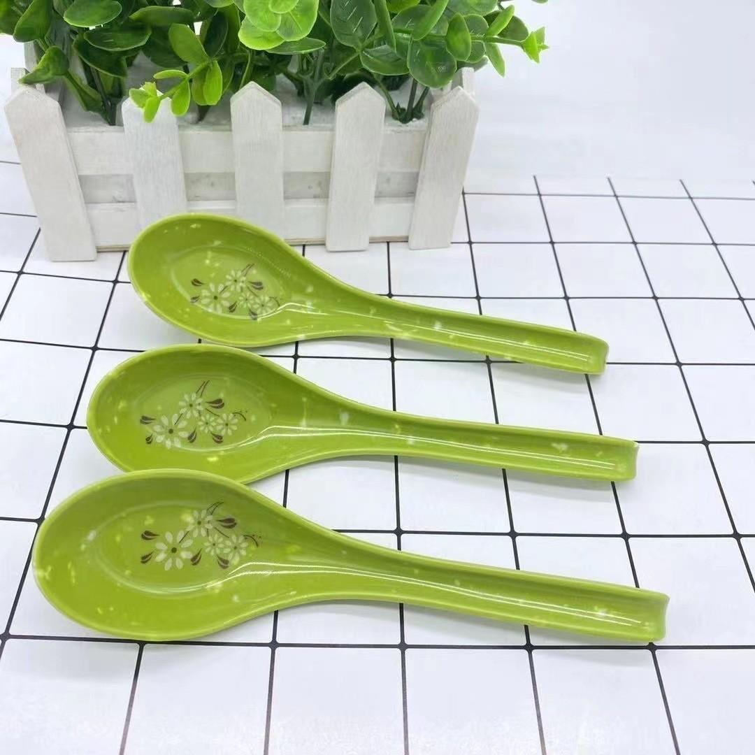 Cuchara verde de cola de gancho para el hogar, cuchara pequeña para sopa de mango largo, cuchara para sopa de restaurante para olla caliente picante, cuchara de melamina imitación porcelana, uso para restaurante