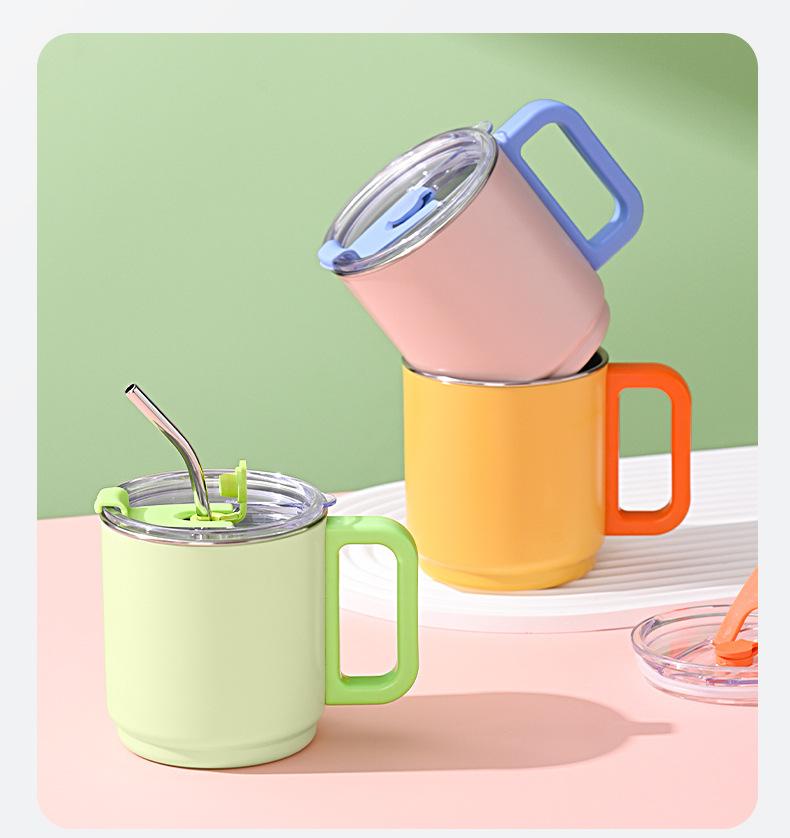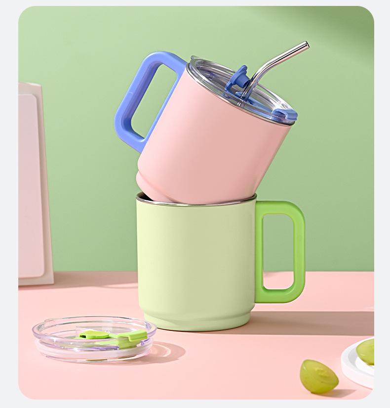 Pink (no lid or straw), Green (no lid or straw), Orange (no lid or straw), Pink (with lid and straw), Green (w...
