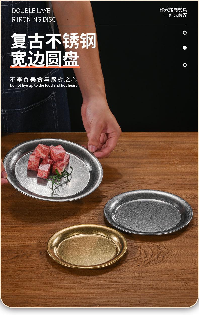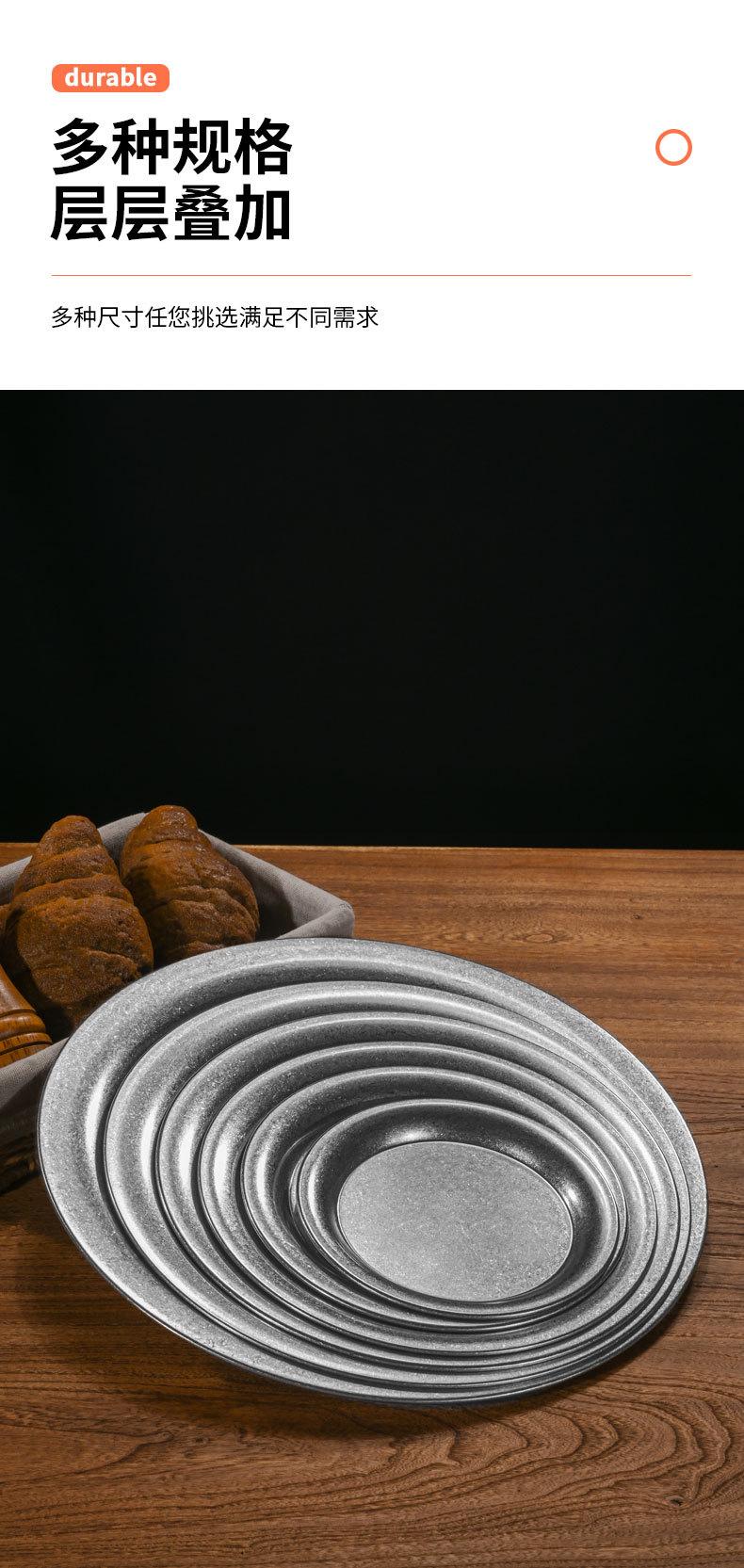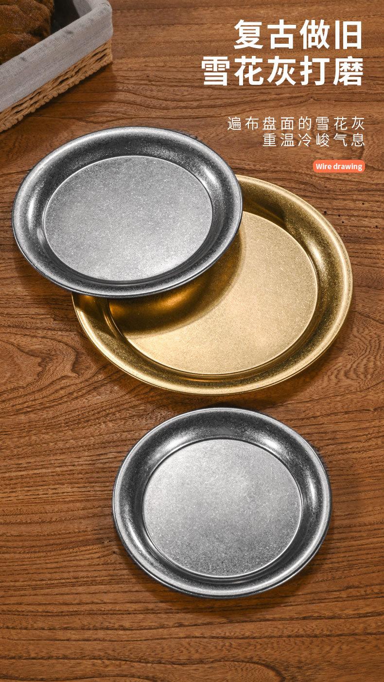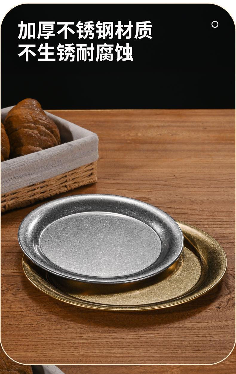 Plato Redondo de Acero Inoxidable Retro de Ala Ancha Bandeja Comercial Envejecida Plato de Fondo Plano Plato Hondo para Postre para Restaurante Barbacoa Asado de Carne