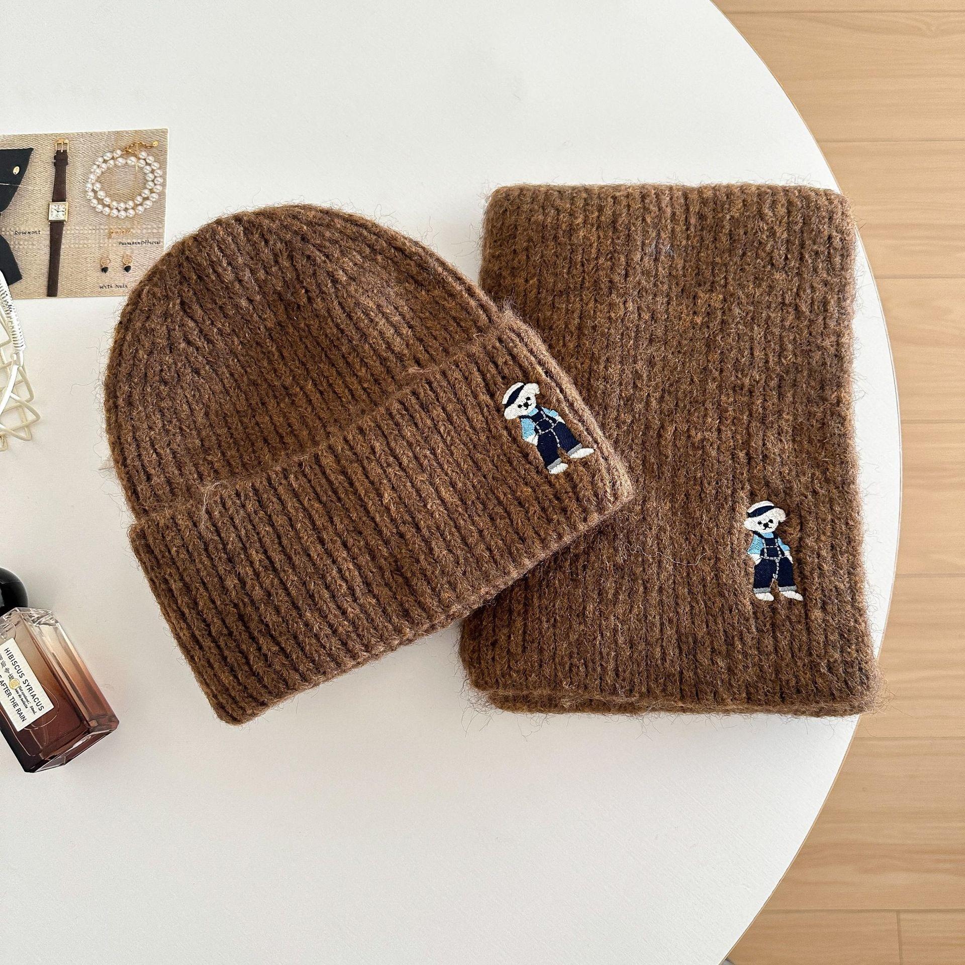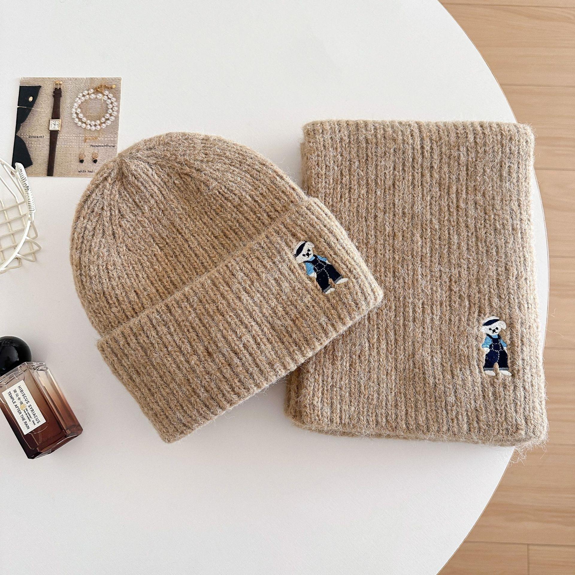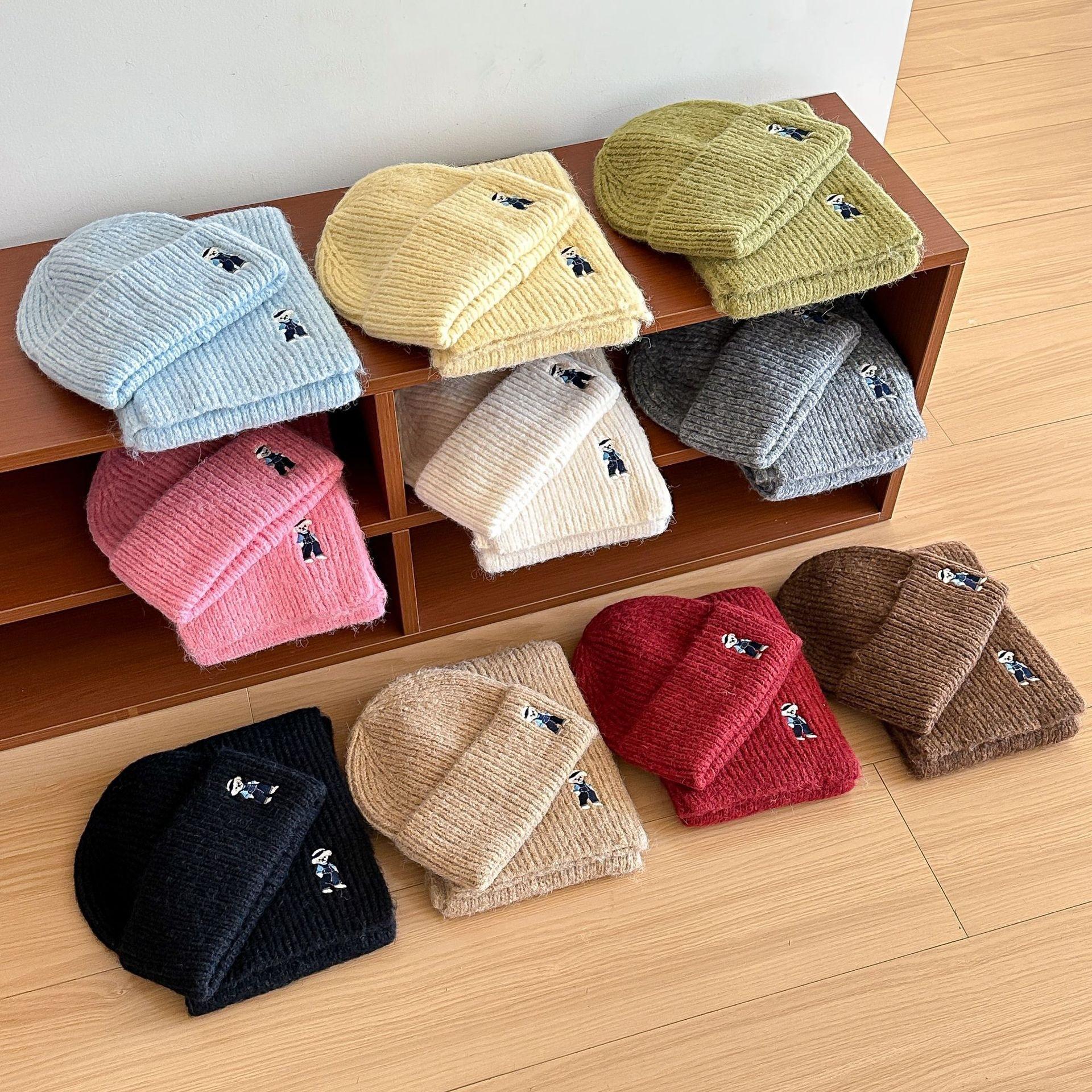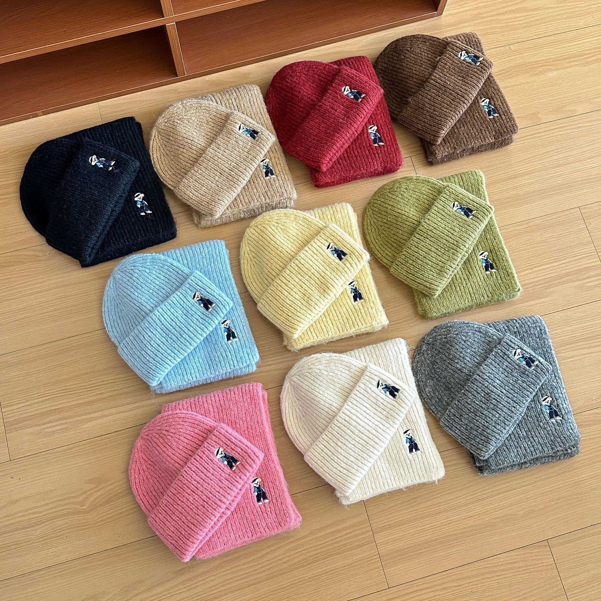 Lindo Bordado de Osito Bufanda Gorro de Punto de Lana para Mujer Otoño Invierno 2025 Nuevo Cálido Estudiante Pareja Calentador de Cuello
