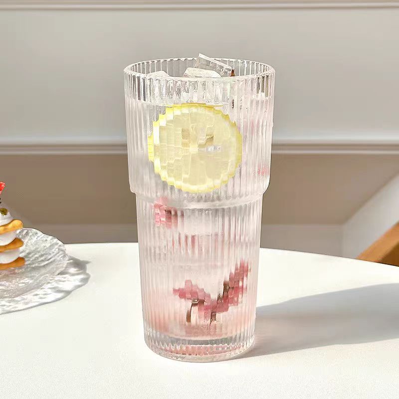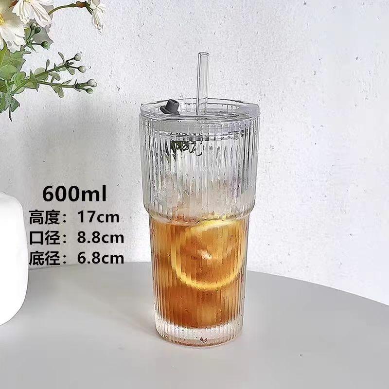 Vaso de Vidrio de Gran Capacidad Alto Valor de Color para Bebidas Frías Vaso para Jugo y Café con Tapa y Pajita Vaso para Agua con Rayas Verticales Estilo Ins