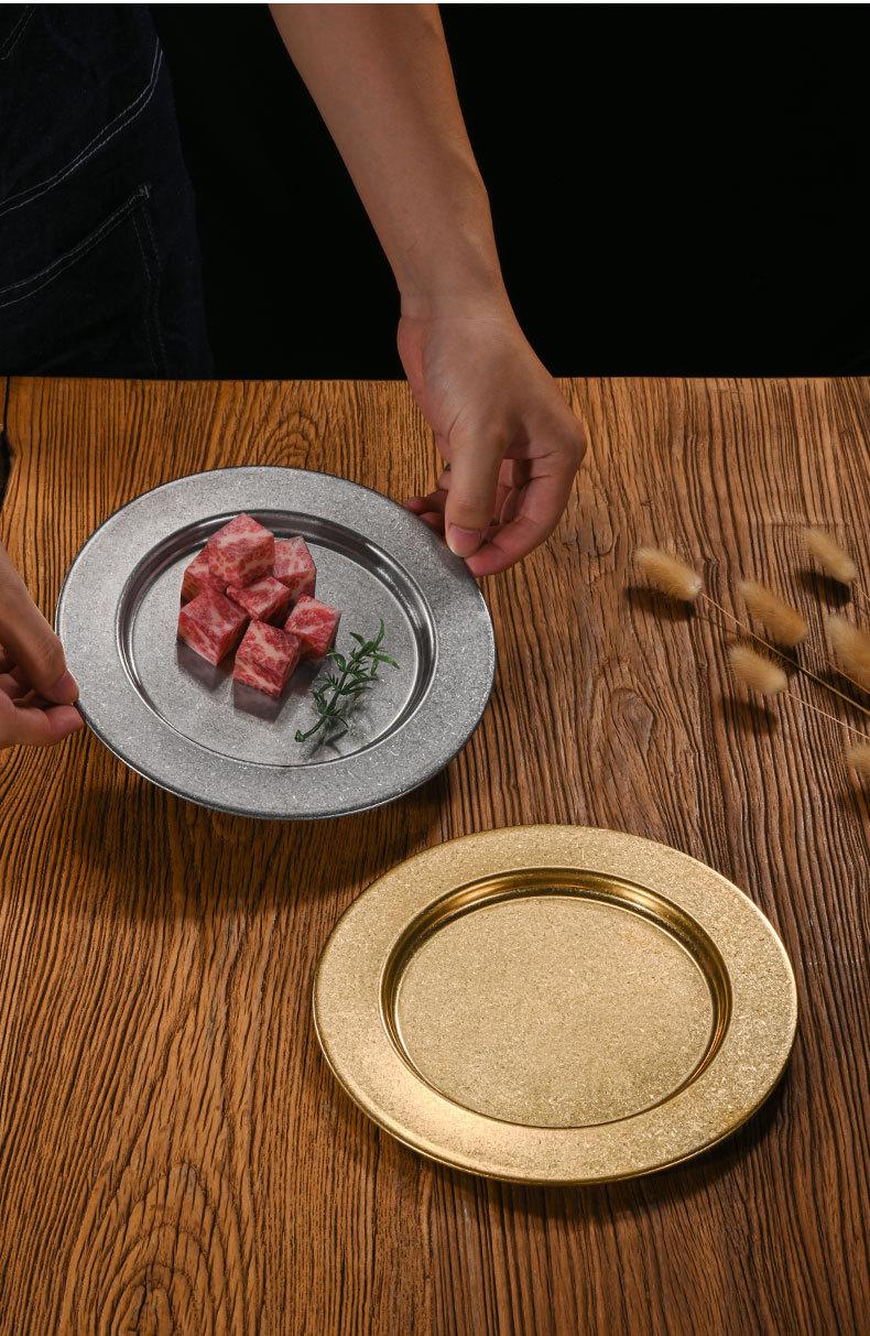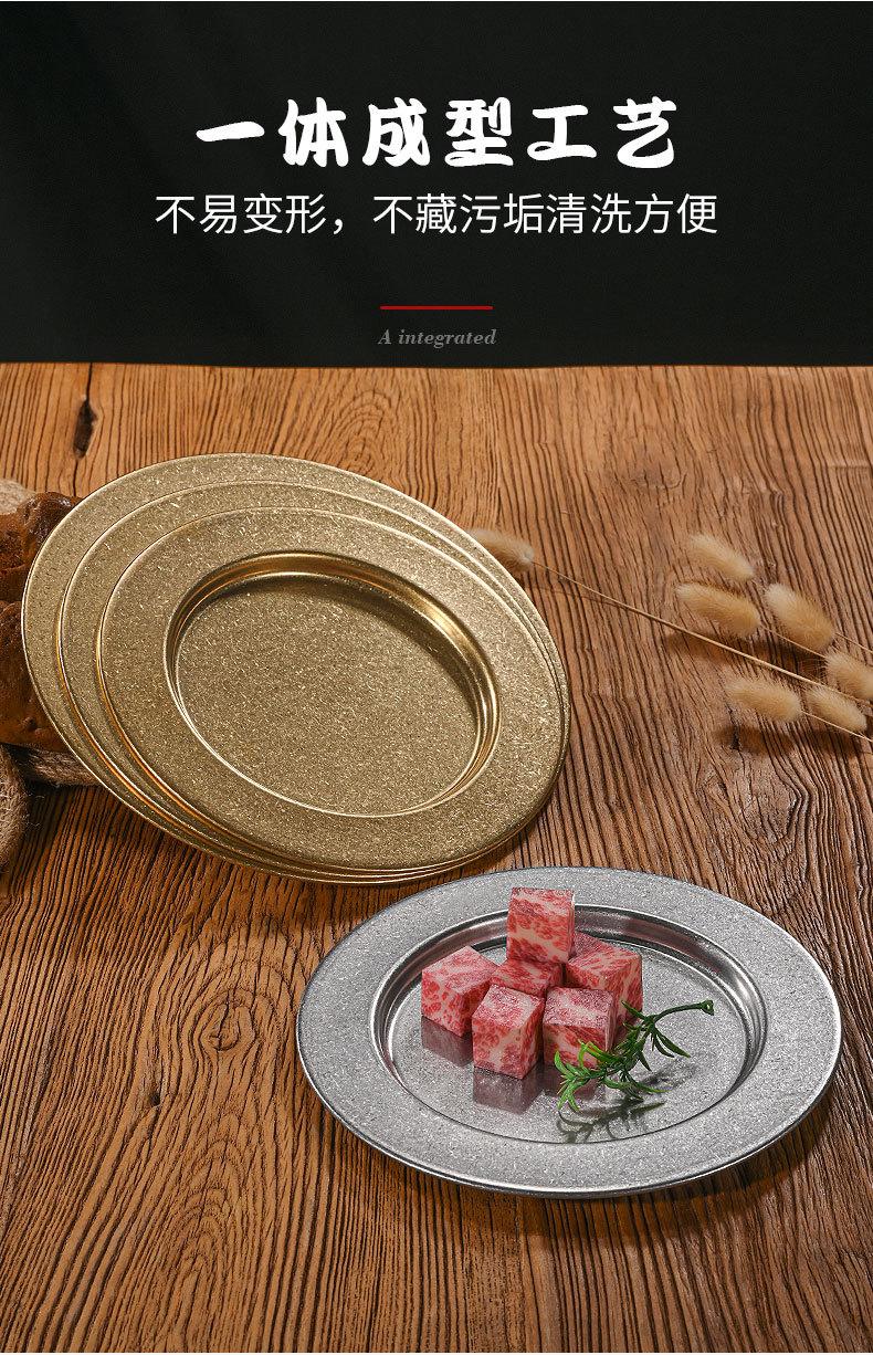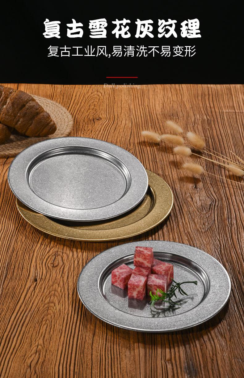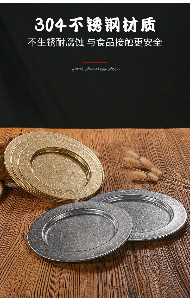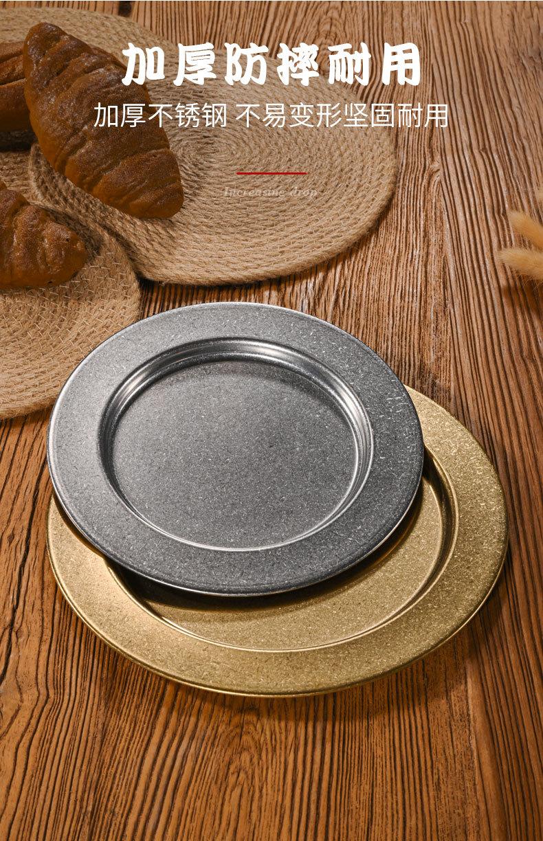La fábrica puede personalizar el logotipo vintage acero inoxidable redondo bandeja de café plato para pastel de postre plato llano plato hondo para comida occidental