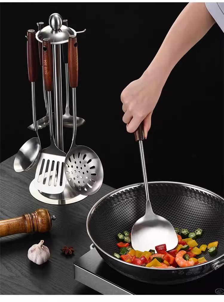 Espátula para Saltear de Acero Inoxidable 304 Engrosado Espátula Wok Espátula para Freír Cucharón Cuchara Ranurada Juego de Utensilios de Cocina para el Hogar Chef