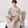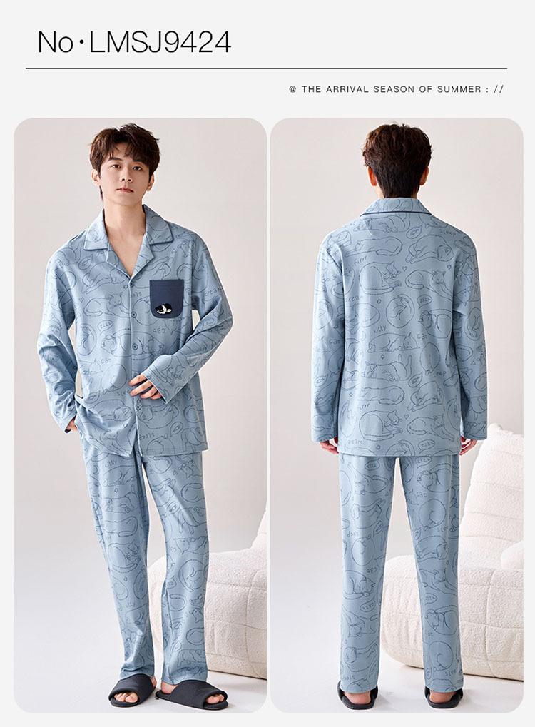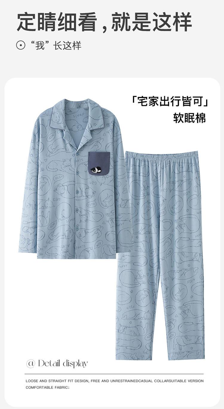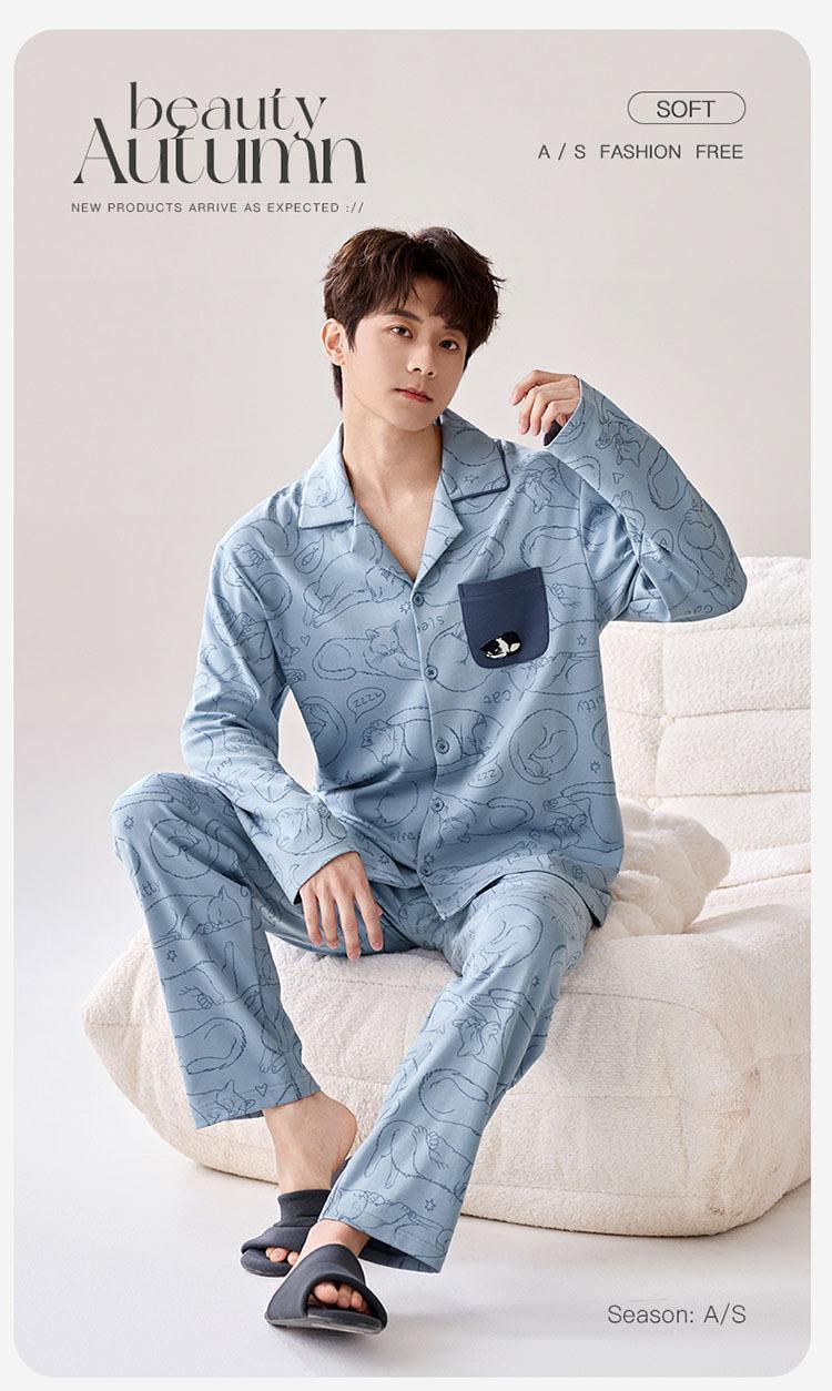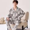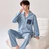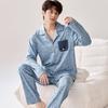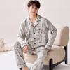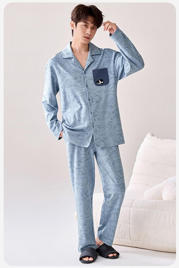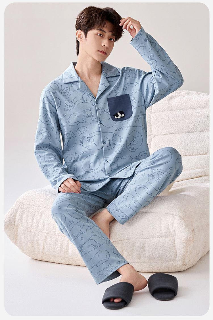 Pijama para Hombre Algodón Puro Primavera y Otoño Manga Larga Solapa Patrón de Dibujos Animados Adolescentes Otoño e Invierno Conjunto Casual para Estar en Casa