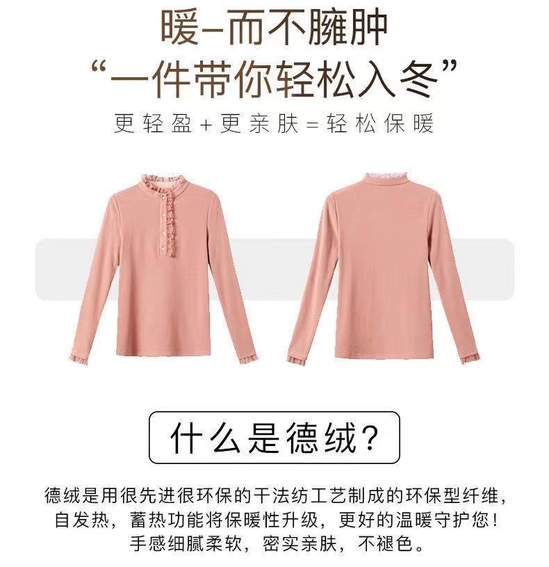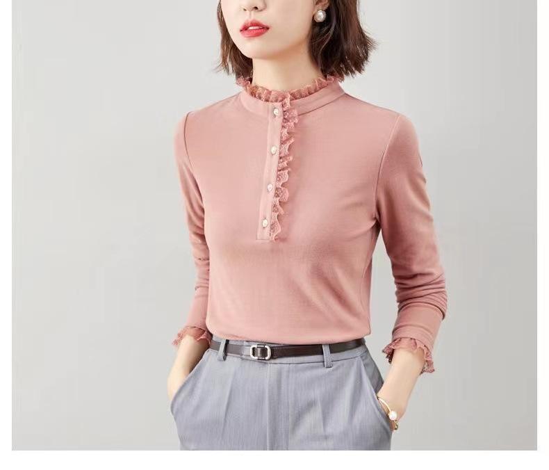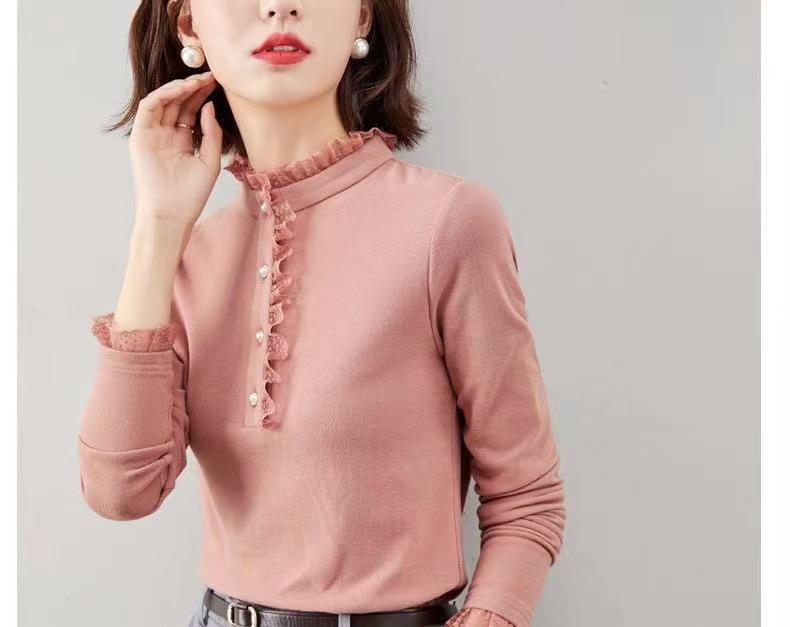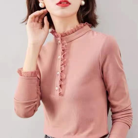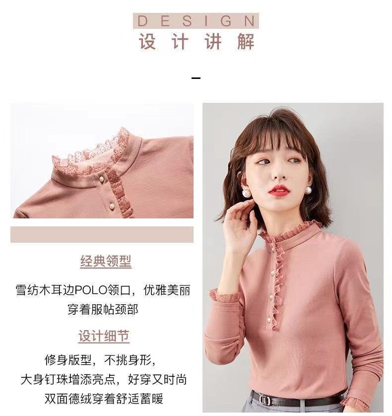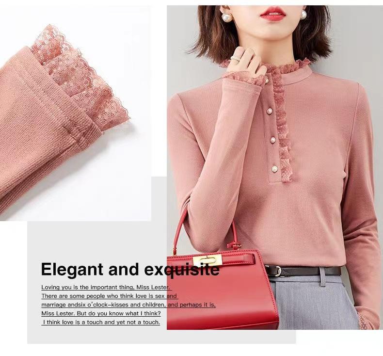 Camiseta Base Térmica Acanalada de Otoño e Invierno para Mujer, Estilo Nuevo con Cuello Alto, Encaje, Cepillada, Gruesa, Top Interior de Manga Larga, Moderna y Elegante