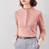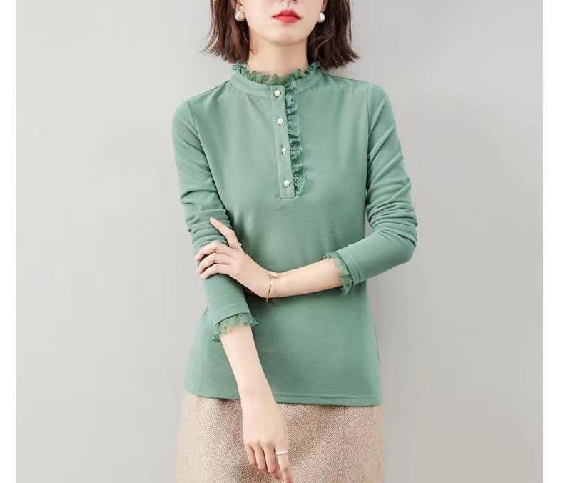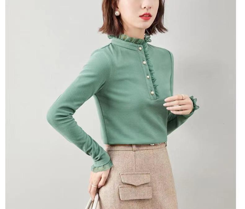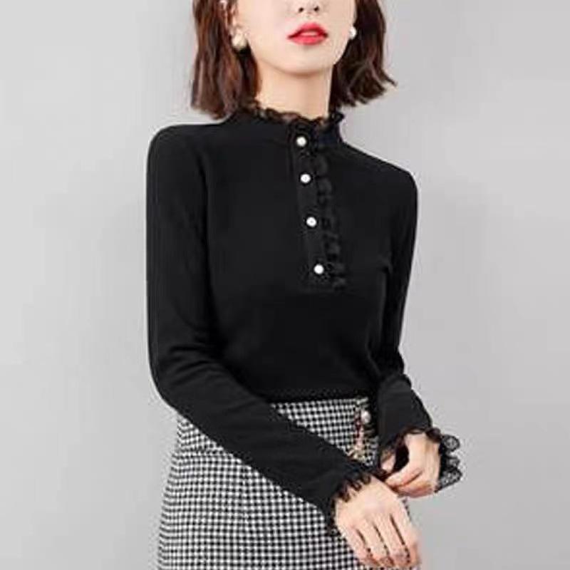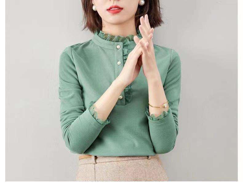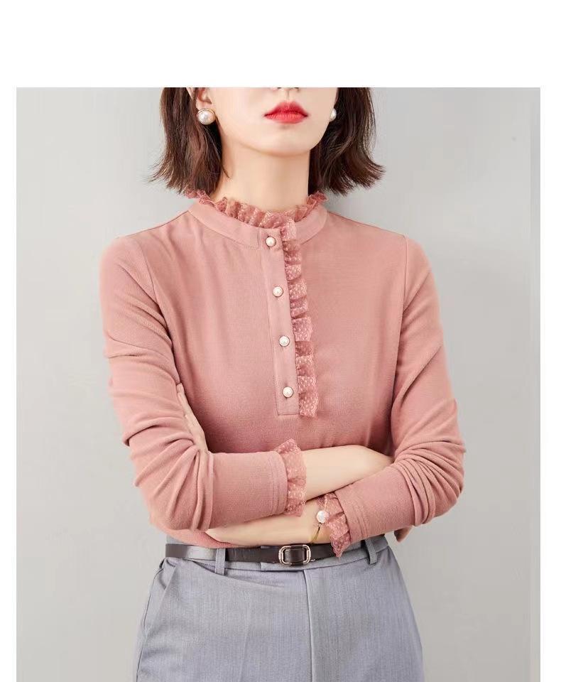 Camiseta Base Térmica Acanalada de Otoño e Invierno para Mujer, Estilo Nuevo con Cuello Alto, Encaje, Cepillada, Gruesa, Top Interior de Manga Larga, Moderna y Elegante