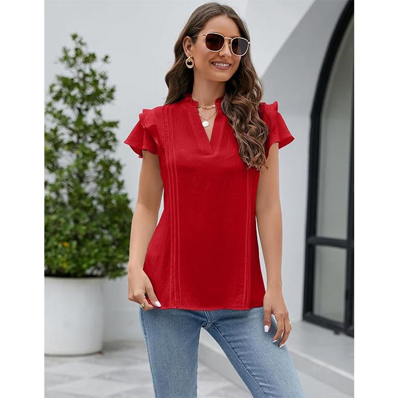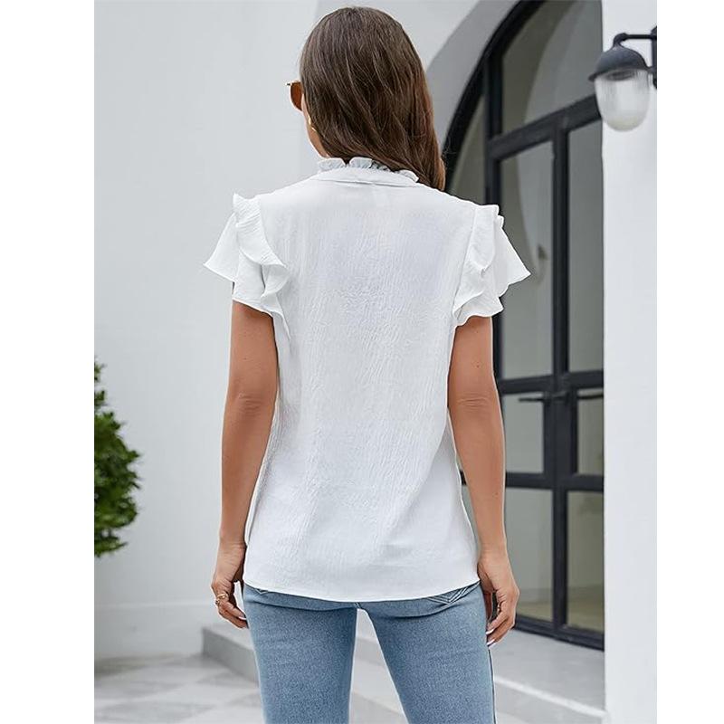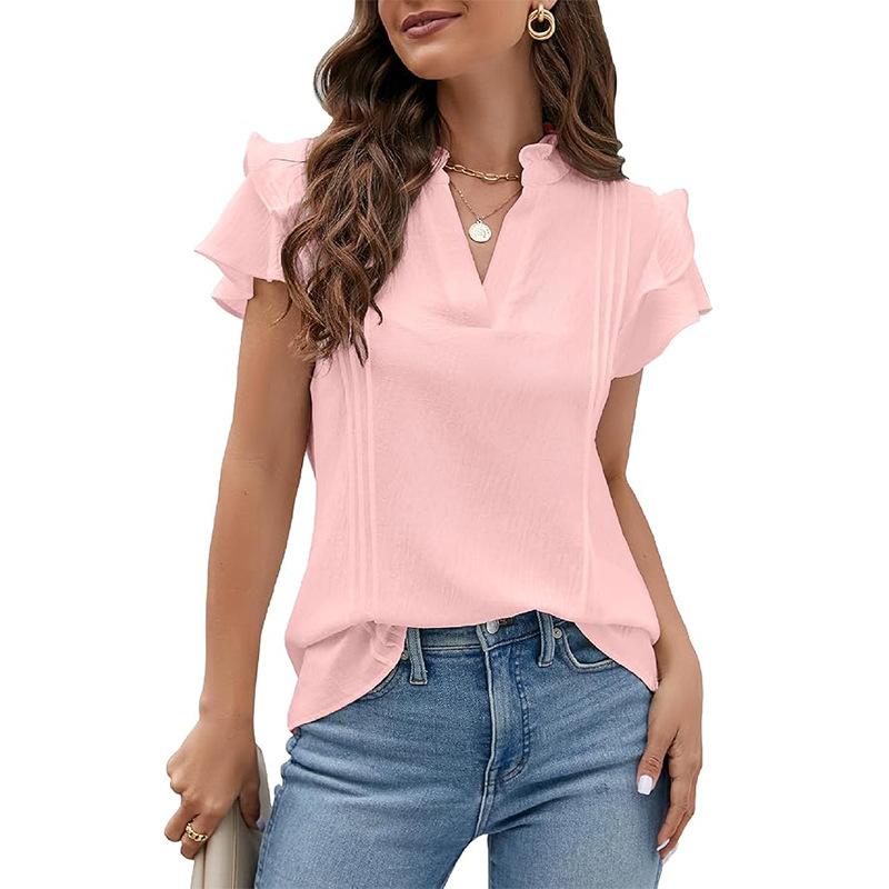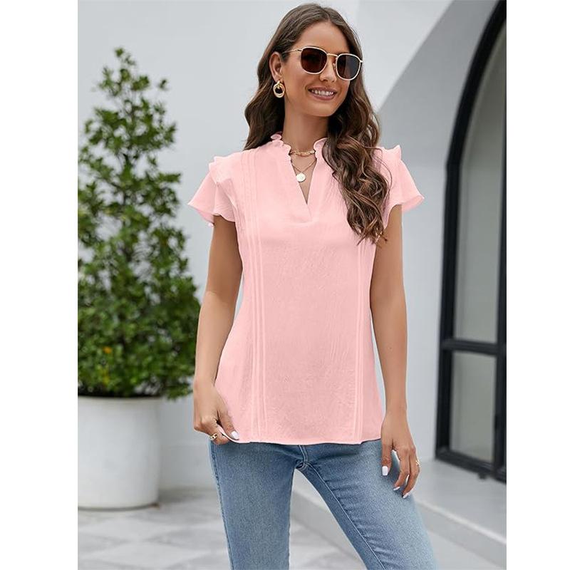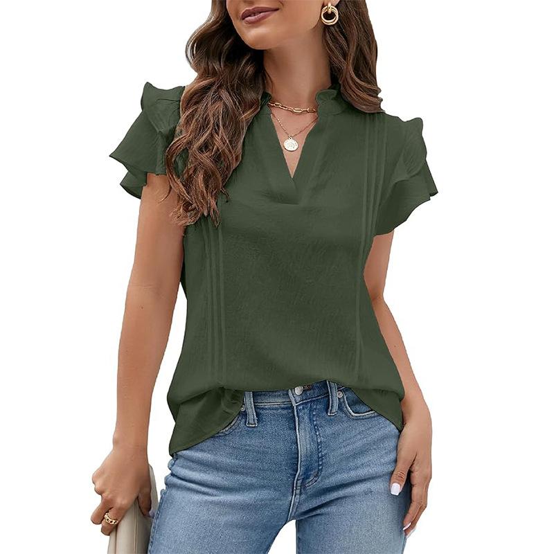 Amazon Estilo Europeo y Americano Elegantes Tops Casuales Camisas de Manga Corta con Volantes Cuello en V Camisas Elegantes para el Trabajo