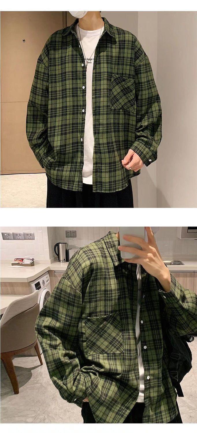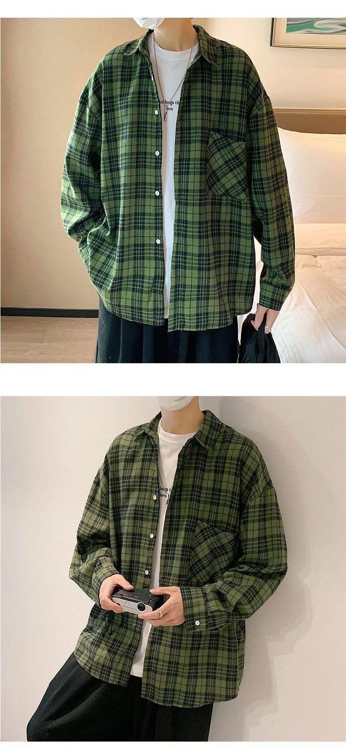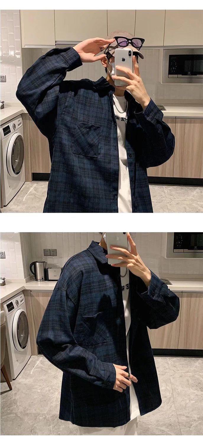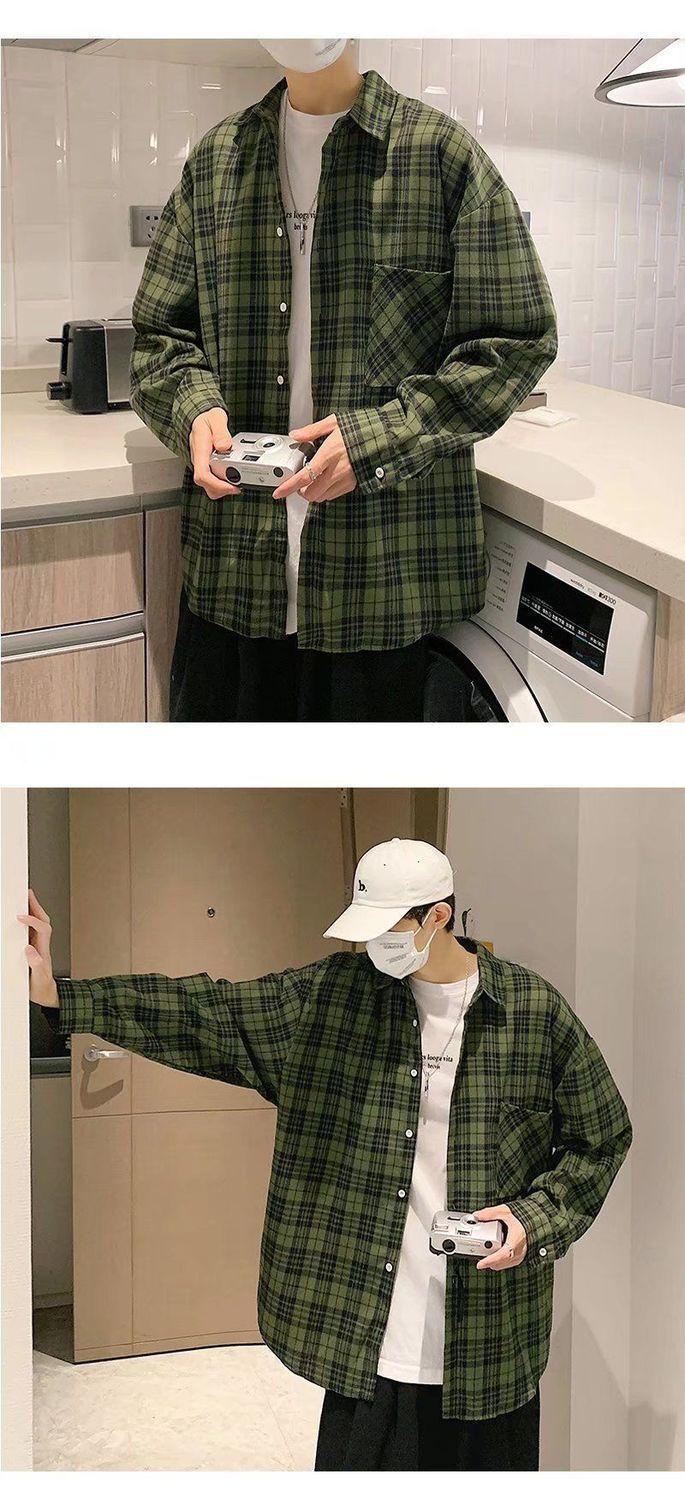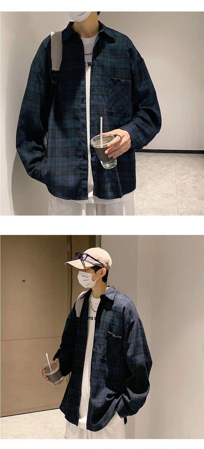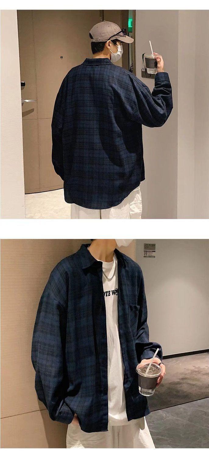 Camisa de Cuadros de Manga Larga para Hombre Primavera y Otoño Estilo Coreano a la Moda Camisa Holgada Trendy Estilo Hong Kong Guapo Casual Top Chaqueta de Estudiante