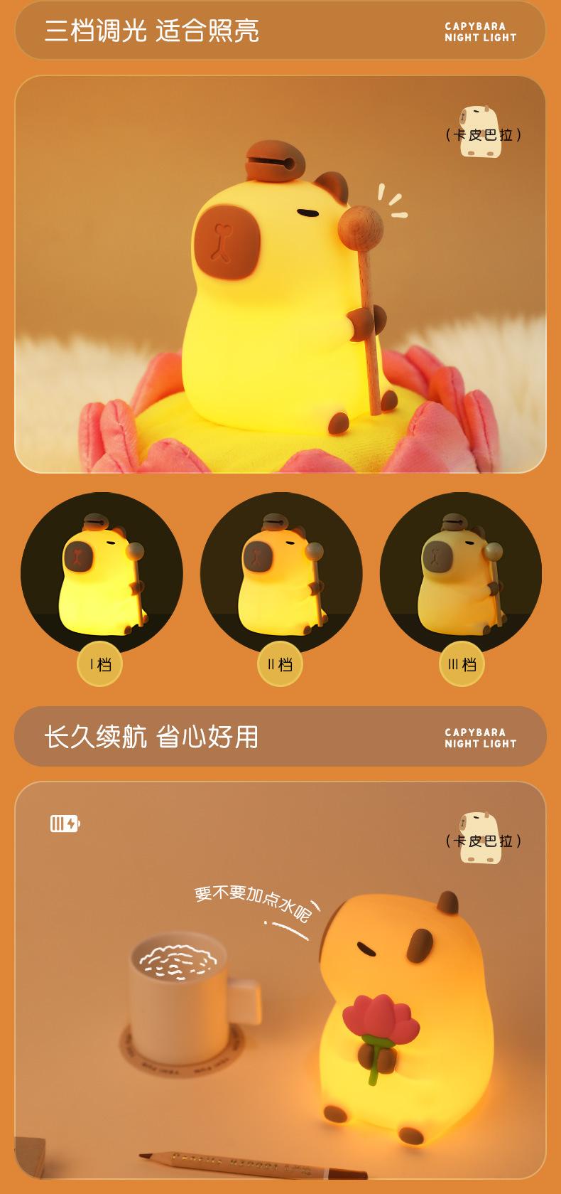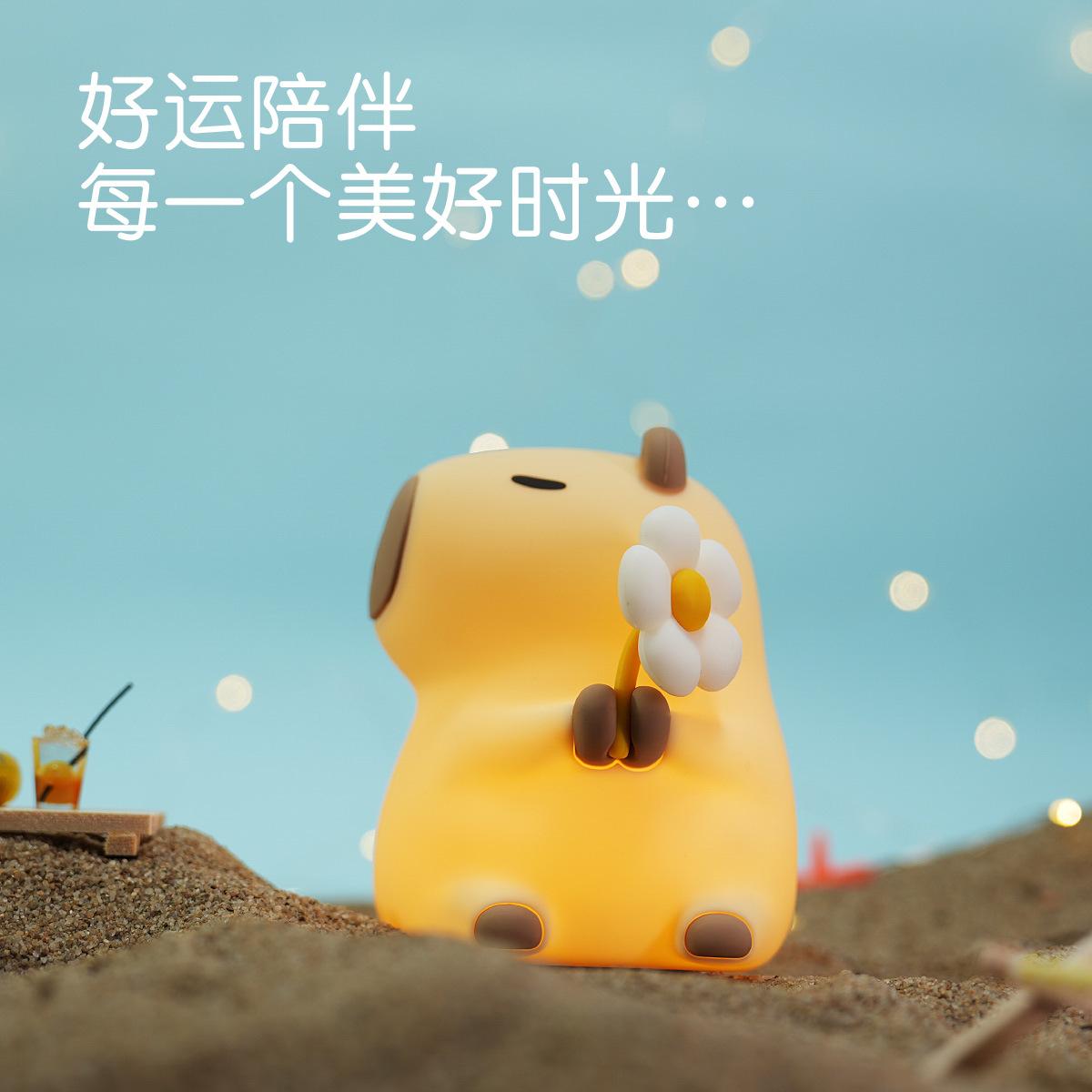 Kapibala's wooden fish on his head pats the lamp, Kapibala holds a small flower and pats the lamp