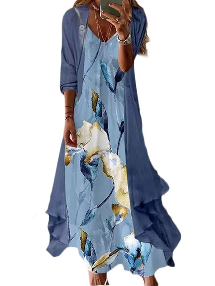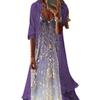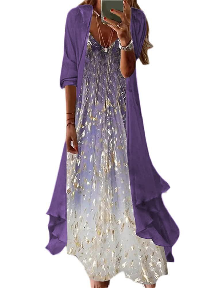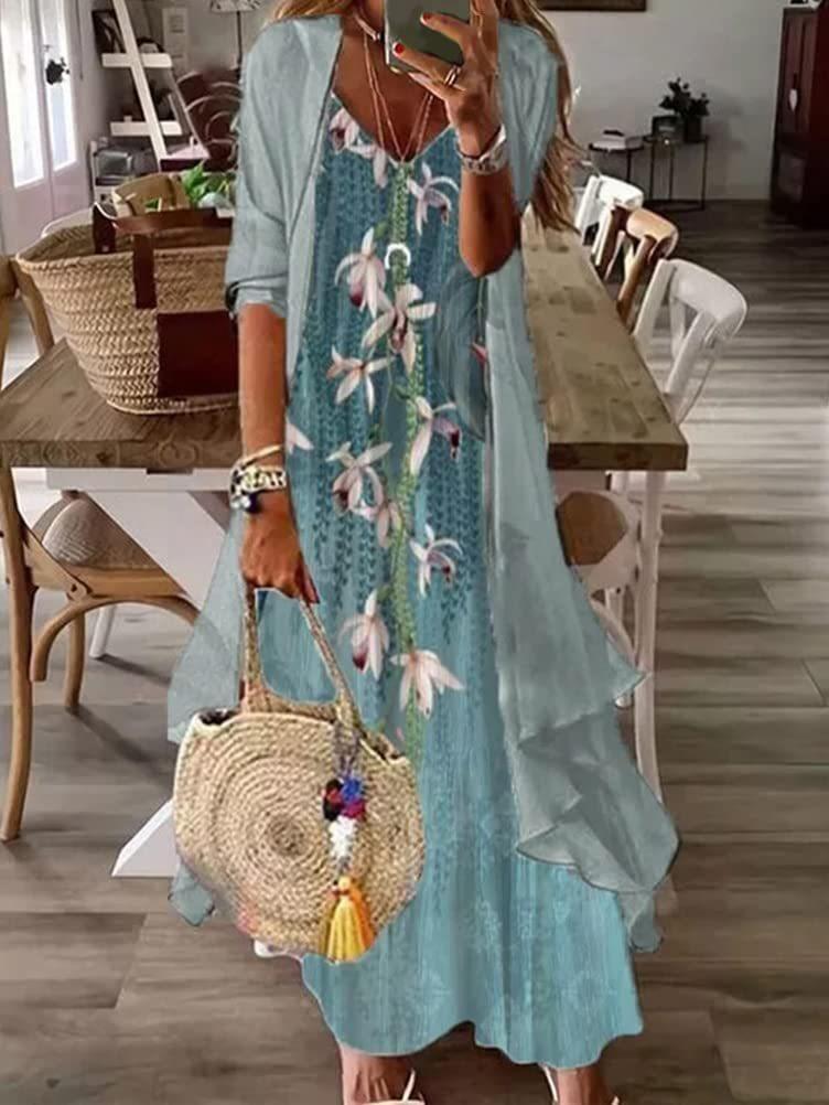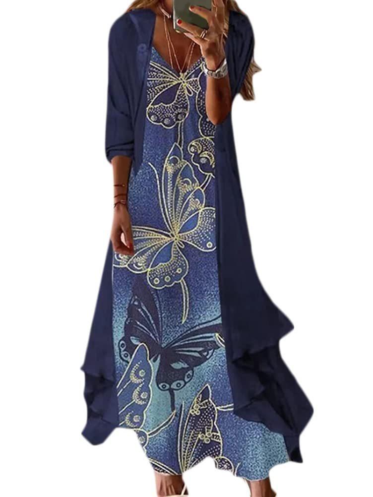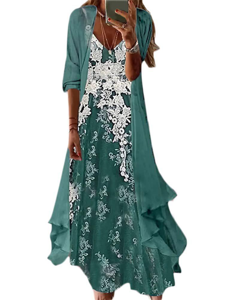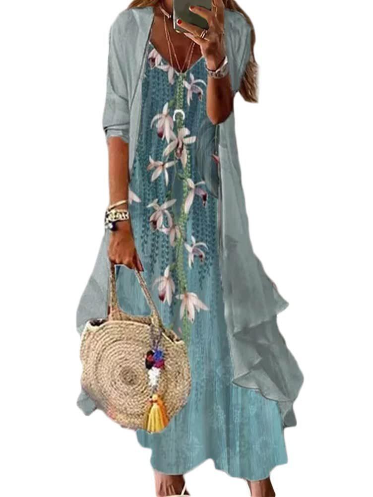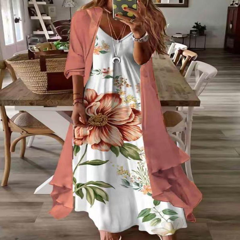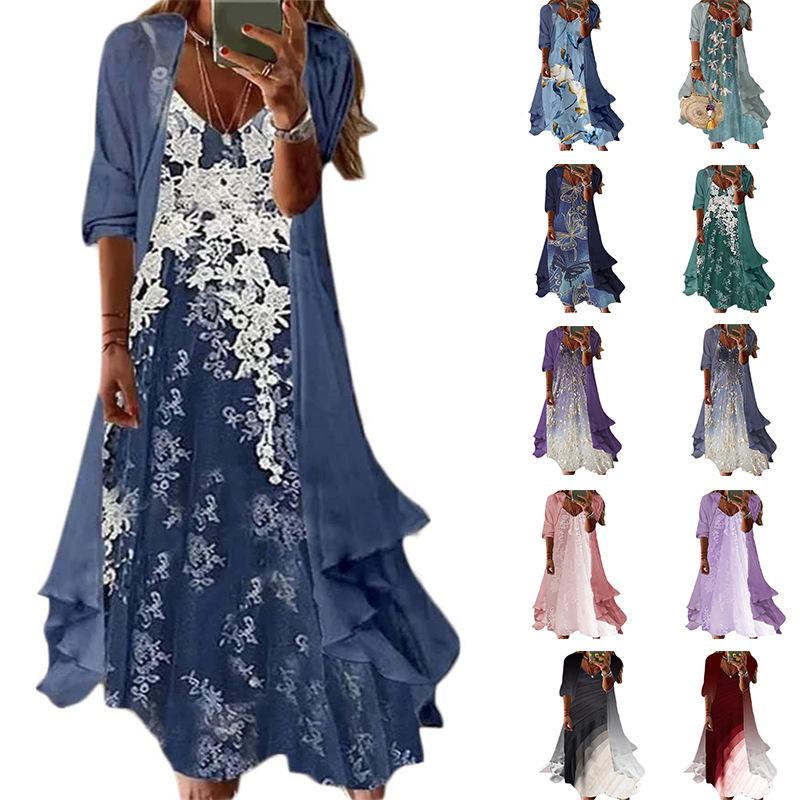 Transfronterizo 2022 Nuevo Verano Europeo y Americano para Mujer Estampado Vacacional Tirantes Falda Larga Camisa Exterior Vestido de dos piezas Mujer