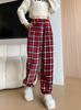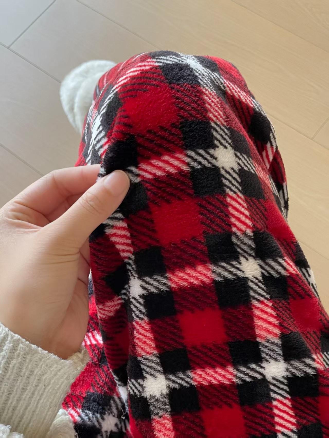 Red plaid pants [with pockets], Black and white striped pants [with pockets], Gray and white pants [with pocke...