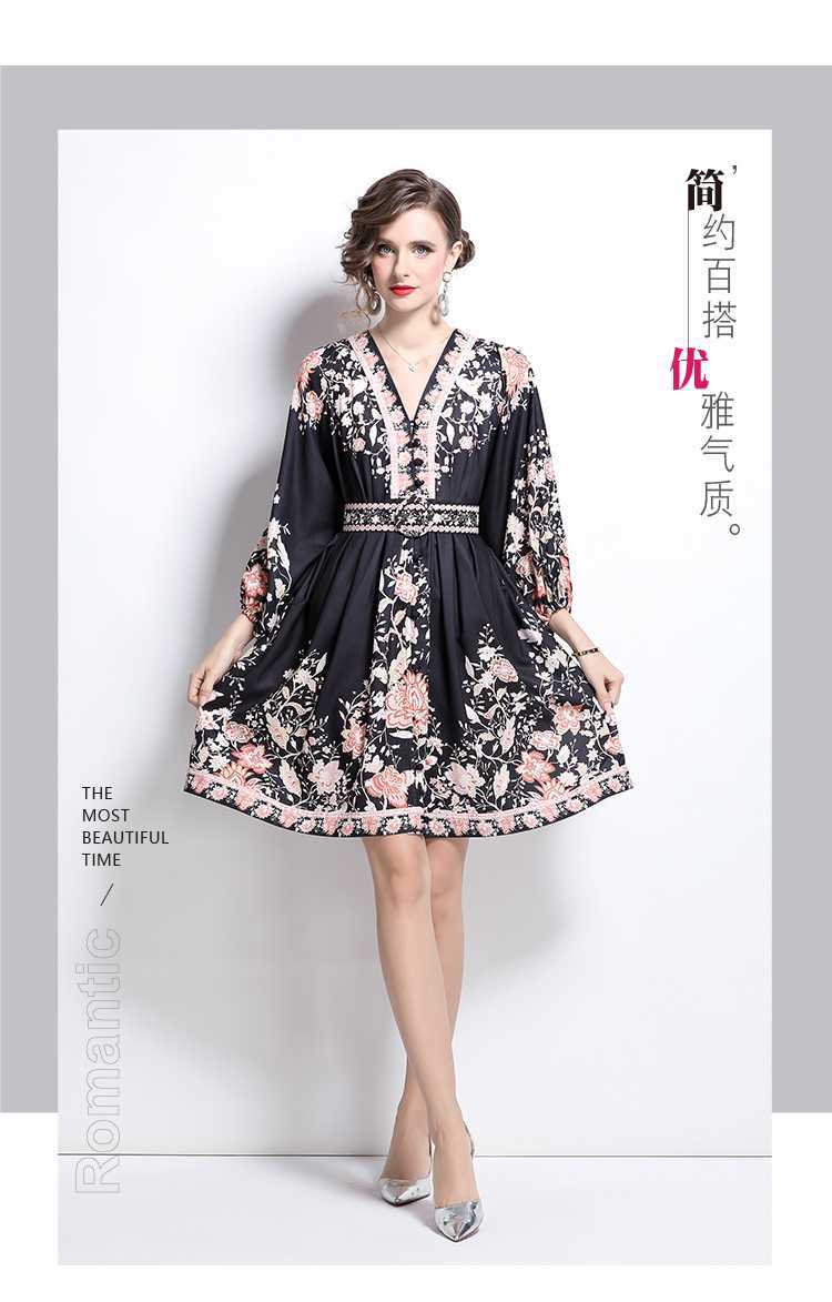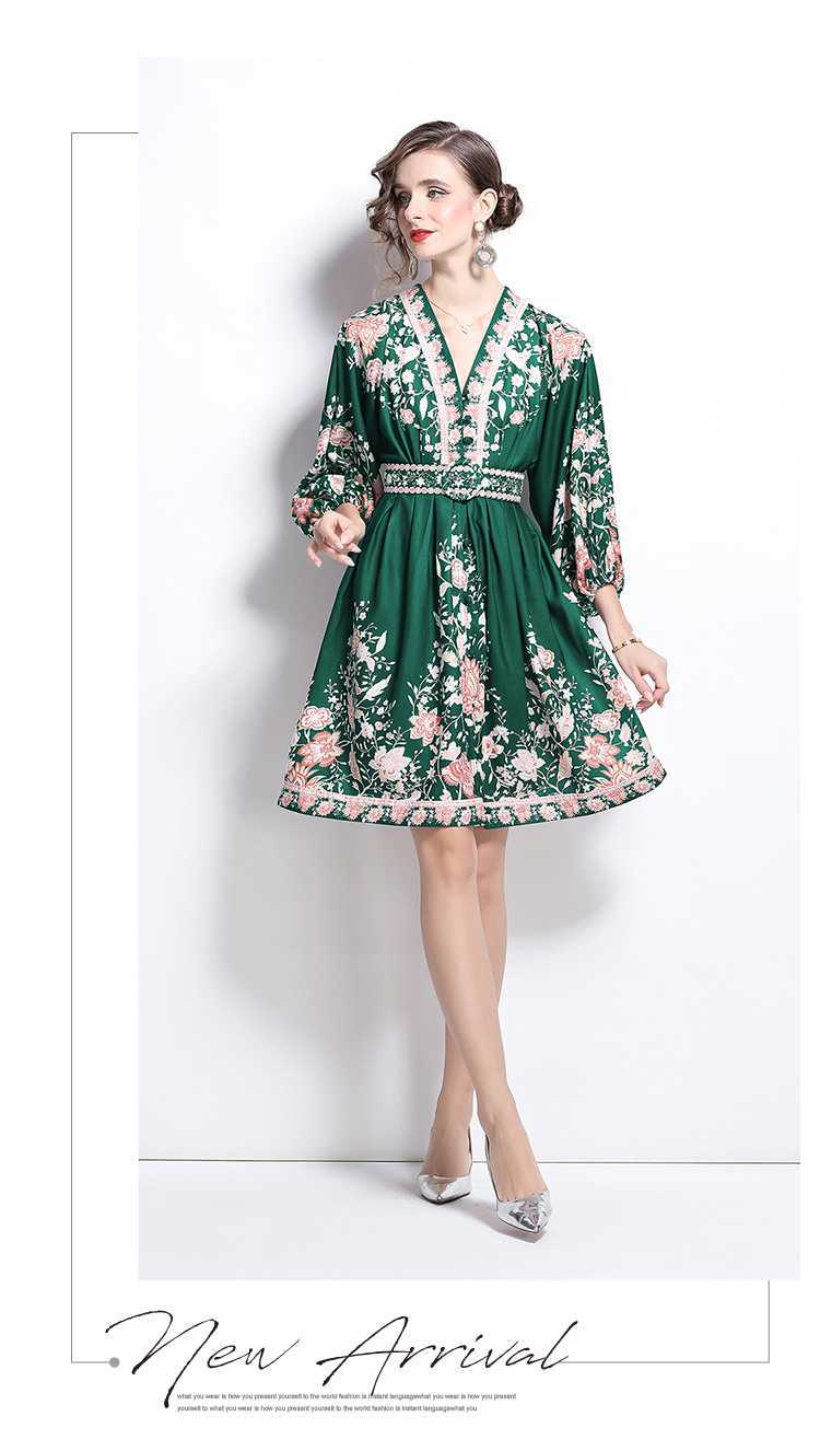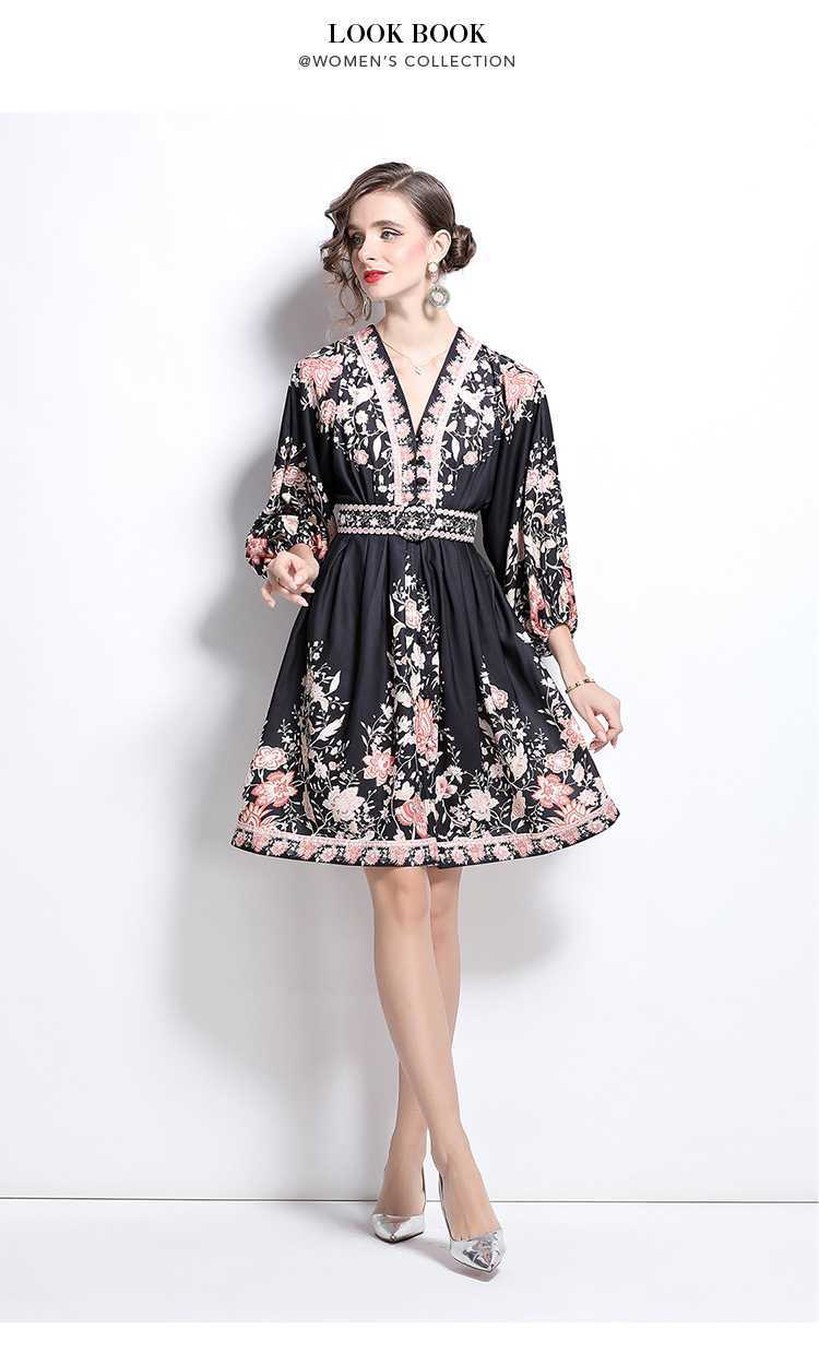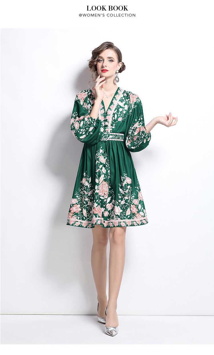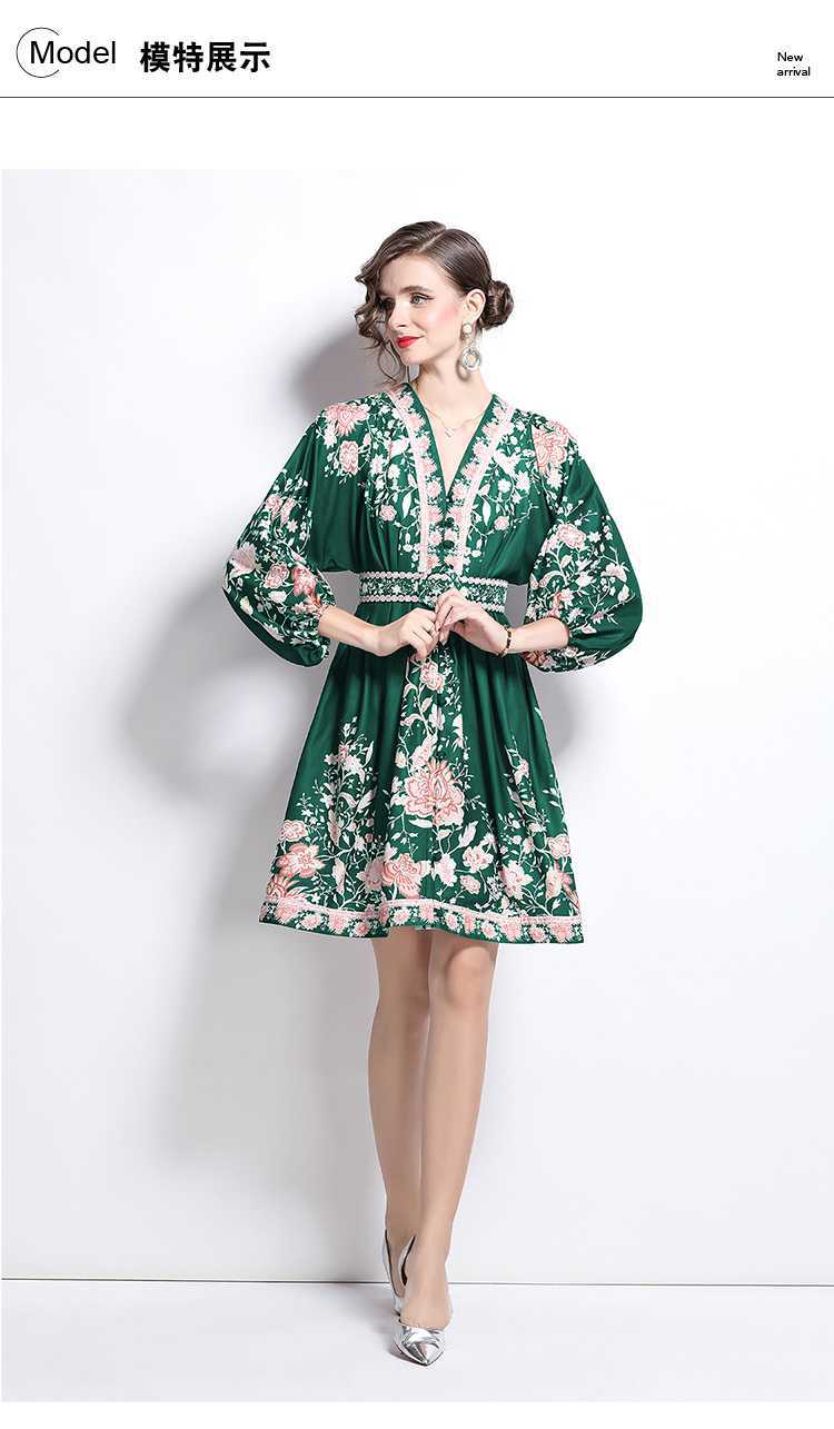 Foto Real en Stock - Estilo Palacio Retro Posicionamiento Estampado Manga Linterna Cuello V Cintura Adelgazante Look Vestido de un Solo Botón