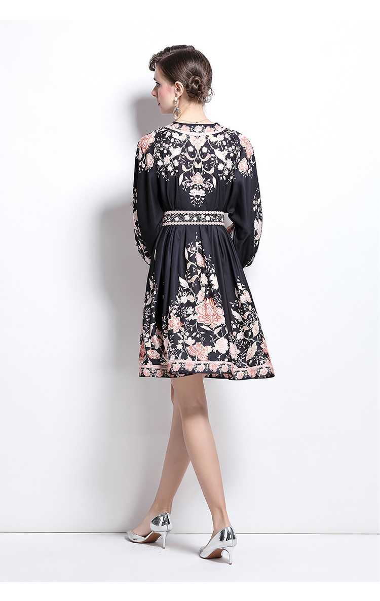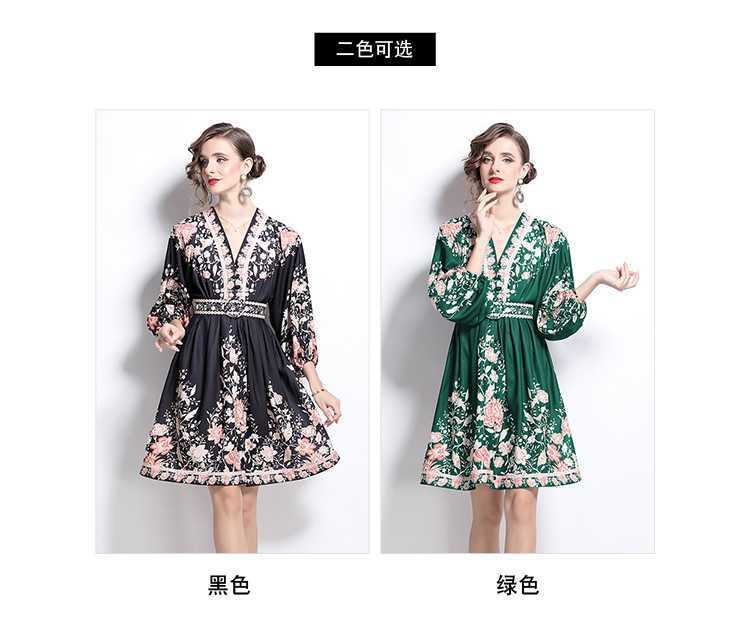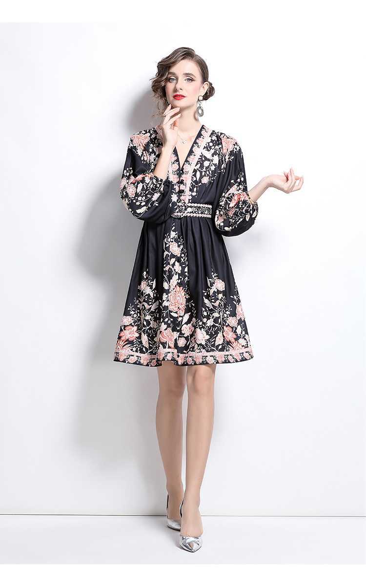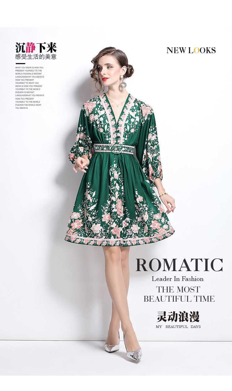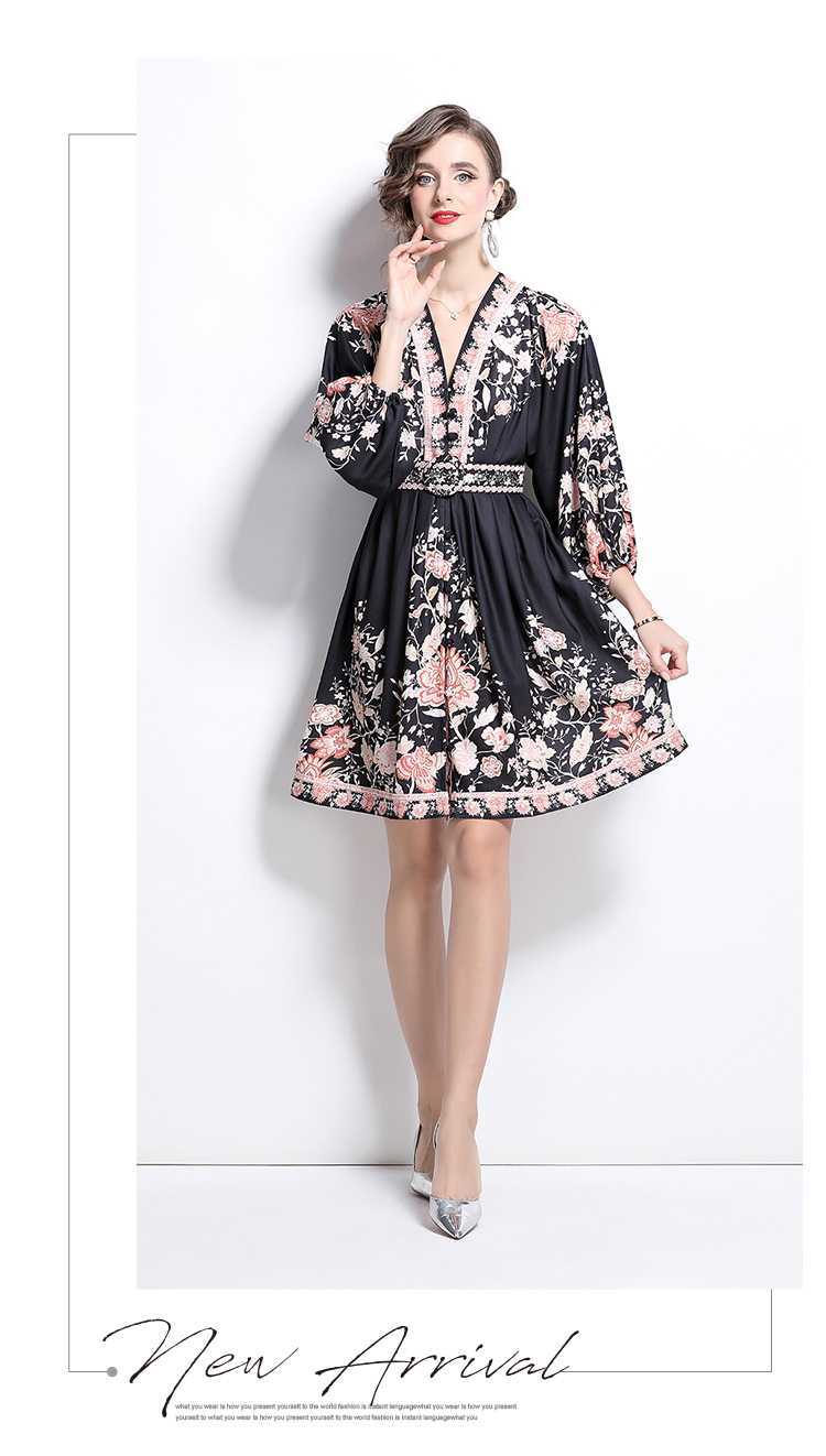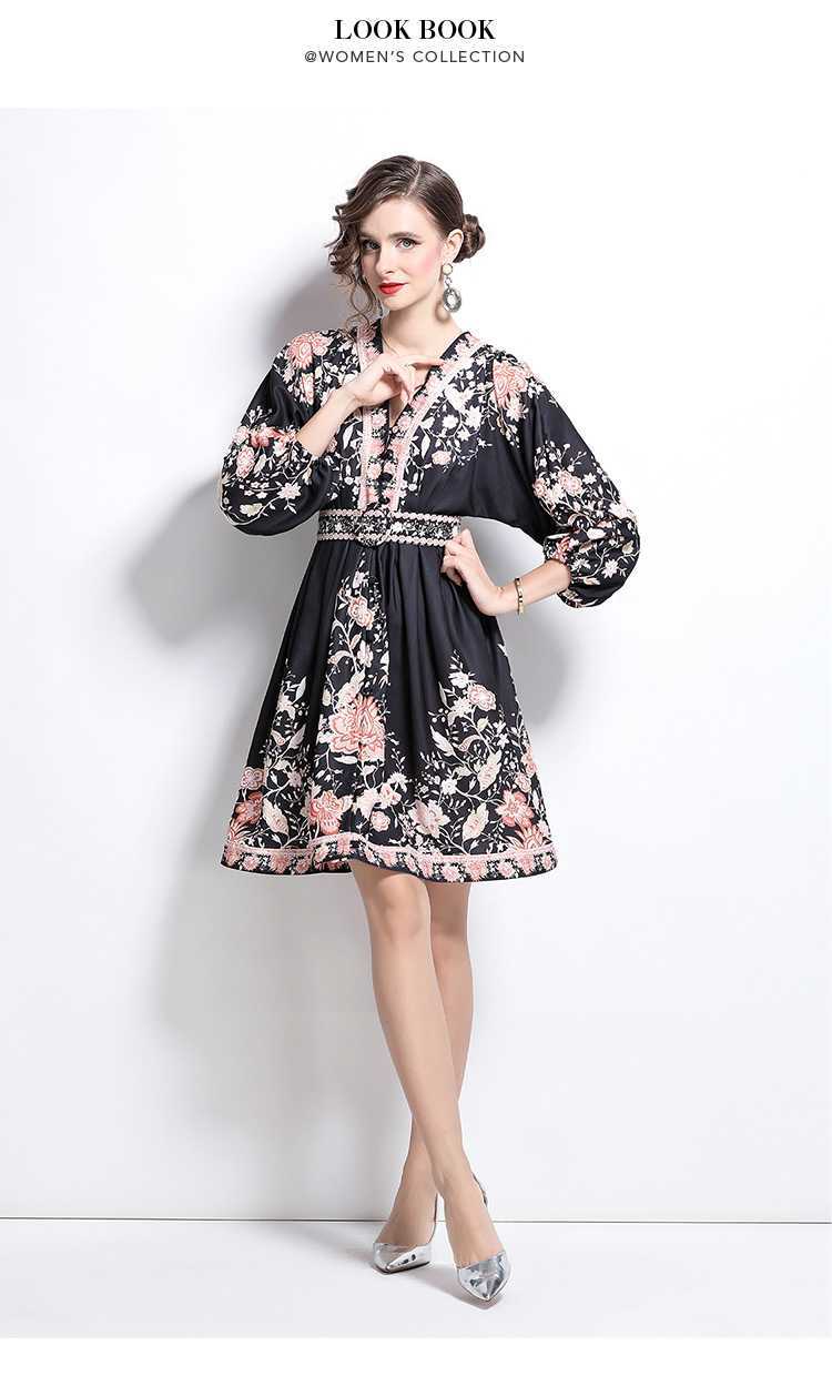 Foto Real en Stock - Estilo Palacio Retro Posicionamiento Estampado Manga Linterna Cuello V Cintura Adelgazante Look Vestido de un Solo Botón