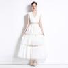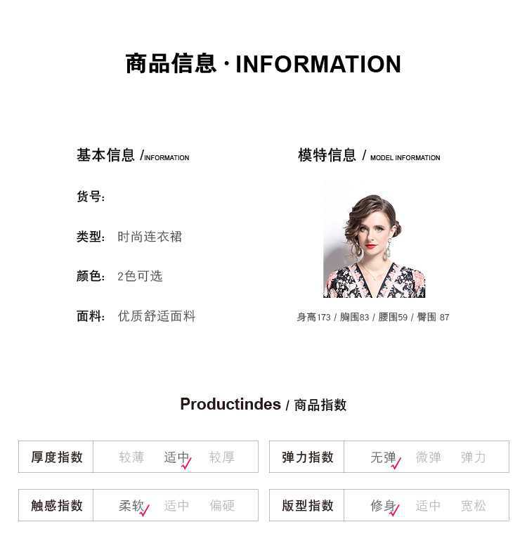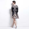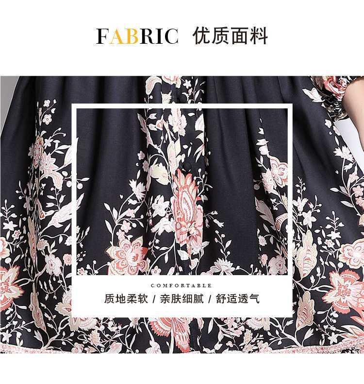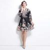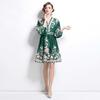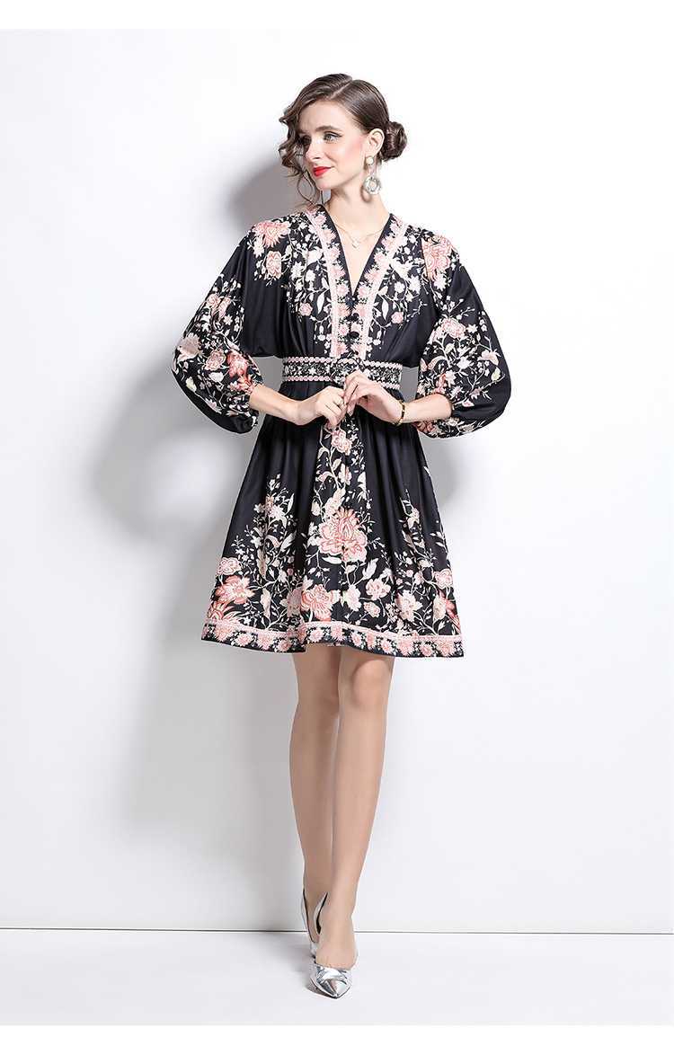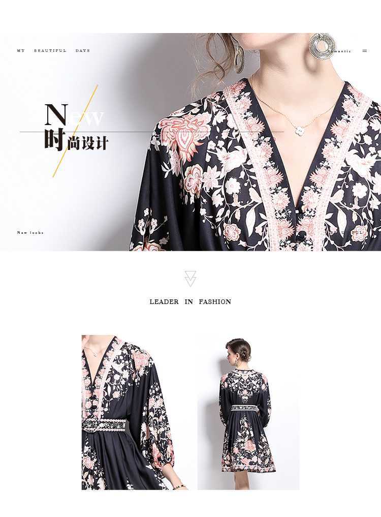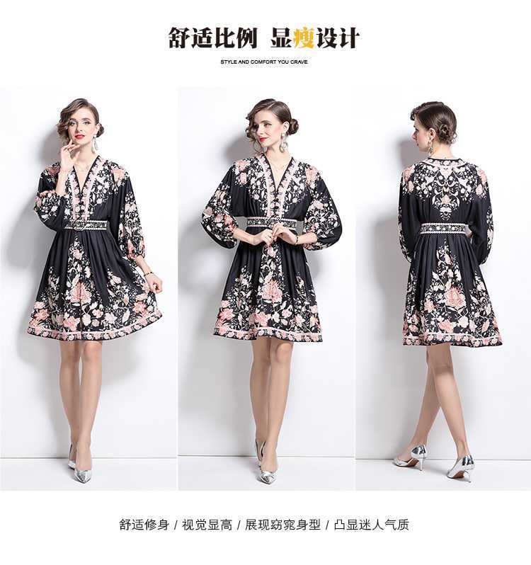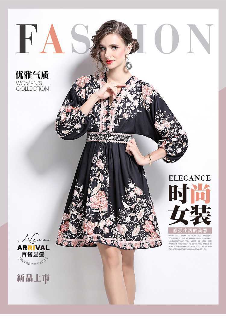 Foto Real en Stock - Estilo Palacio Retro Posicionamiento Estampado Manga Linterna Cuello V Cintura Adelgazante Look Vestido de un Solo Botón