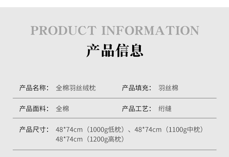 48*74cm (1000g low pillow), 48*74cm (1100g medium pillow), 48*74cm (1200g high pillow)