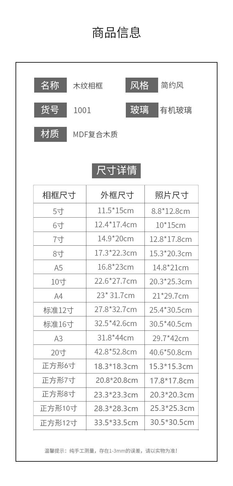 5 inches (photo 8.8*12.8cm) can be placed or hung Black wood grain (horizontal and vertical)
