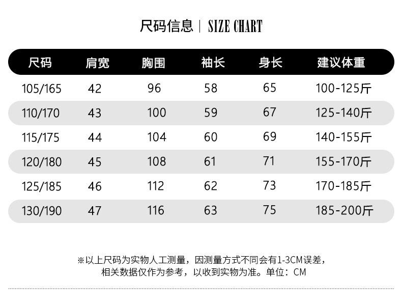 165/M, 170/L, 175/XL, 180/2XL, 185/3XL, 190/4XL