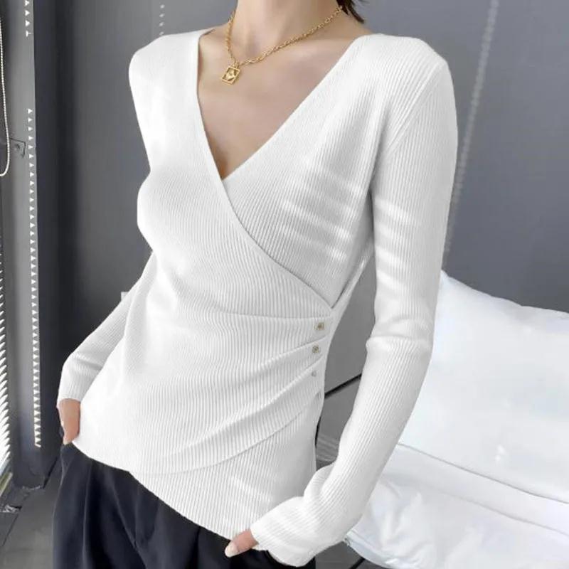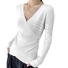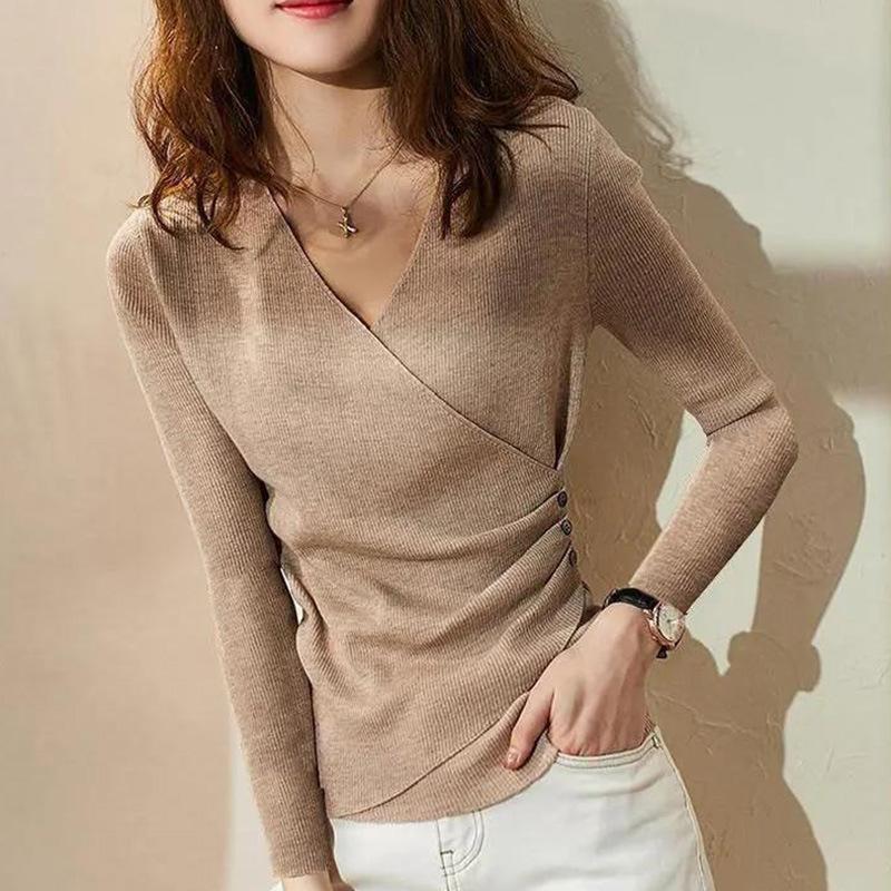 Nueva Moda Camiseta Básica de Punto de Cuello en V y Corte Entallado para Mujer, Diseño Primavera 2025 con Suéter de Botonadura Cruzada