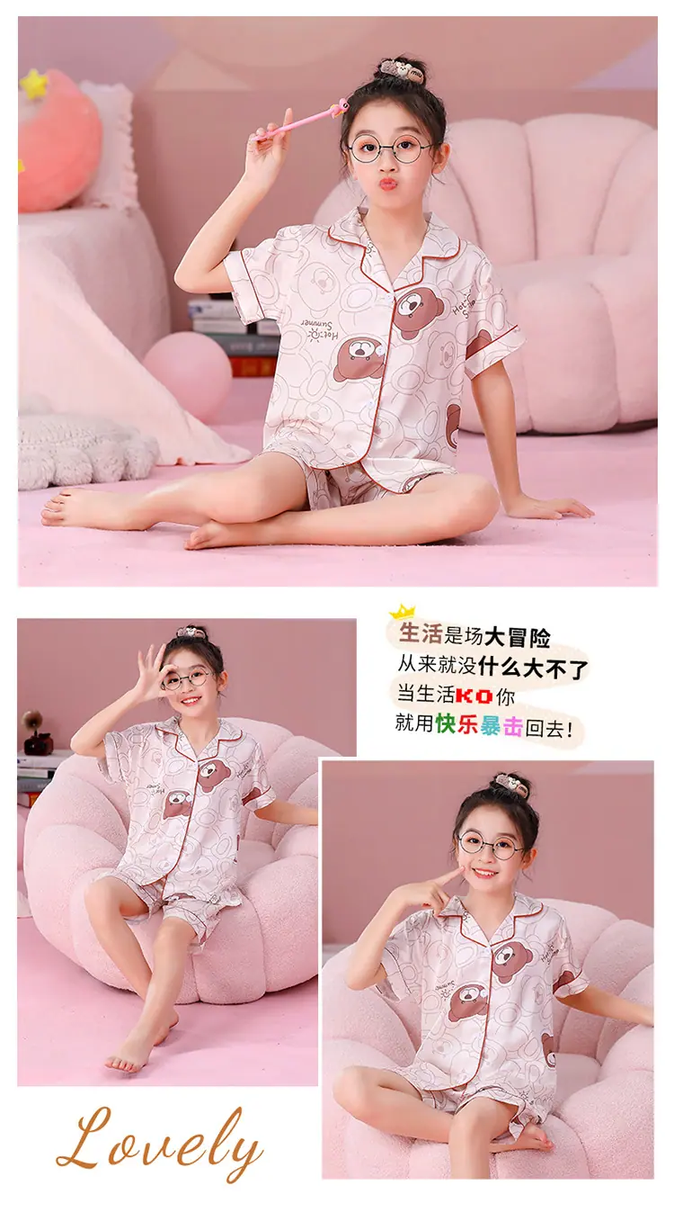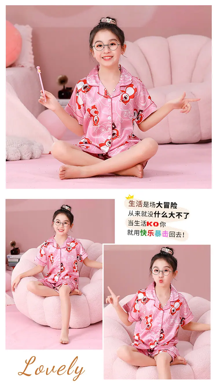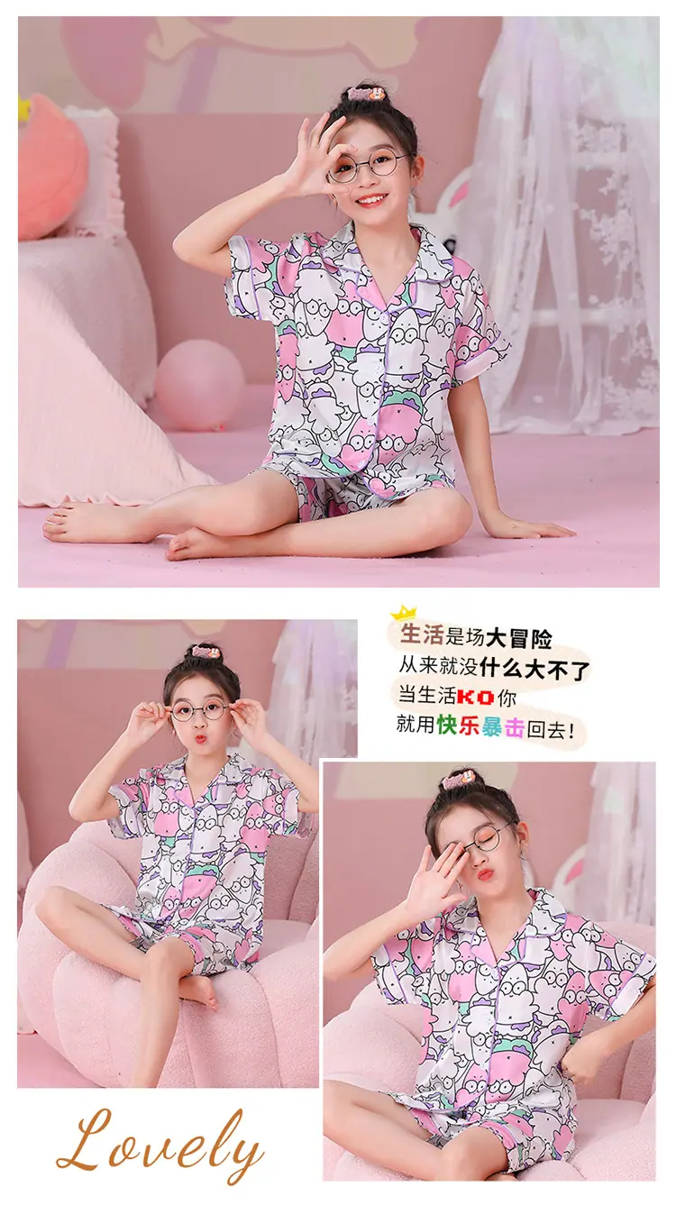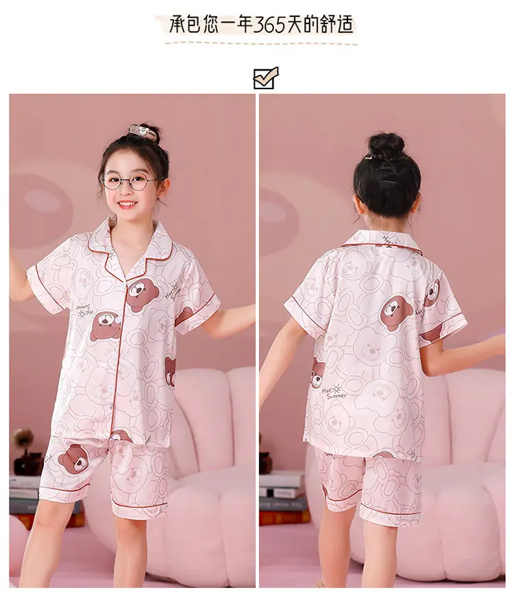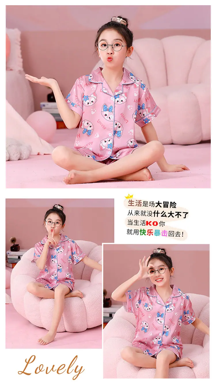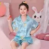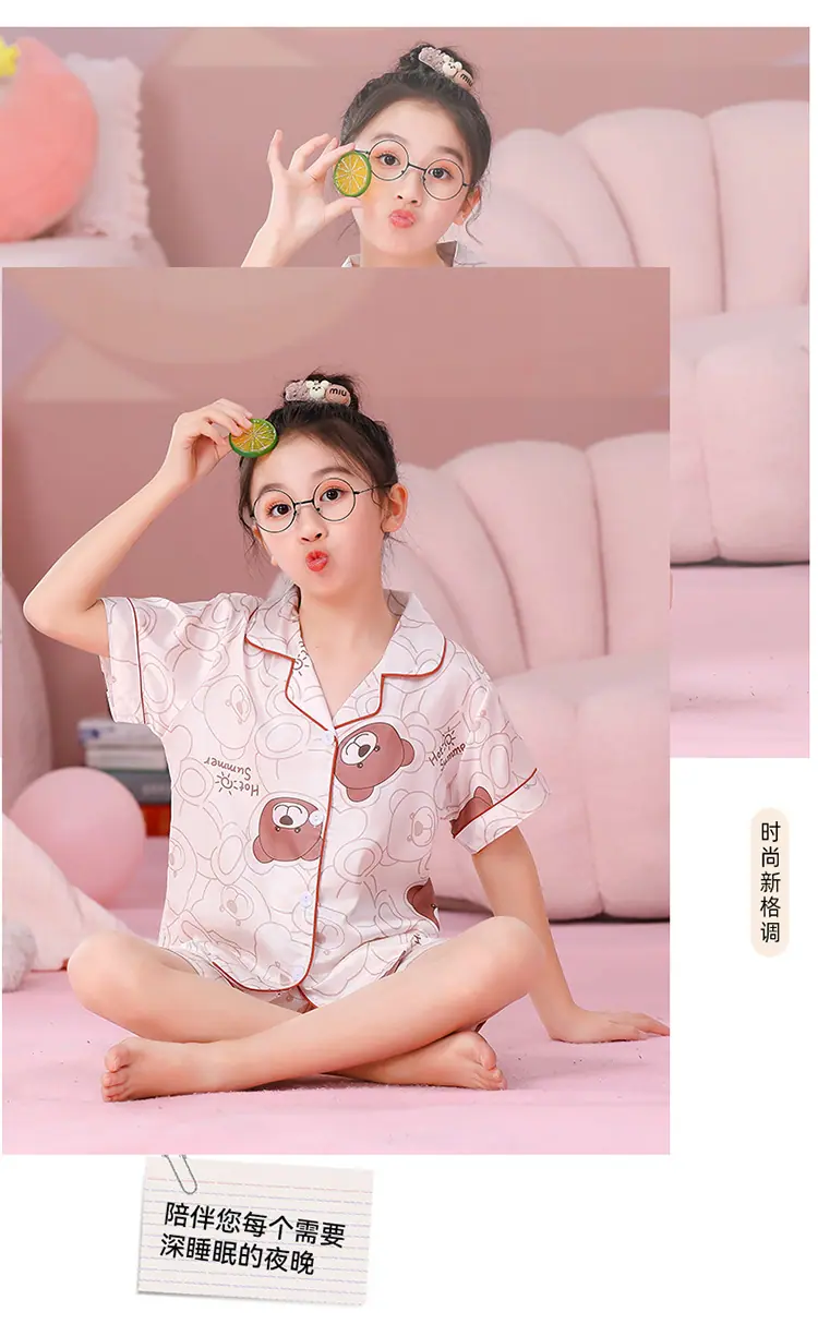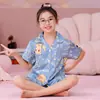Pijama de verano nuevo para niños de manga corta de seda de hielo para niñas, ropa de aire acondicionado, traje de uso en casa con solapa de dibujos animados para niña pequeña
