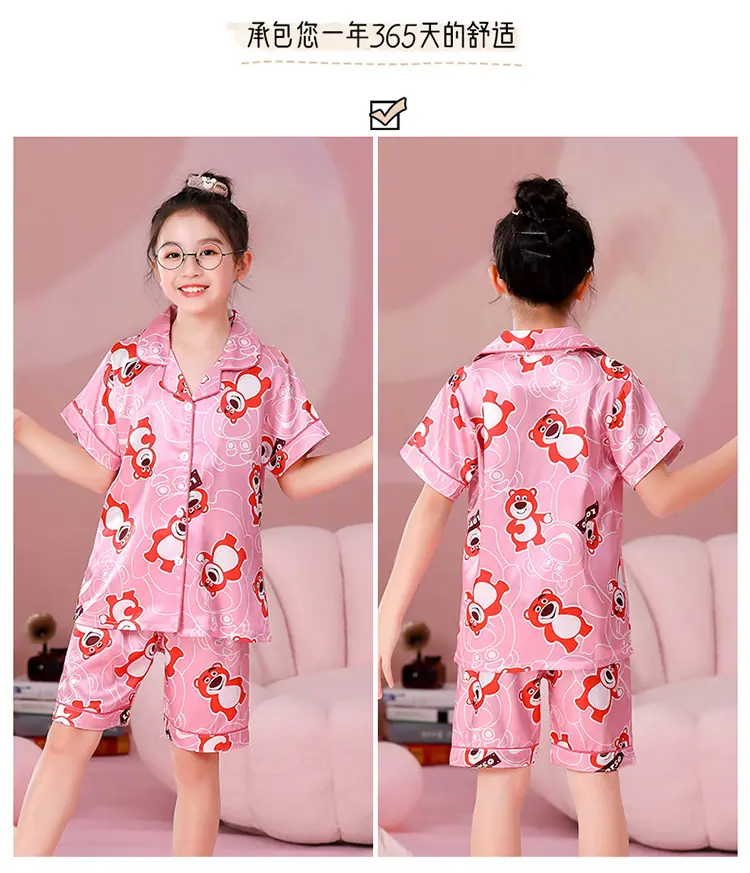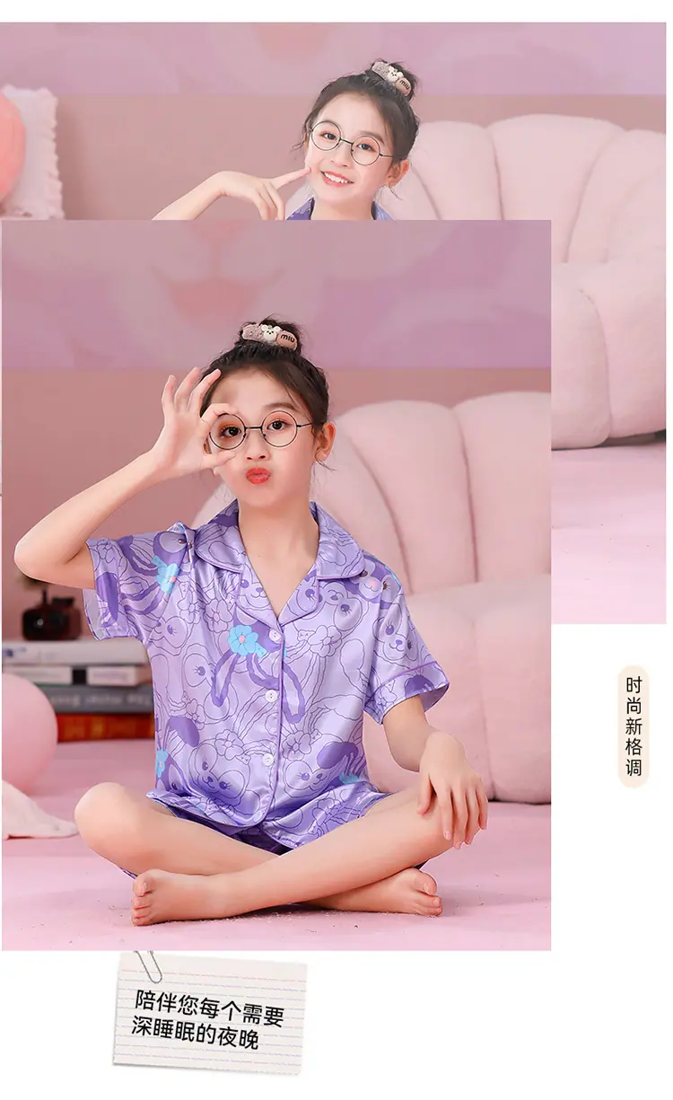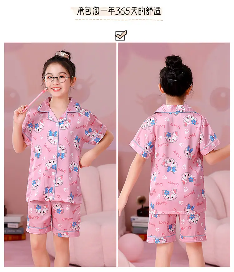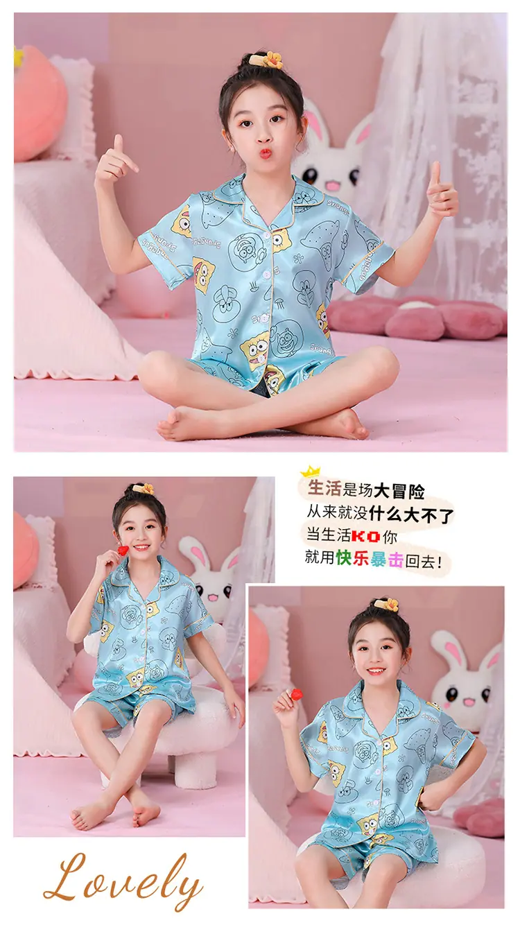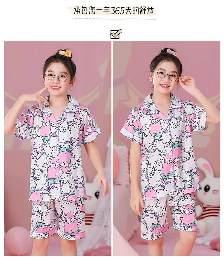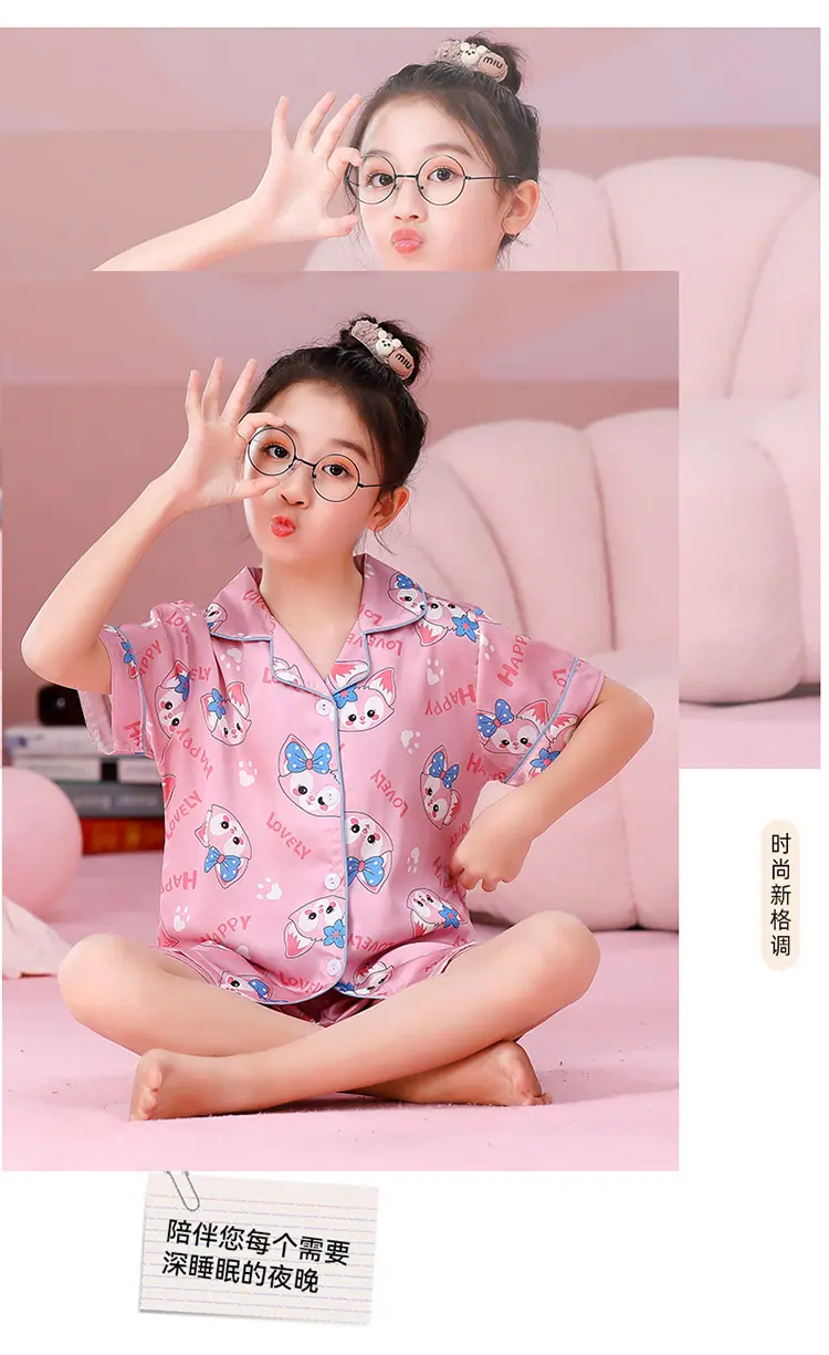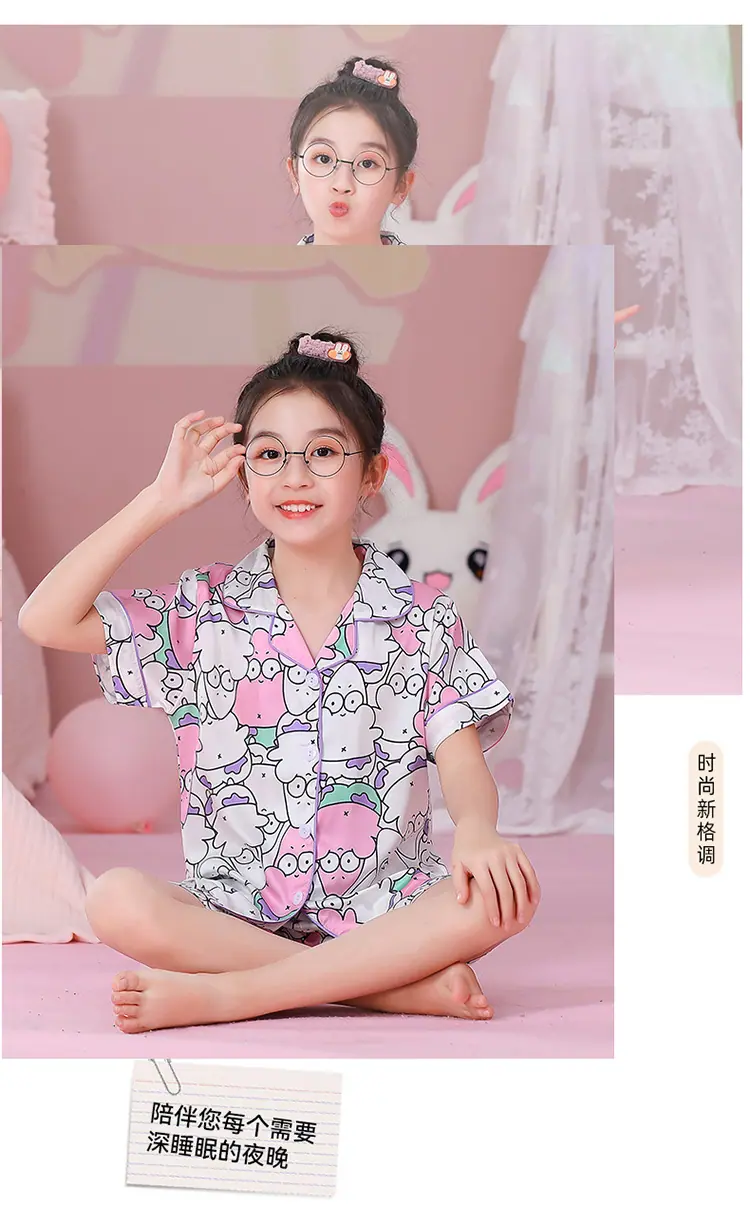 Pijama de verano nuevo para niños de manga corta de seda de hielo para niñas, ropa de aire acondicionado, traje de uso en casa con solapa de dibujos animados para niña pequeña