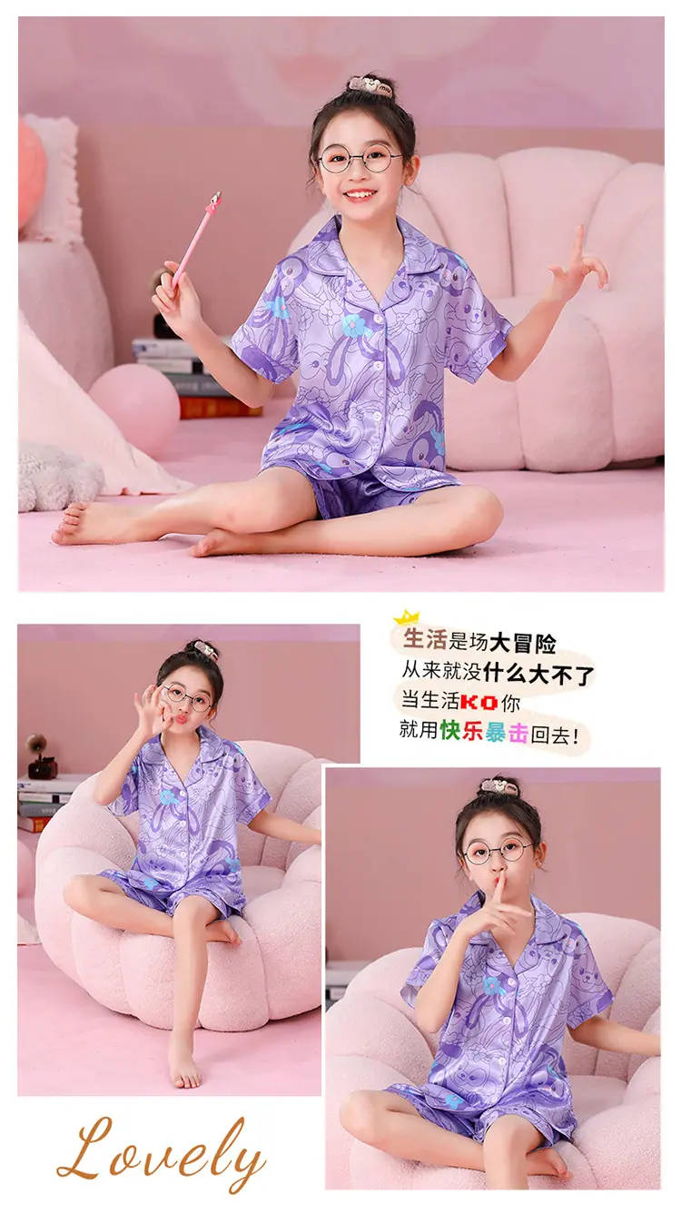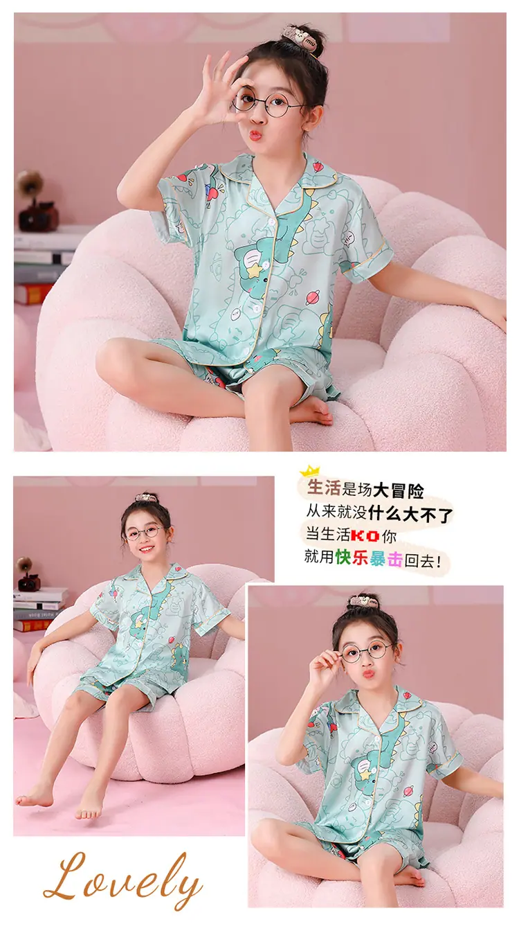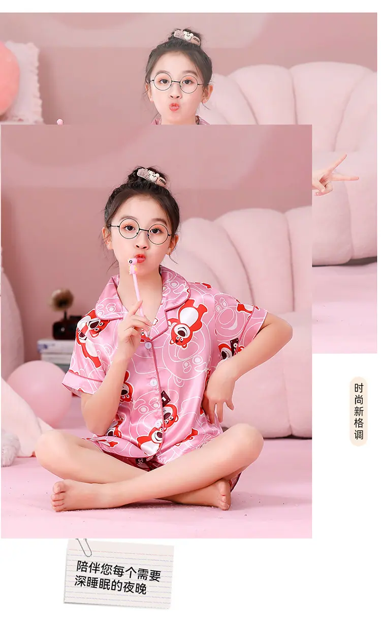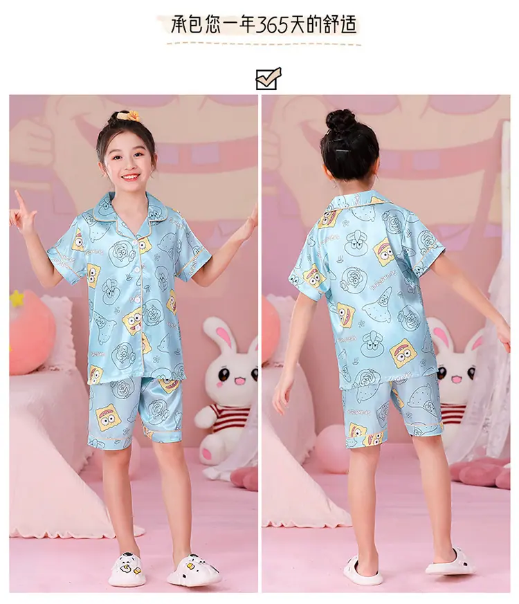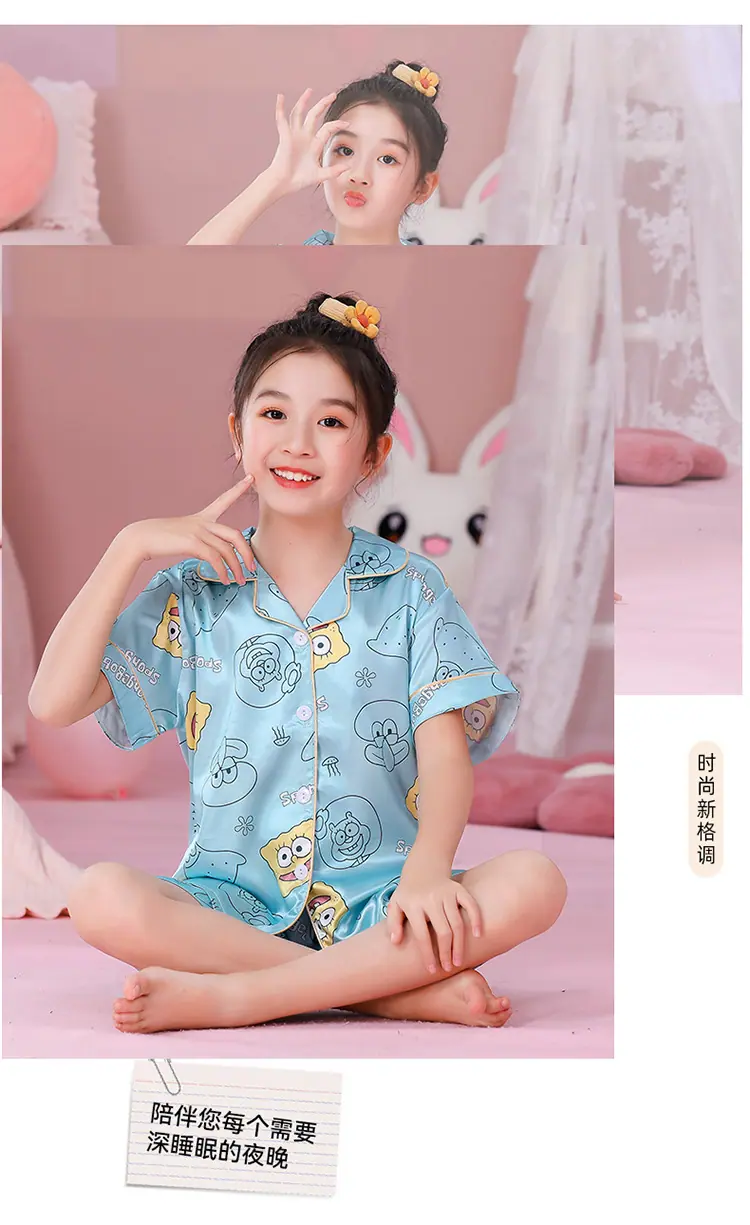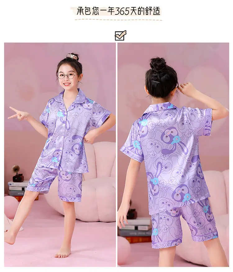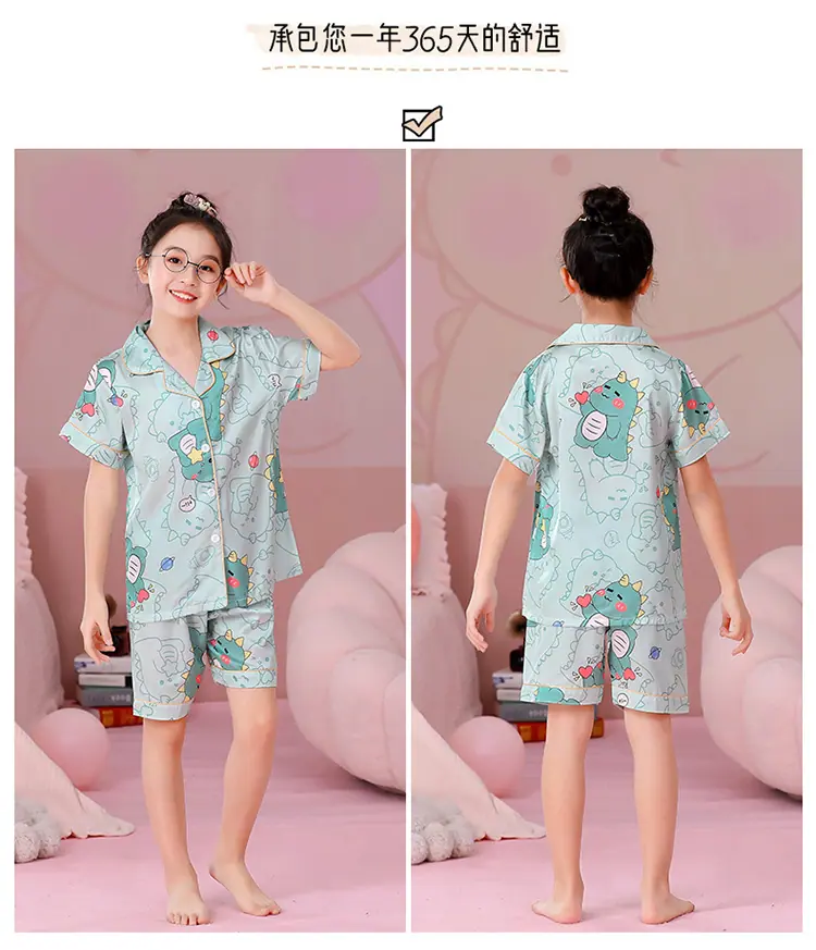 Pijama de verano nuevo para niños de manga corta de seda de hielo para niñas, ropa de aire acondicionado, traje de uso en casa con solapa de dibujos animados para niña pequeña