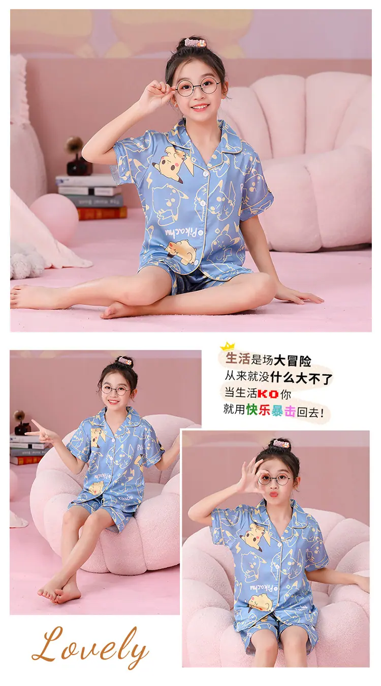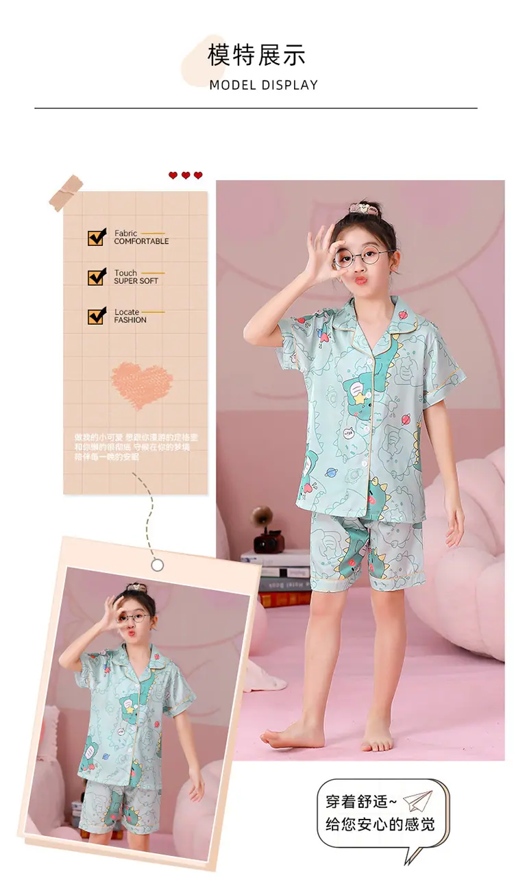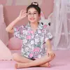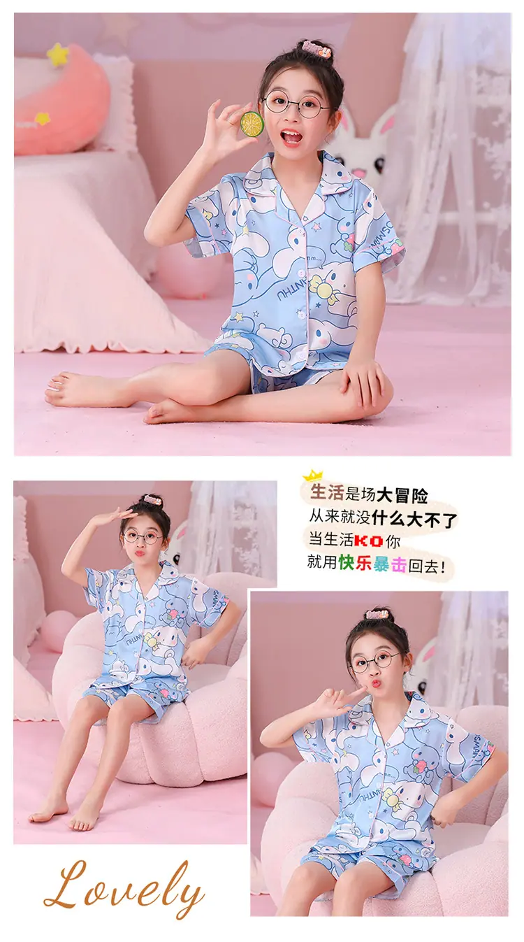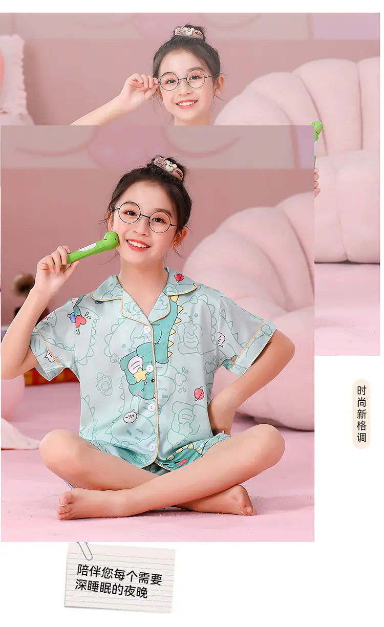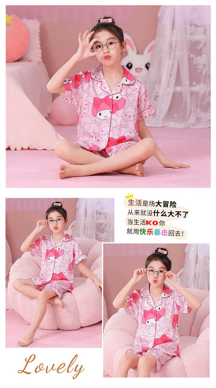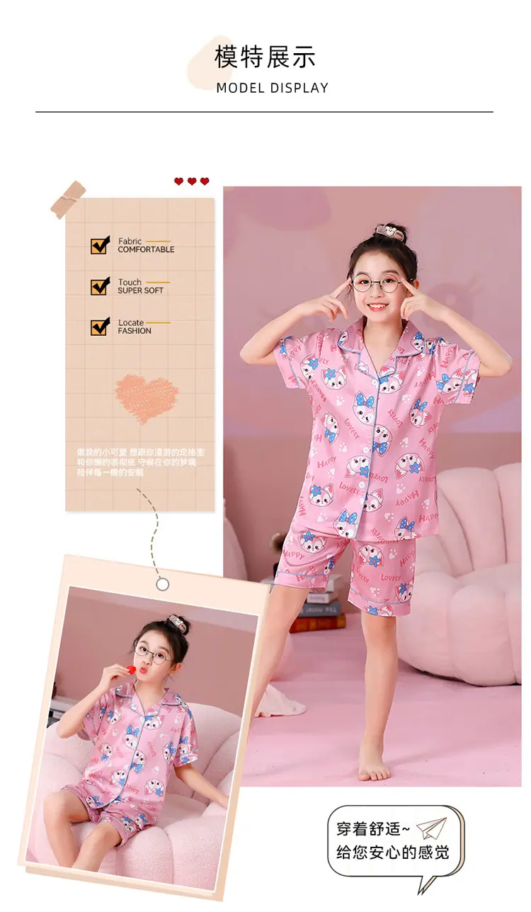 Pijama de verano nuevo para niños de manga corta de seda de hielo para niñas, ropa de aire acondicionado, traje de uso en casa con solapa de dibujos animados para niña pequeña