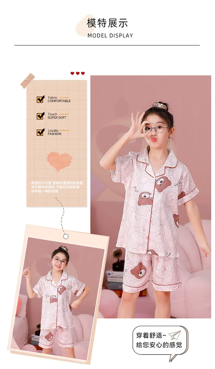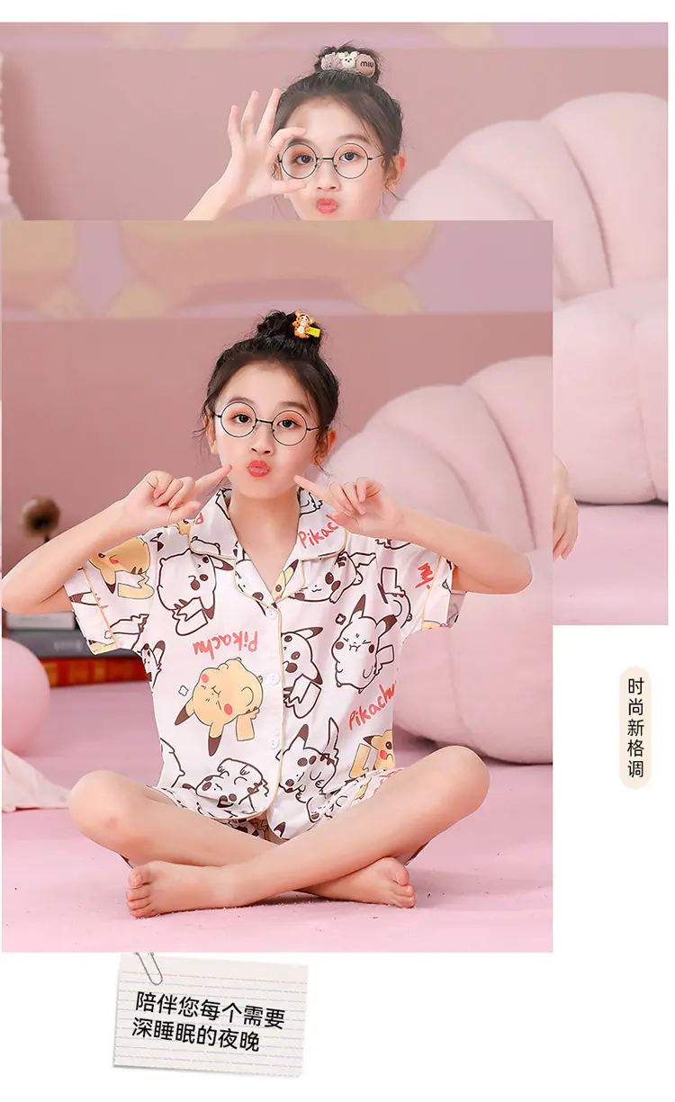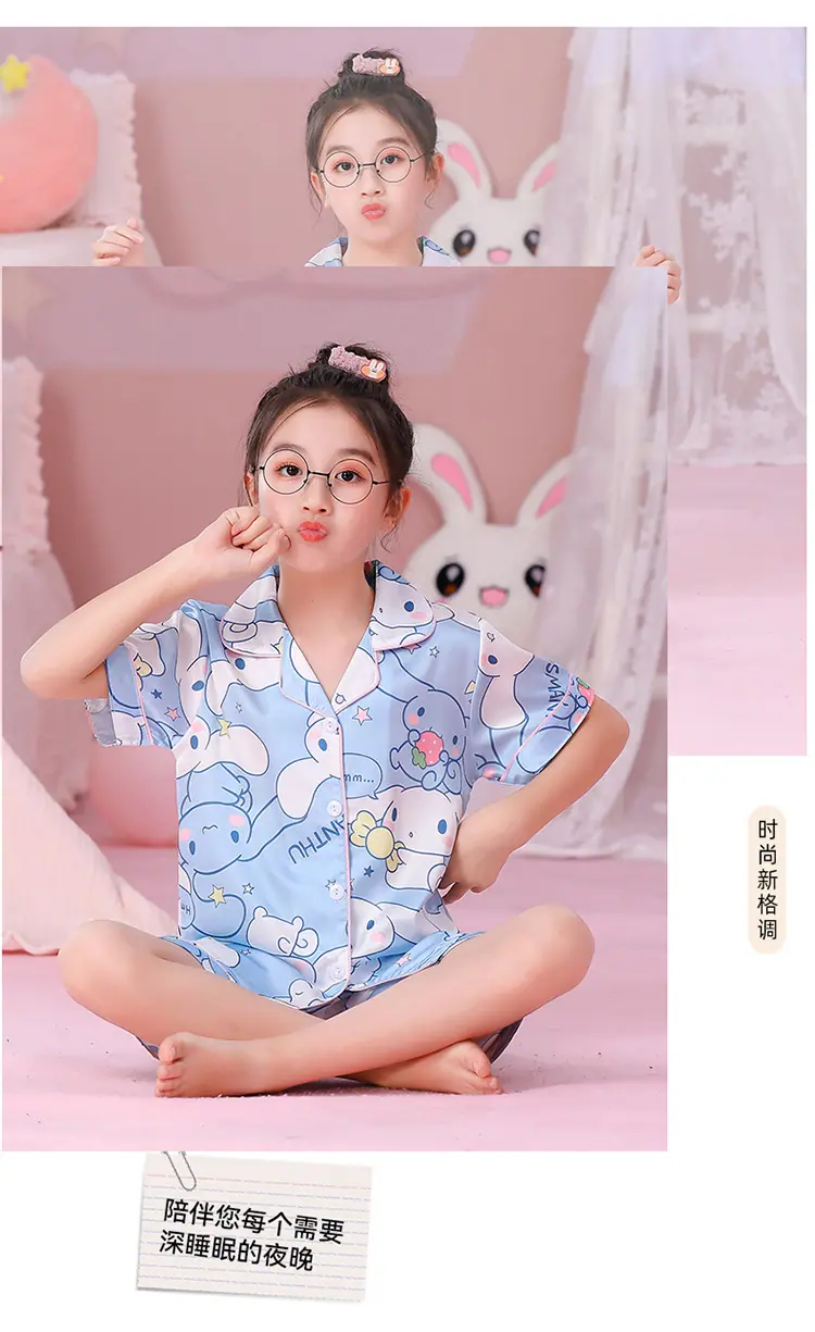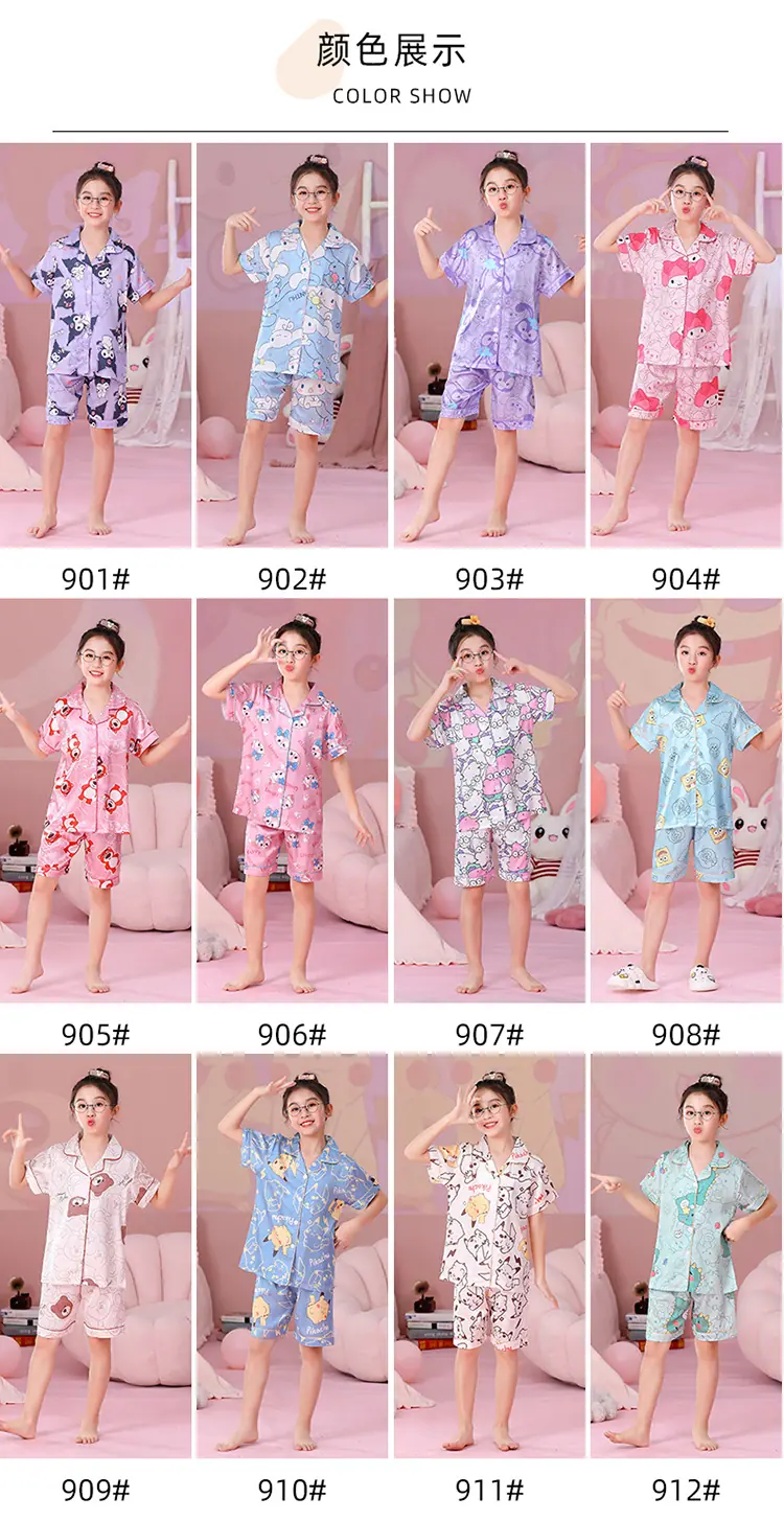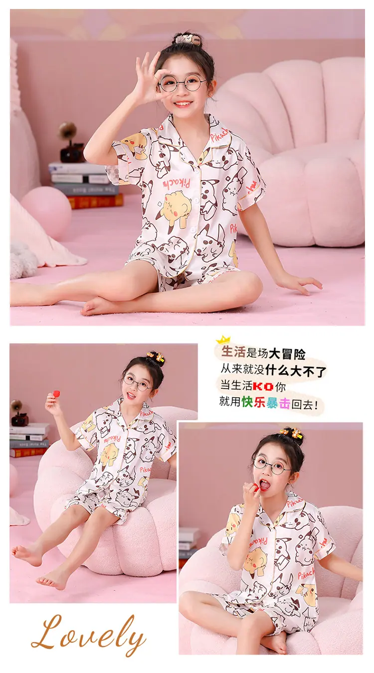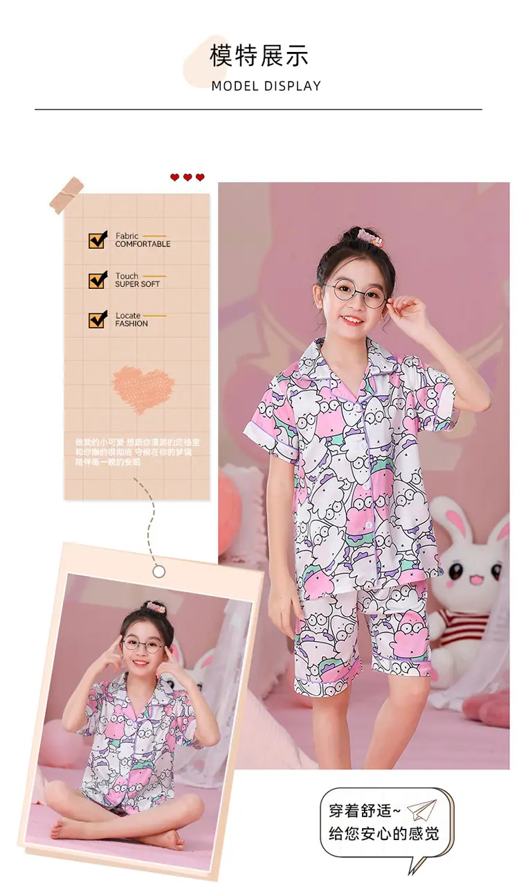 Pijama de verano nuevo para niños de manga corta de seda de hielo para niñas, ropa de aire acondicionado, traje de uso en casa con solapa de dibujos animados para niña pequeña