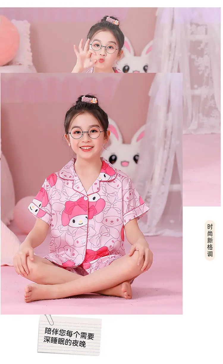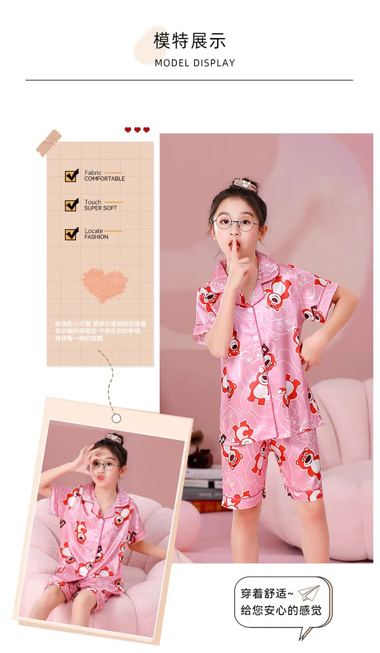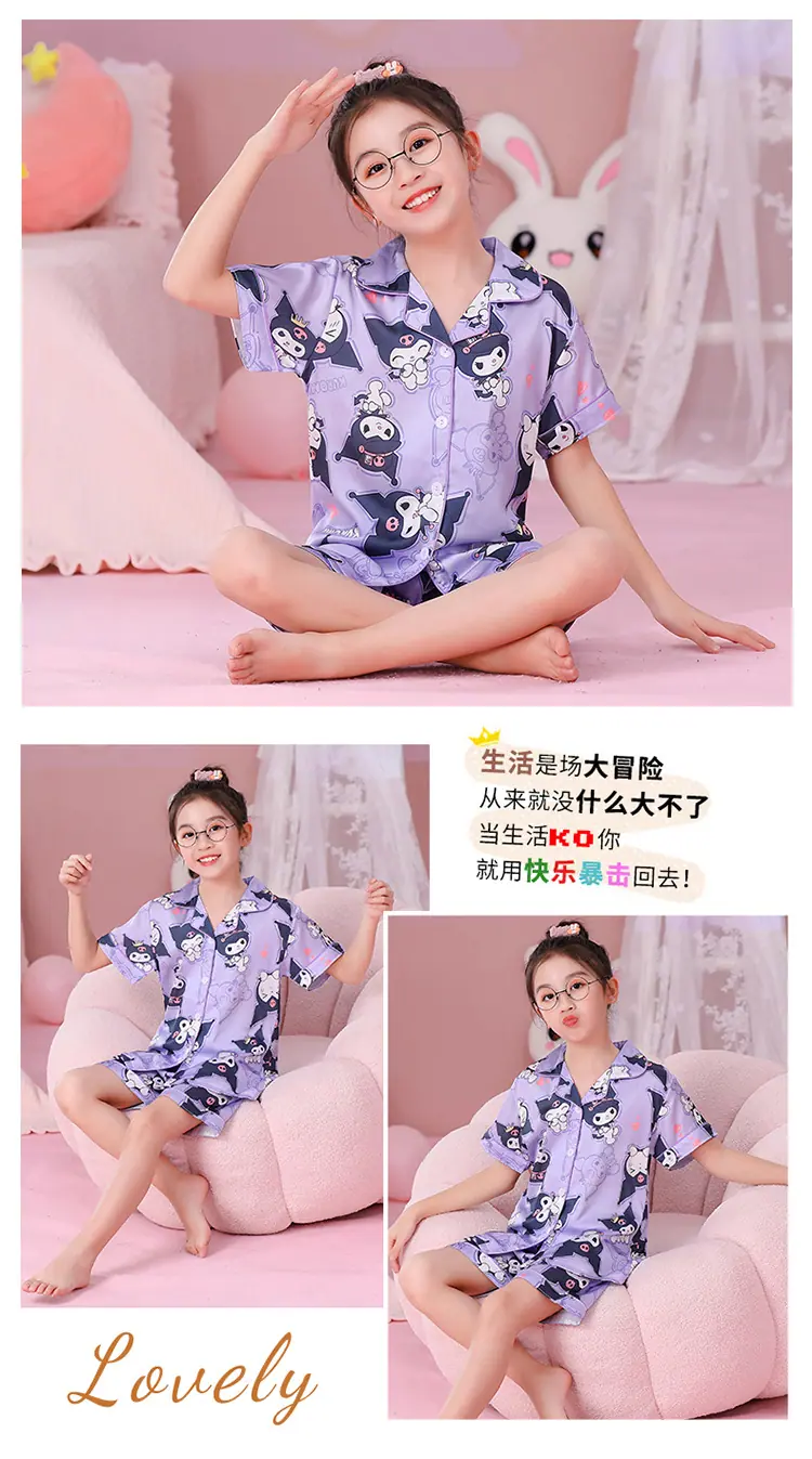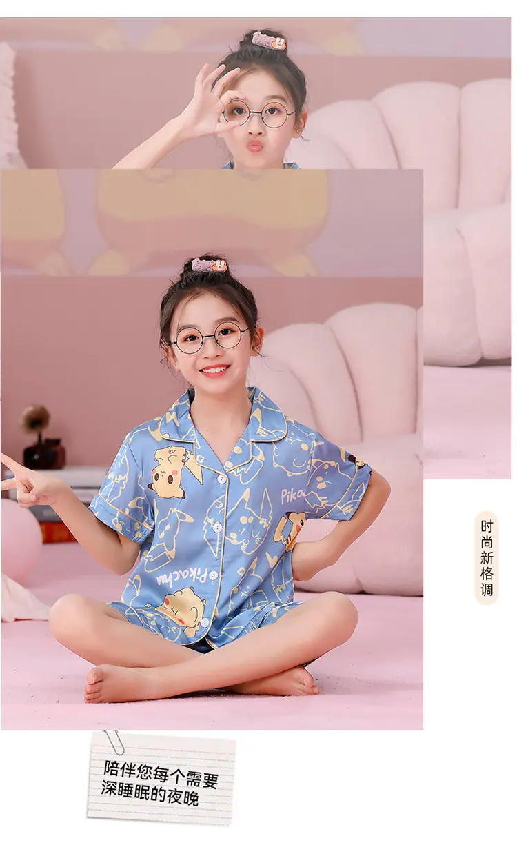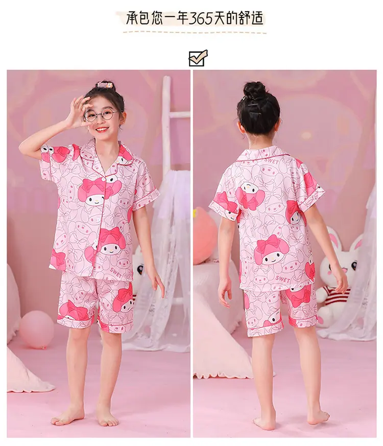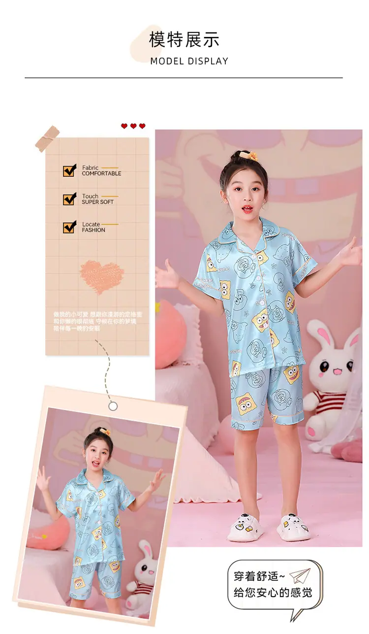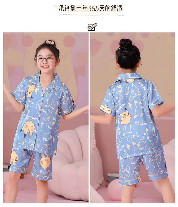 Pijama de verano nuevo para niños de manga corta de seda de hielo para niñas, ropa de aire acondicionado, traje de uso en casa con solapa de dibujos animados para niña pequeña