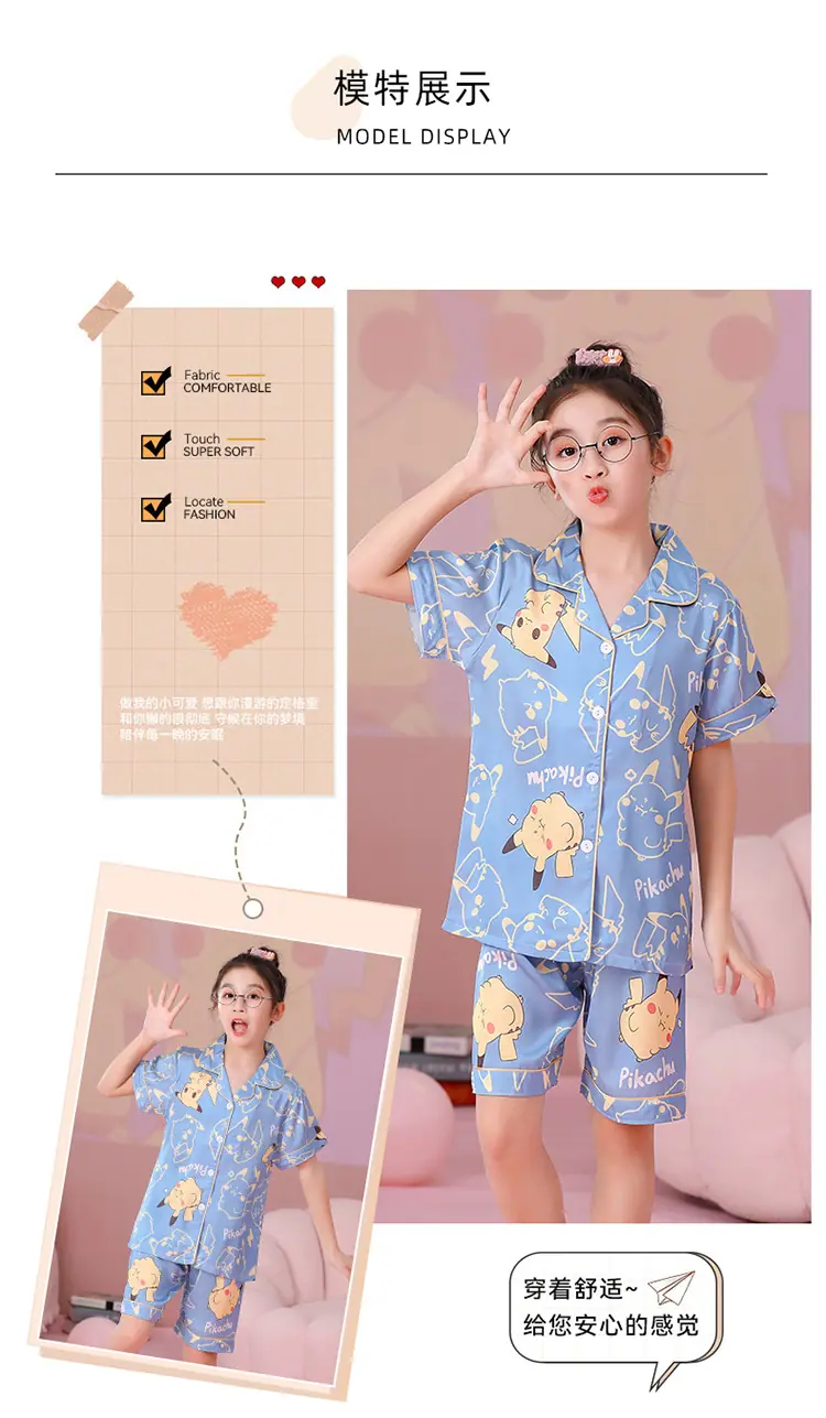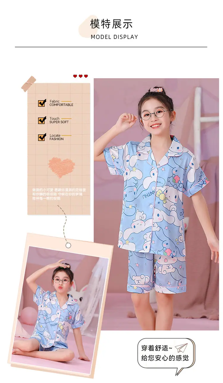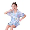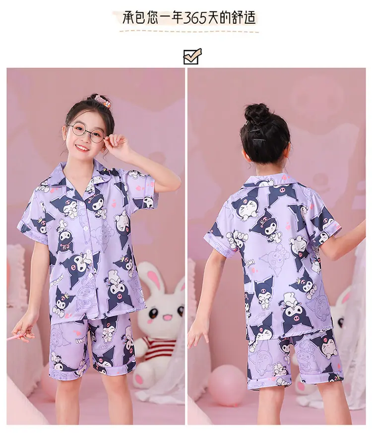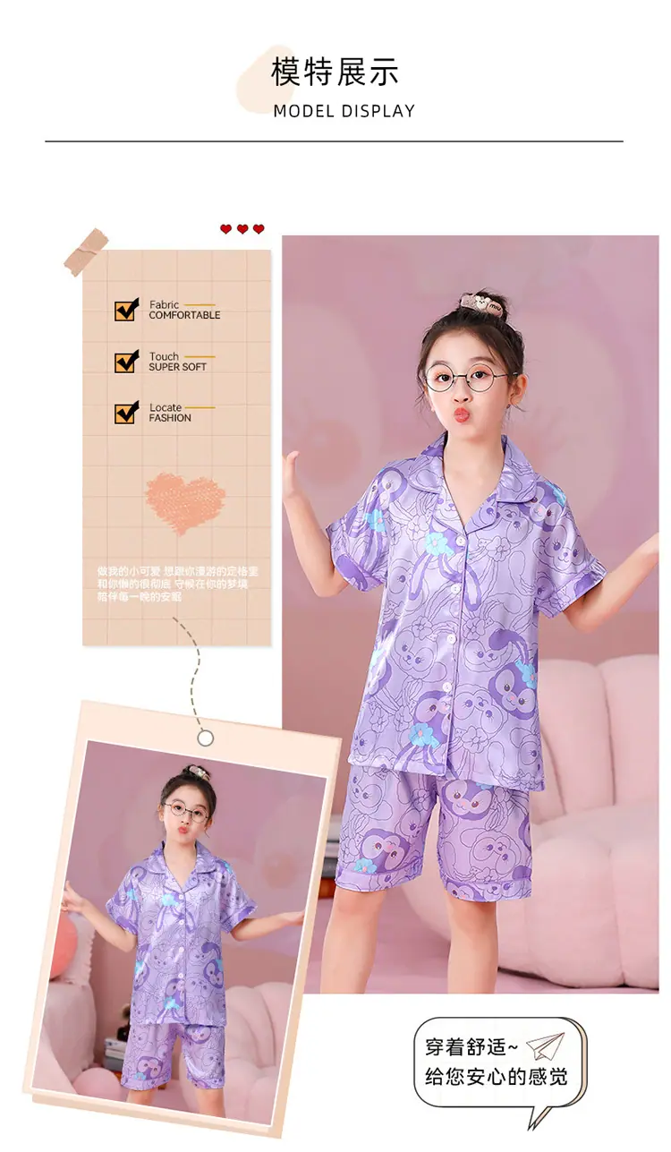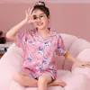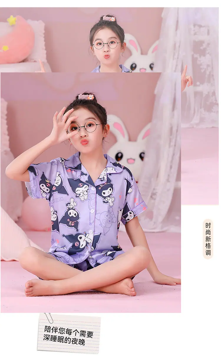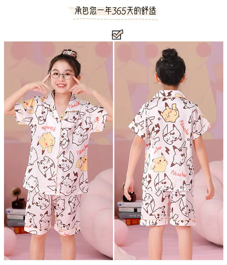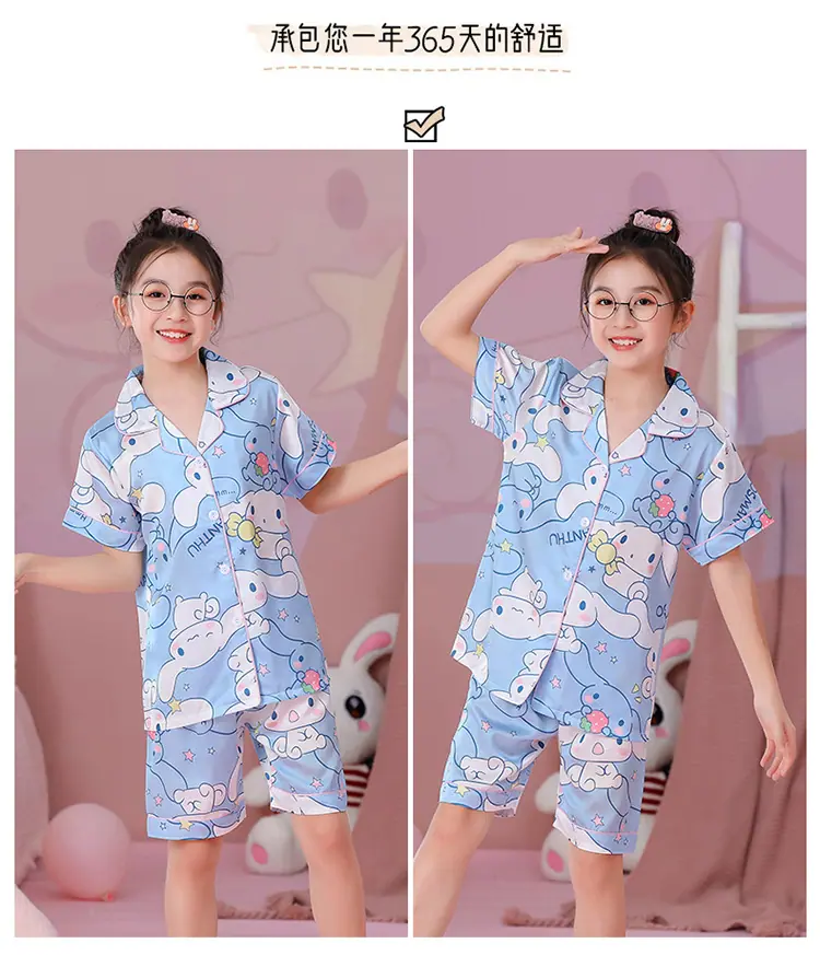 Pijama de verano nuevo para niños de manga corta de seda de hielo para niñas, ropa de aire acondicionado, traje de uso en casa con solapa de dibujos animados para niña pequeña