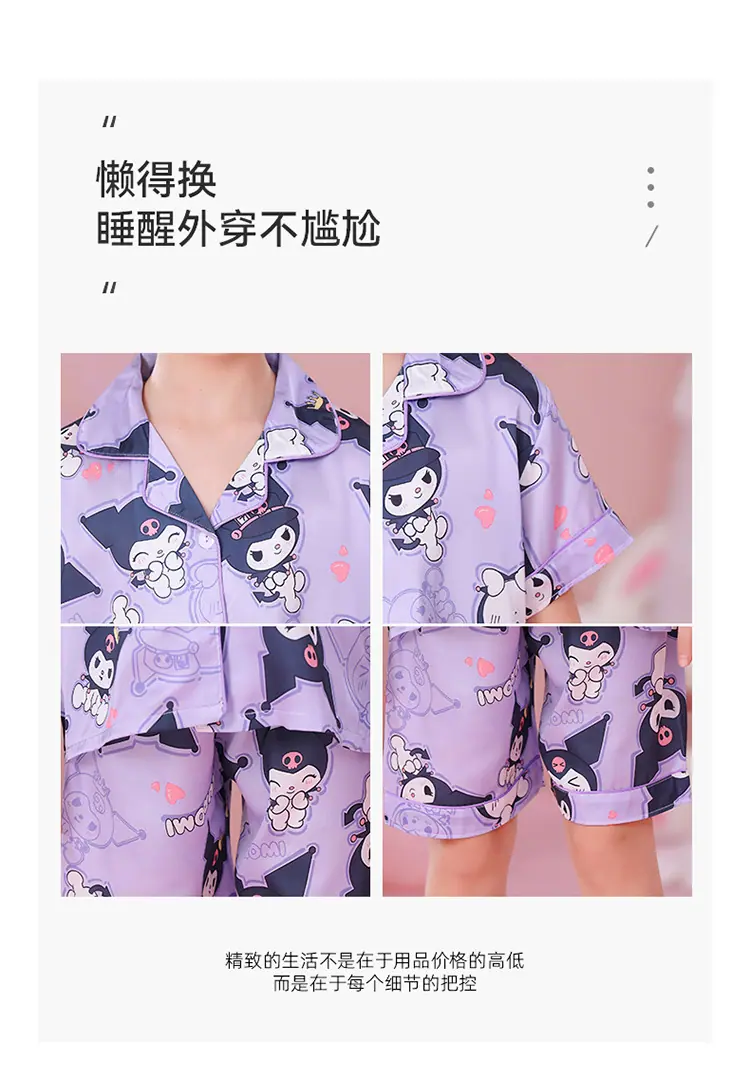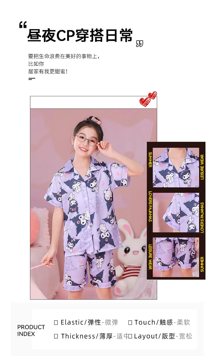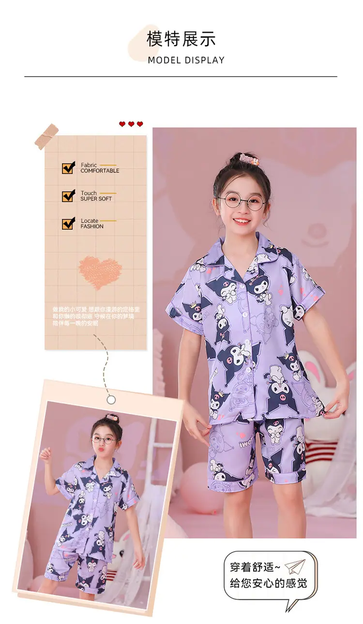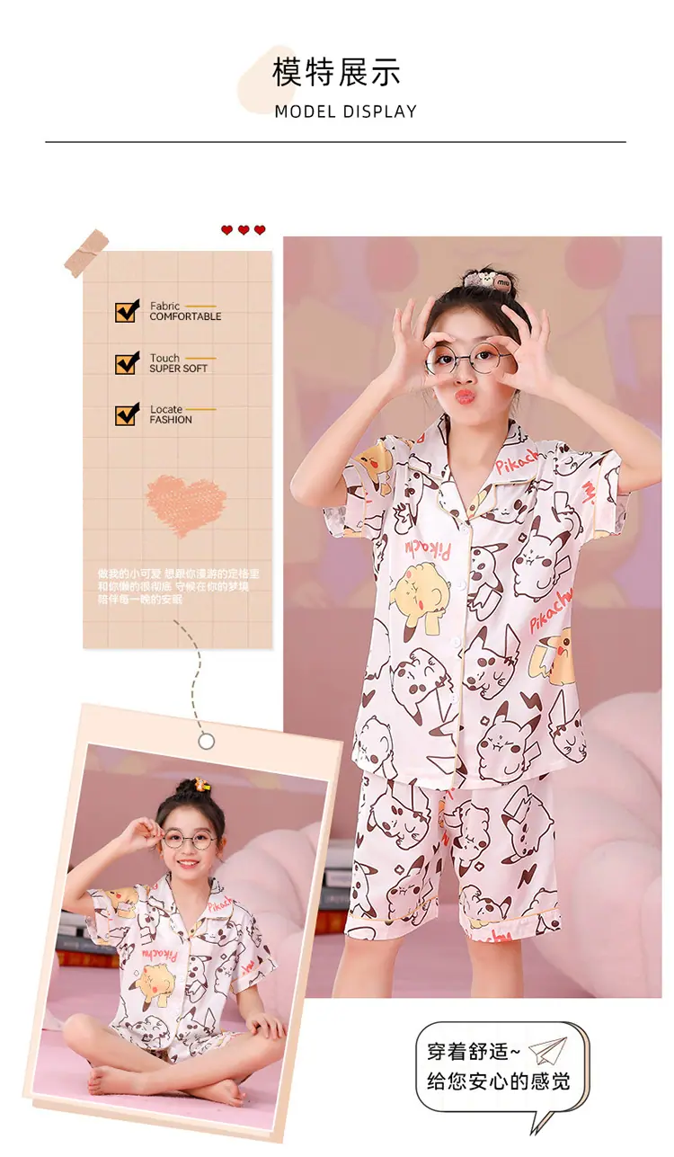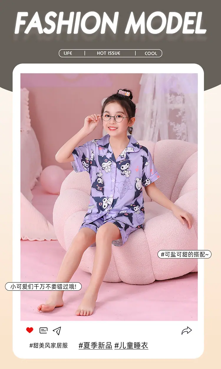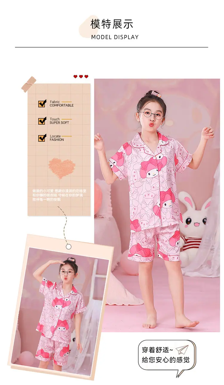 Pijama de verano nuevo para niños de manga corta de seda de hielo para niñas, ropa de aire acondicionado, traje de uso en casa con solapa de dibujos animados para niña pequeña
