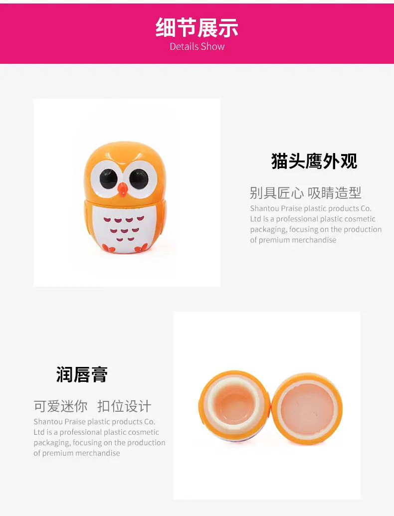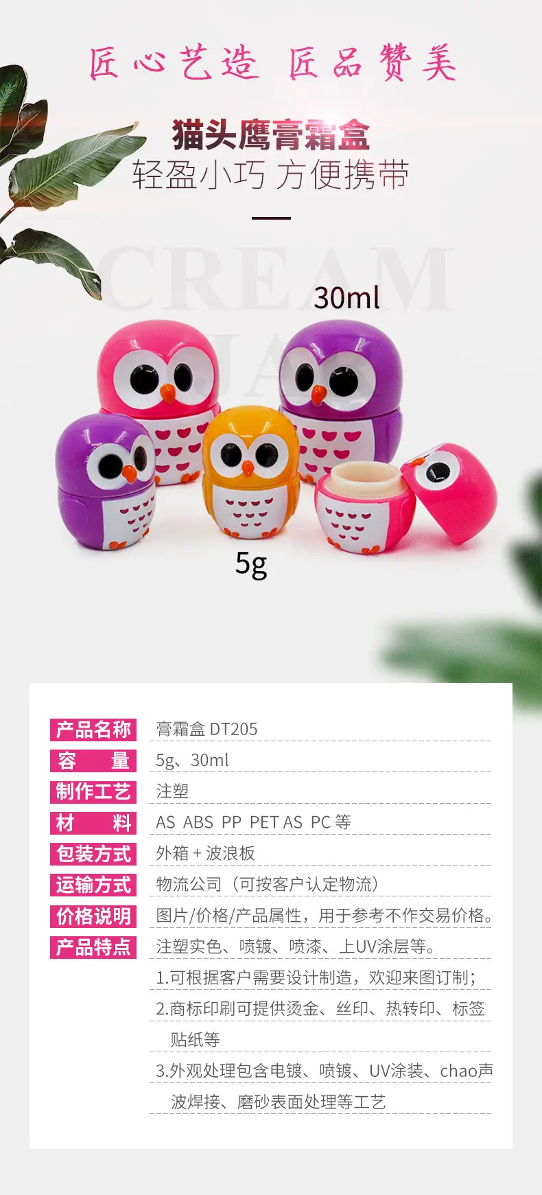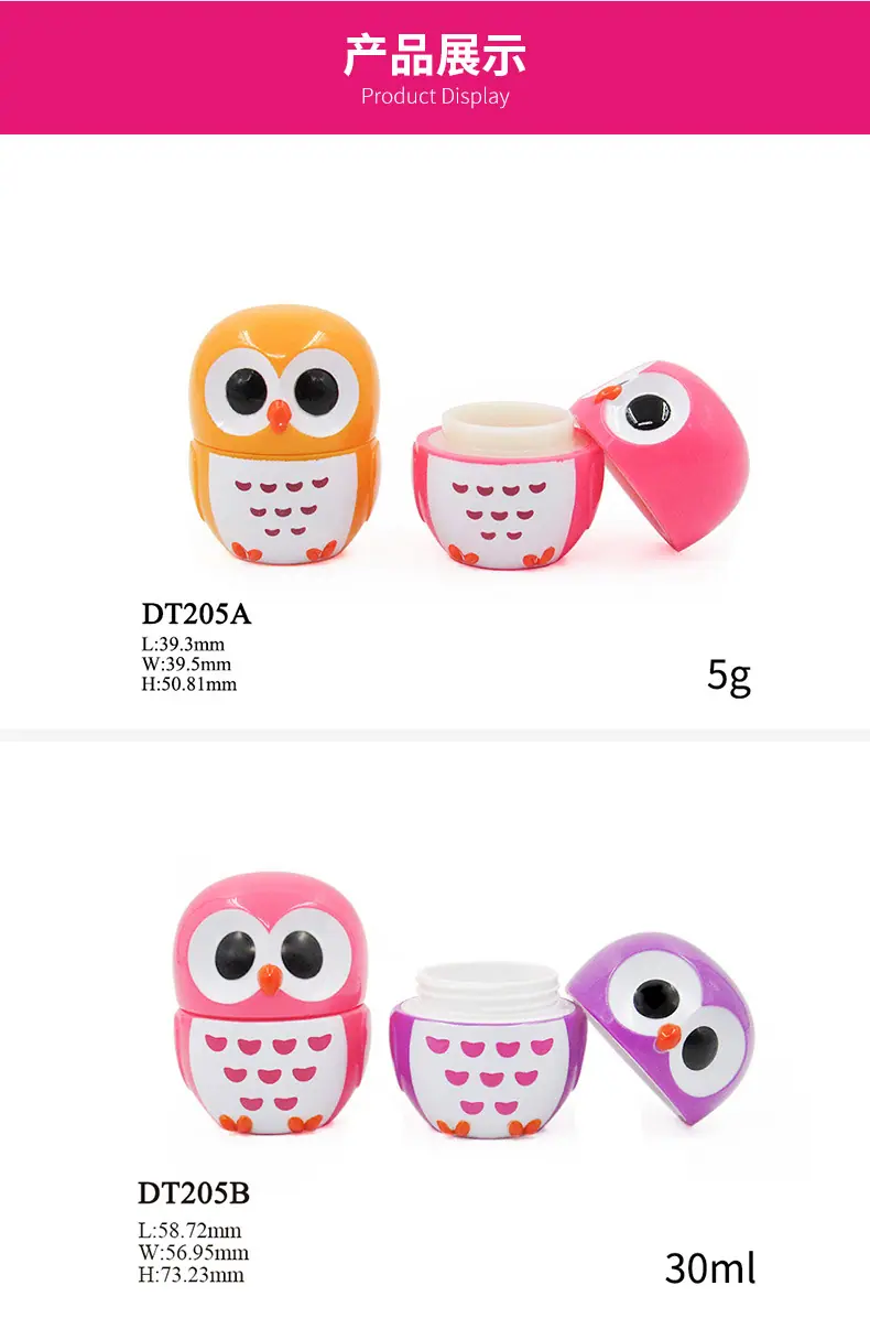 Caja de bálsamo labial de búho 5G caja de cera para la boca 30 ml caja de crema de plástico botella de crema de manos materiales de embalaje cosmético de dibujos animados