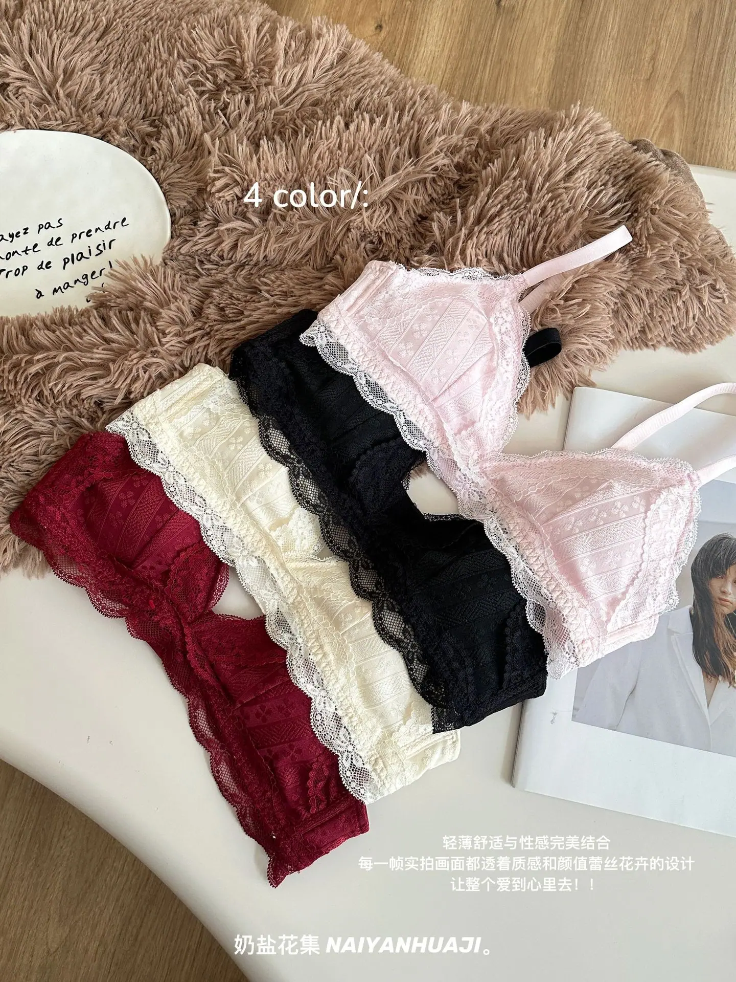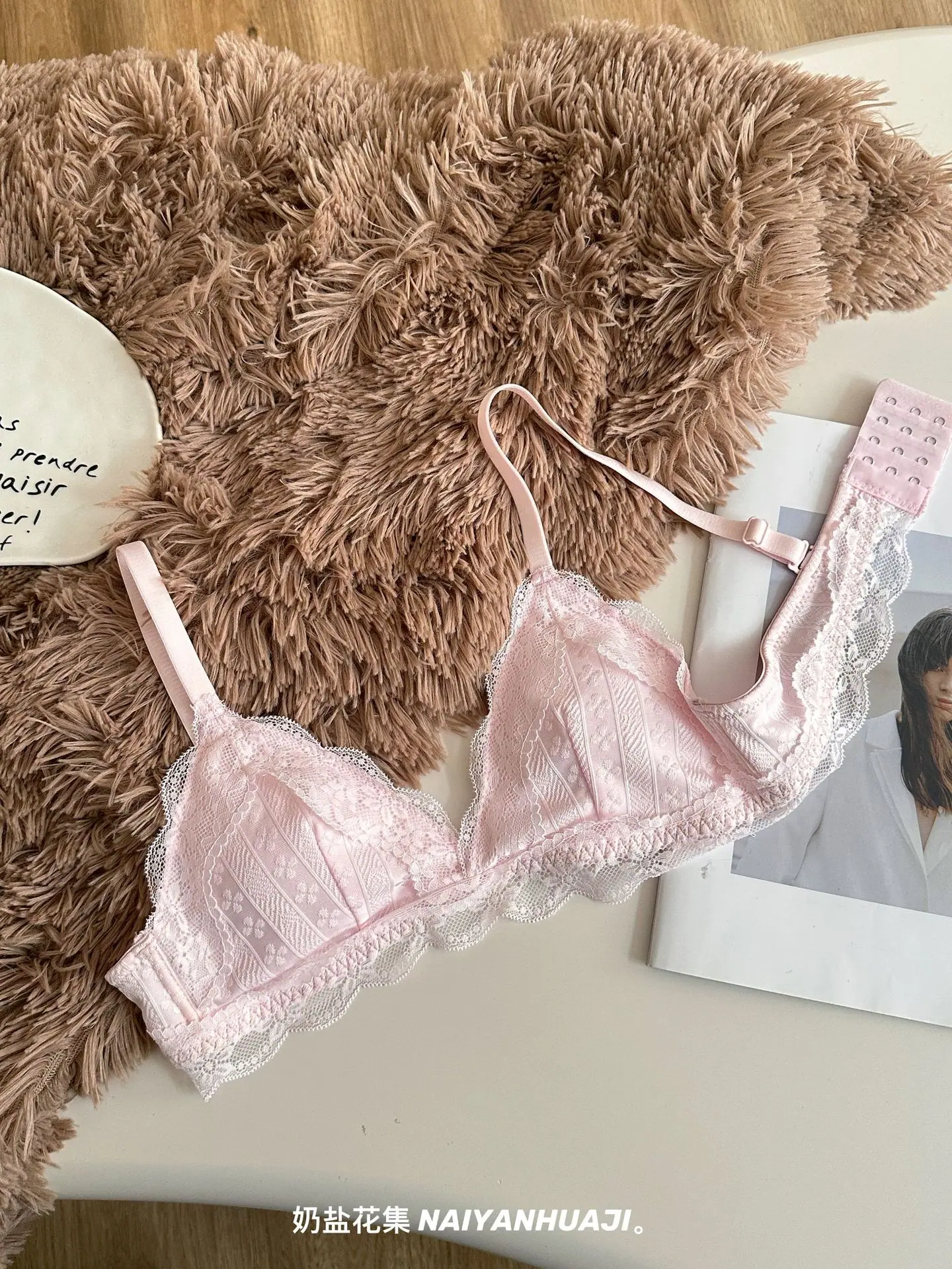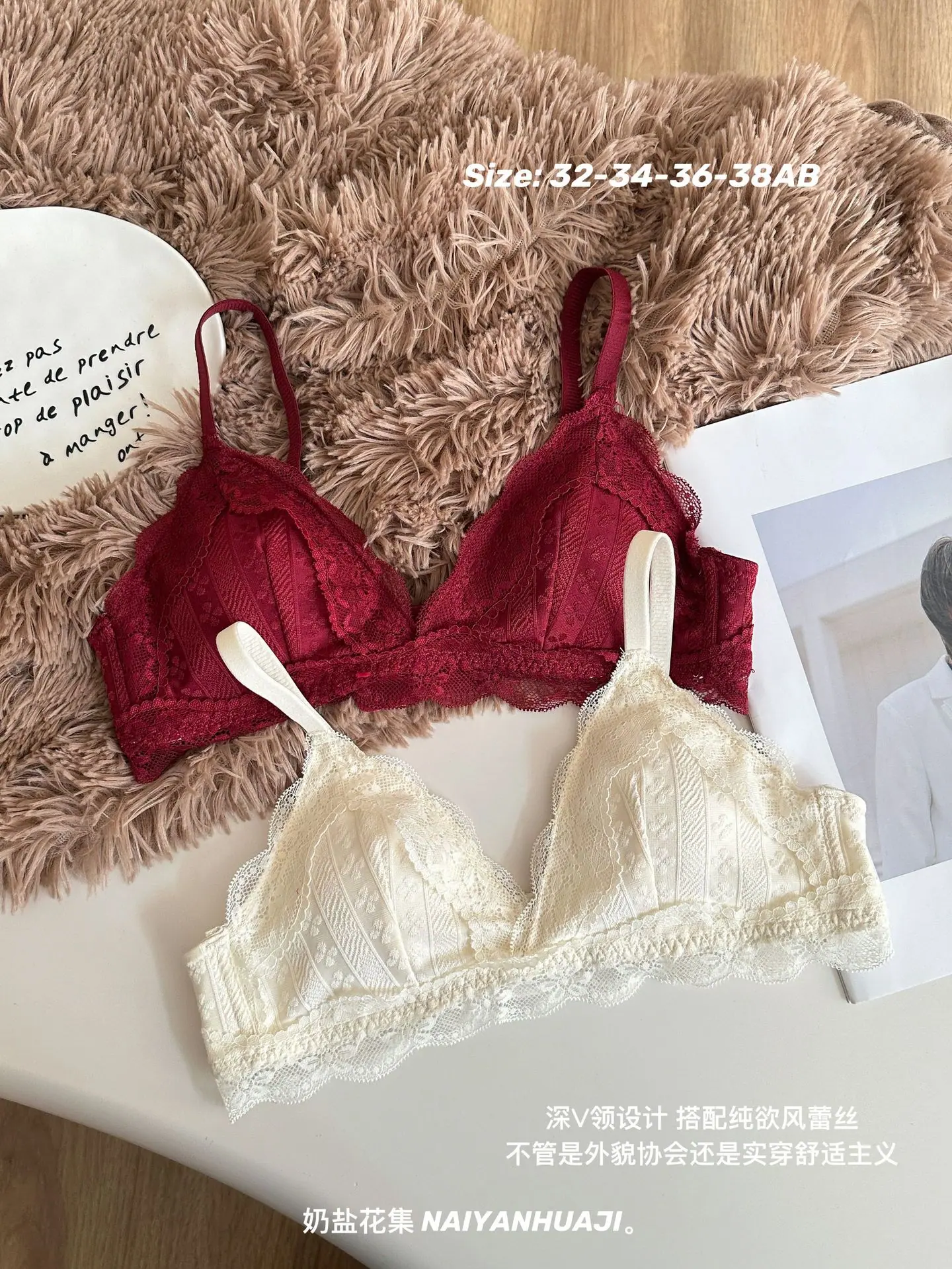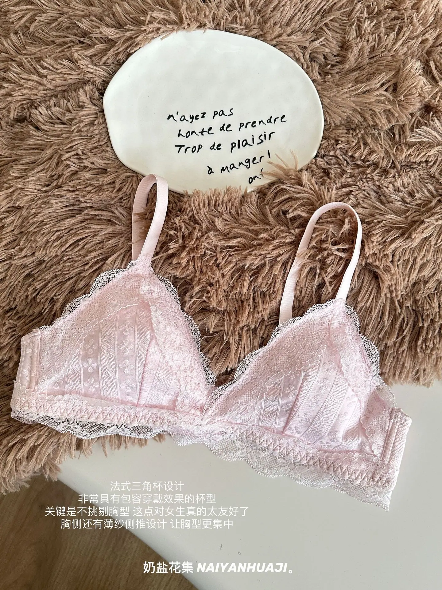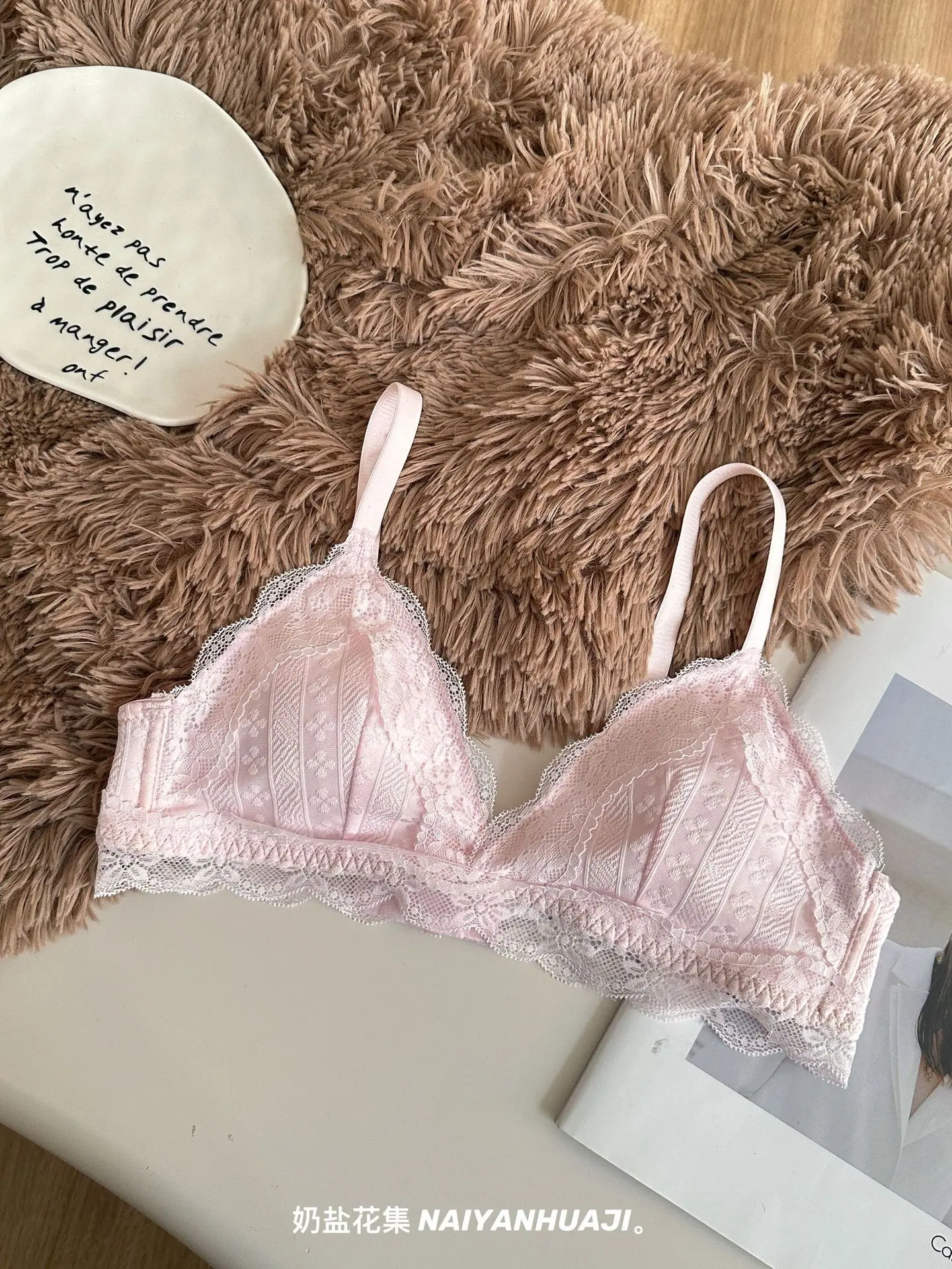Compra Lencería de Encaje Francés Mujer Pecho Pequeño Push Up Inalámbrico Soporte Lateral Anticaída Cómodo Copa Triangular Fina al por mayor en Joom.pro