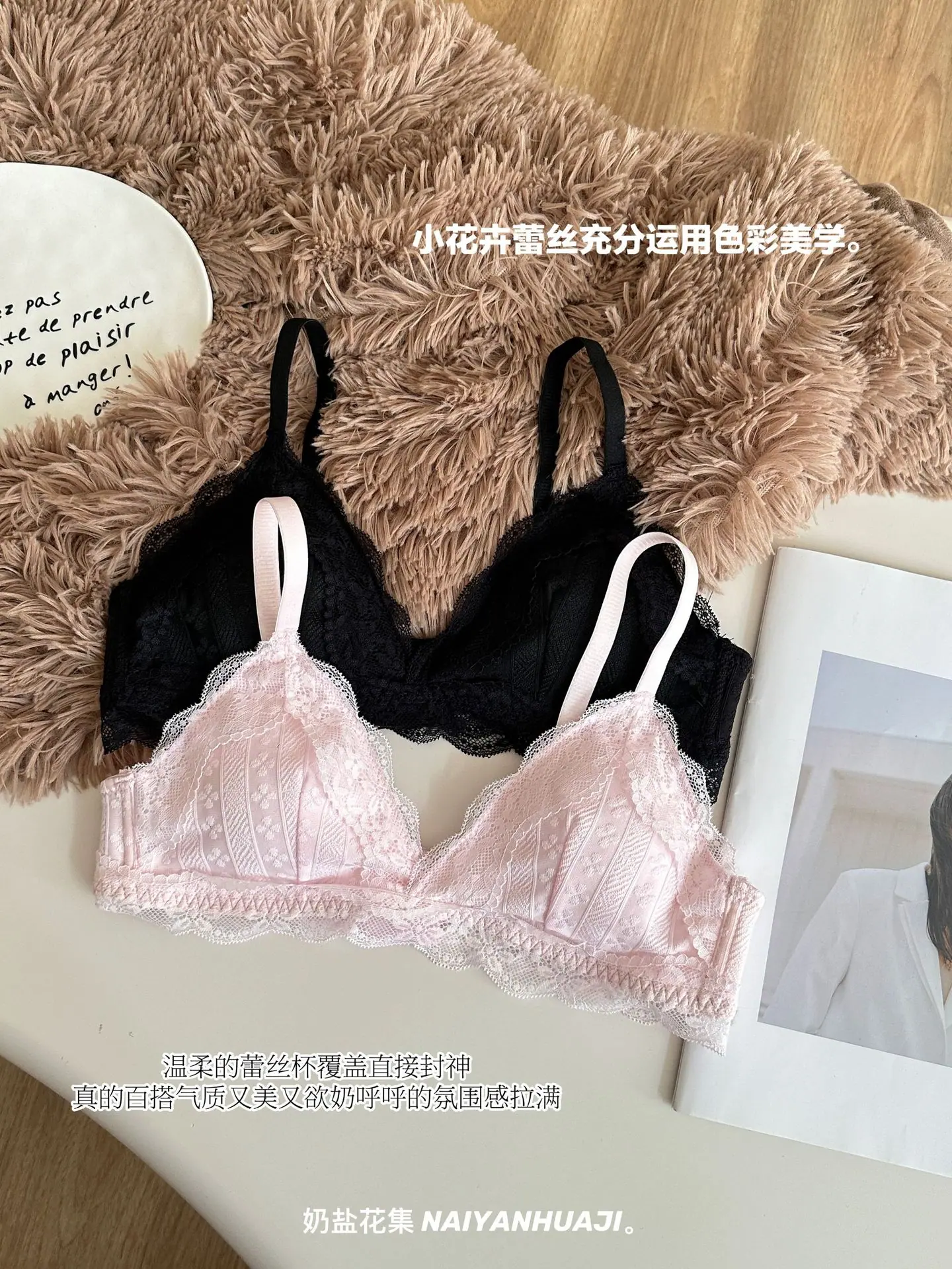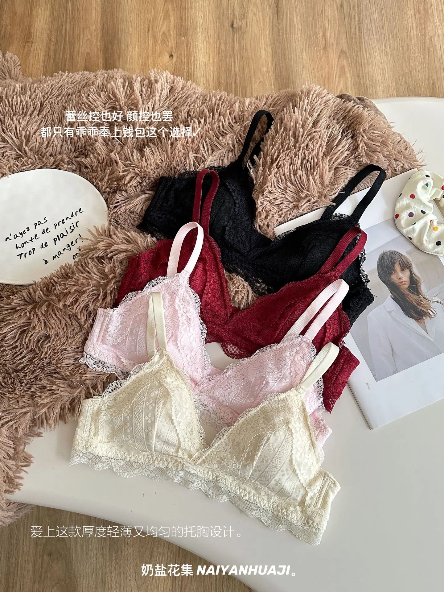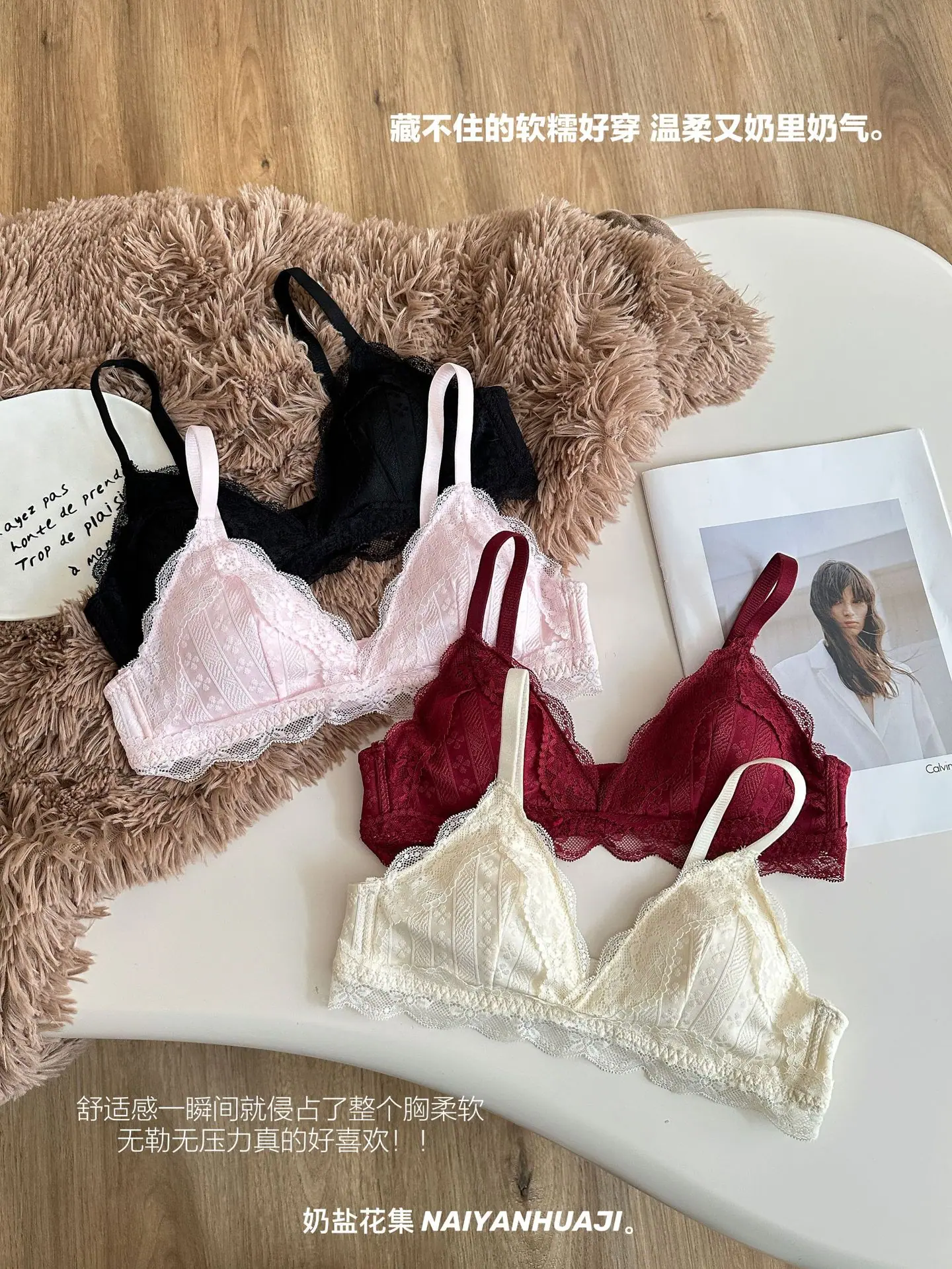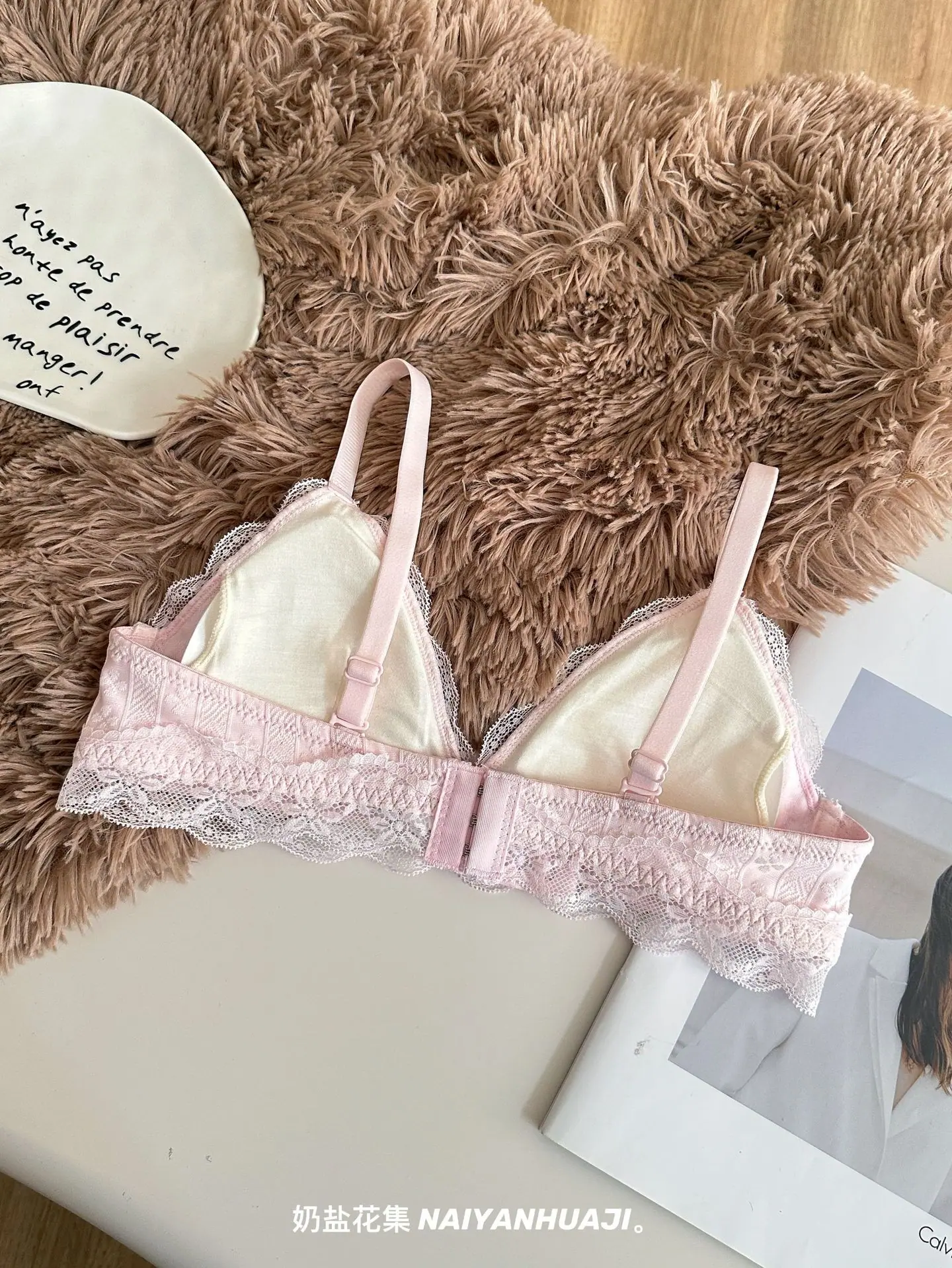Compra Lencería de Encaje Francés Mujer Pecho Pequeño Push Up Inalámbrico Soporte Lateral Anticaída Cómodo Copa Triangular Fina al por mayor en Joom.pro