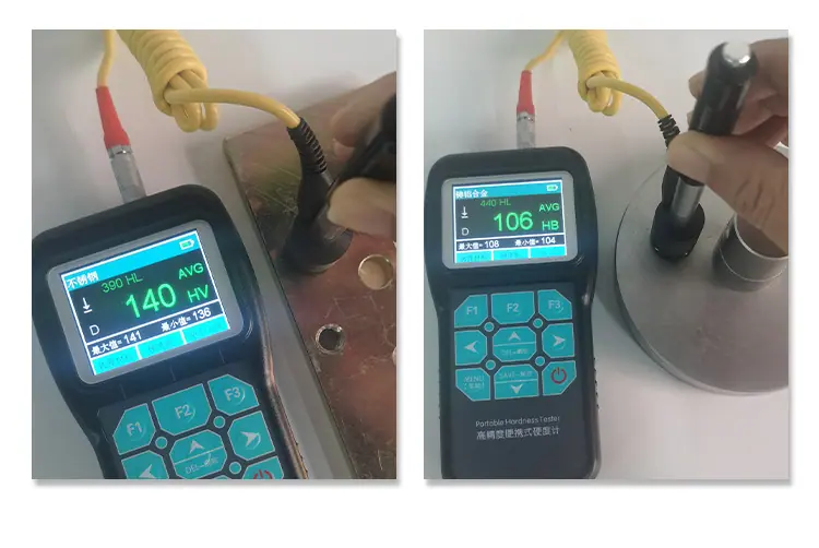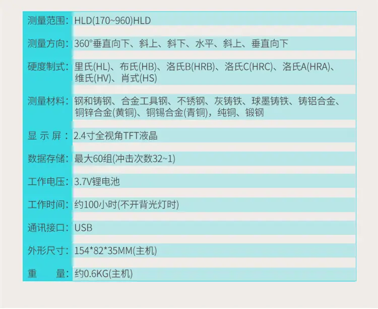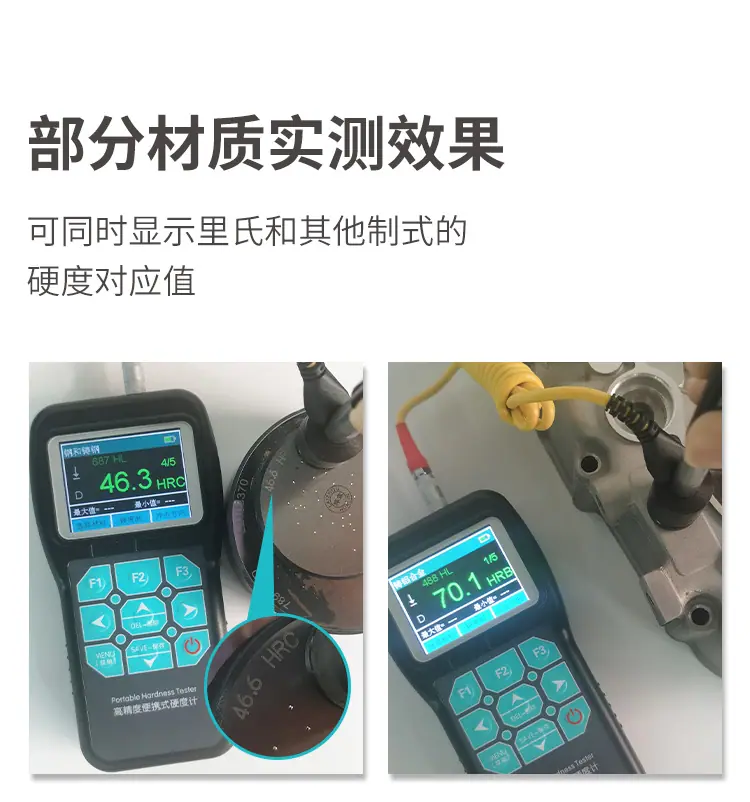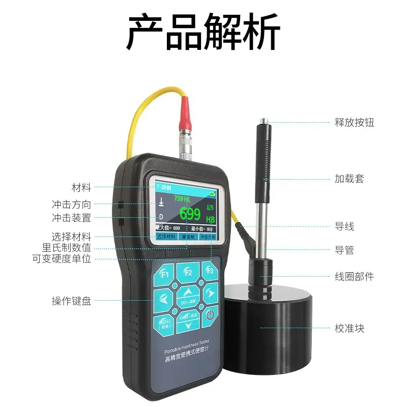 El probador de dureza Leeb de pantalla a color verdadero es un diseño innovador de la empresa basado en una investigación profunda del principio de medición de dureza Leeb. Sobre la base de la tabla de datos existente, se han añadido cuatro nuevas escalas de dureza de materiales:Dispositivo de impacto tipo D acero aleado para herramientas añadido HRA, HB; aleación de aluminio fundido artículo HV; dispositivo de impacto tipo C añadido aleación de aluminio fundido artículo HV; además, lo que es más notable es que se desarrolló la función 《Material de Usuario》, ¡satisfaciendo la necesidad del usuario de pruebas de materiales especiales! Ampliando enormemente el rango de aplicación del durómetro Leeb. No está disponible en ningún otro instrumento en el país y en el extranjero.
