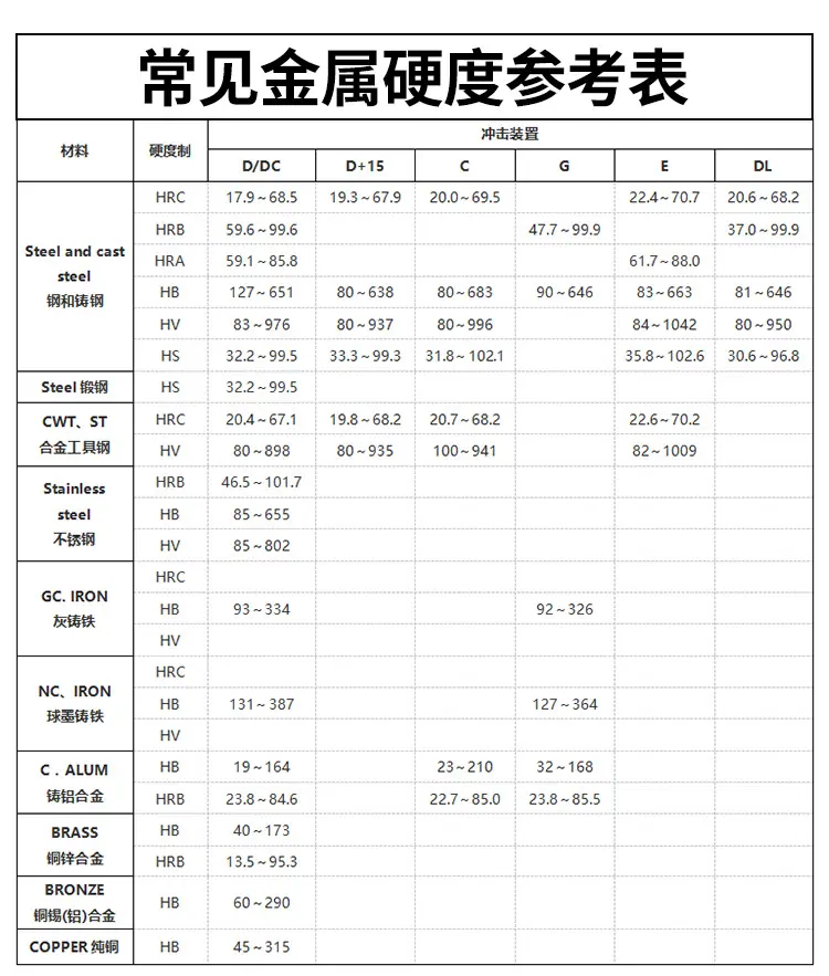 Cambie convenientemente a todas las escalas de dureza (HL, HB, HRB, HRC, HRA, HV, HS), y convierta los valores medidos entre varias escalas de dureza en paralelo. Además, puede lograr la conversión entre dureza y resistencia σb.