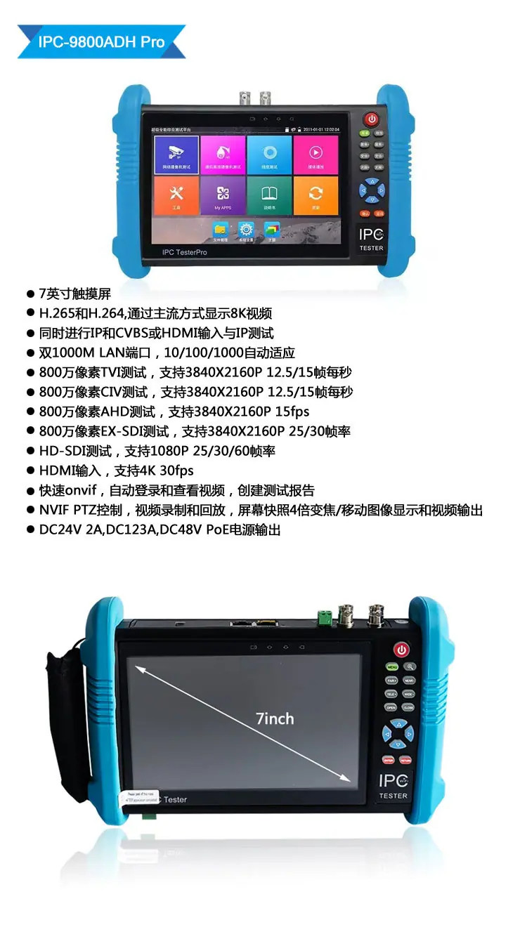 Probador de Vigilancia de Video Analógico de Red Pantalla de 7 pulgadas Tesoro de Ingeniería IPC-9800ADH Pro