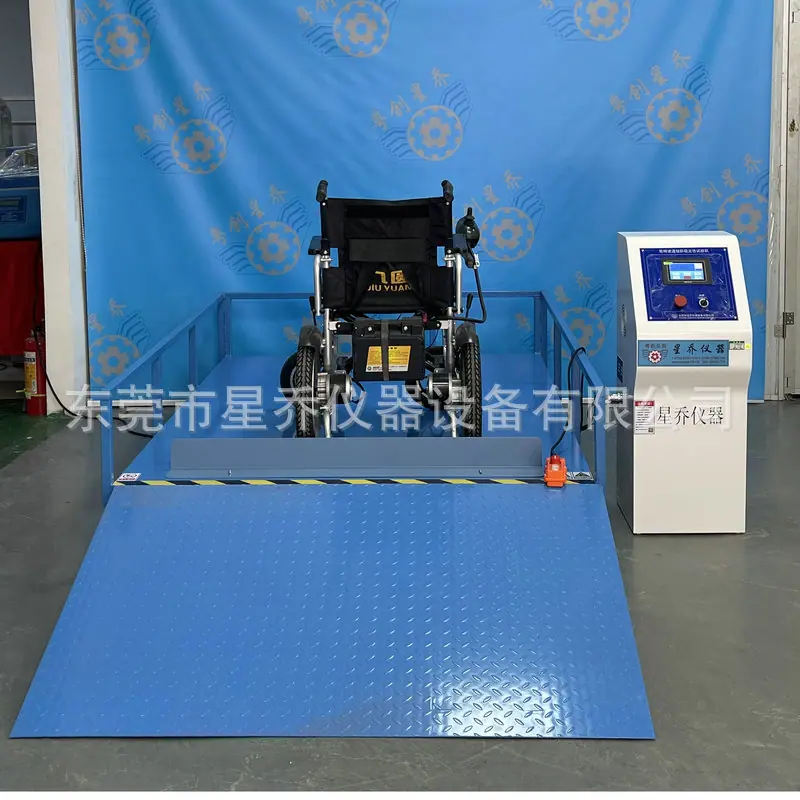 Esta máquina de prueba es adecuada para pruebas de estabilidad estática de sillas de ruedas eléctricas y manuales, incluyendo inclinación longitudinal hacia adelante y hacia atrás, inclinación lateral longitudinal hacia atrás y para desplazamiento lateral de sillas de ruedas manuales, etc. En la prueba de estabilidad, un extremo de la mesa de prueba eléctrica automática o con control manual de volante se eleva, y la silla de ruedas lastrada se posiciona en estado horizontal. Durante la prueba, la superficie inclinada se eleva al ángulo de prueba ajustando el volante o la consola de control eléctrico, y la silla de ruedas puede deslizarse hacia abajo según los requisitos de la prueba, haciendo la prueba más segura y fiable; también puede usarse para elementos de prueba de estabilidad relacionados.