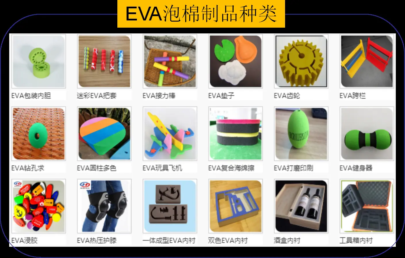 La espuma EVA se usa ampliamente en automóviles, electrónica, comunicaciones, electrodomésticos, equipos de muebles, juguetes, maquinaria, equipos médicos, equipos deportivos, audio, LED, iluminación, industria automotriz, química y otras industrias.