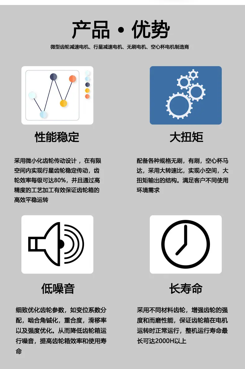 •Larga vida útil: Debido al diseño sin escobillas, el desgaste se reduce y la vida útil del motor aumenta.