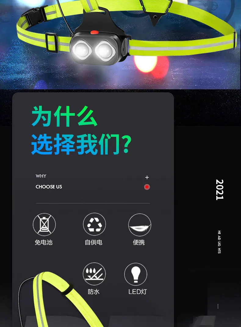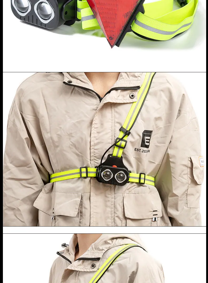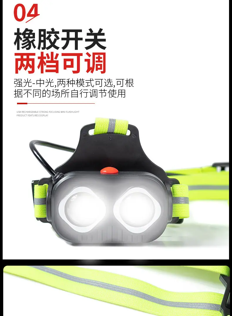 Modo: Luz fuerte, luz media Fuente de alimentación: Batería de litio incorporada Carga USB Capacidad: 2000 mAh Características: Alto brillo del faro y larga distancia de irradiación Correa fluorescente con luz roja de advertencia de alto brillo retroiluminación Uso: Ciclismo, deportes, correr, camping, aventura, montañismo, emergencia, uso doméstico