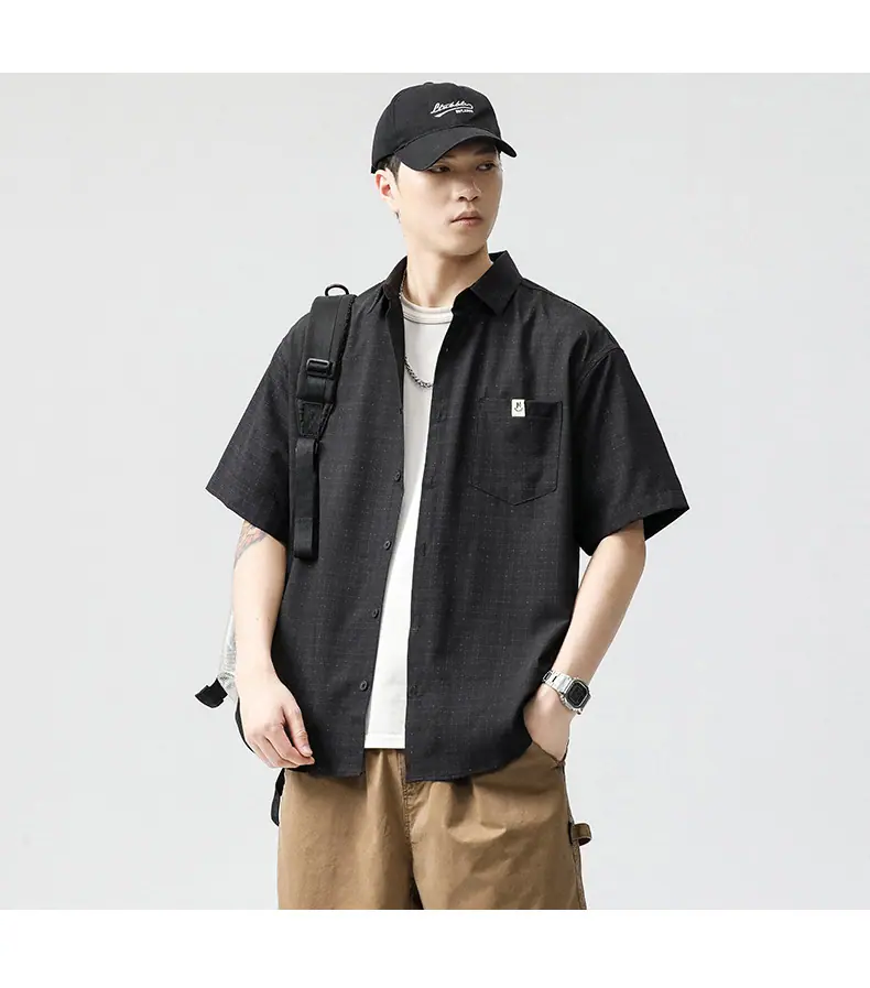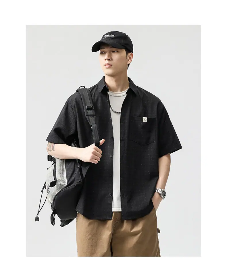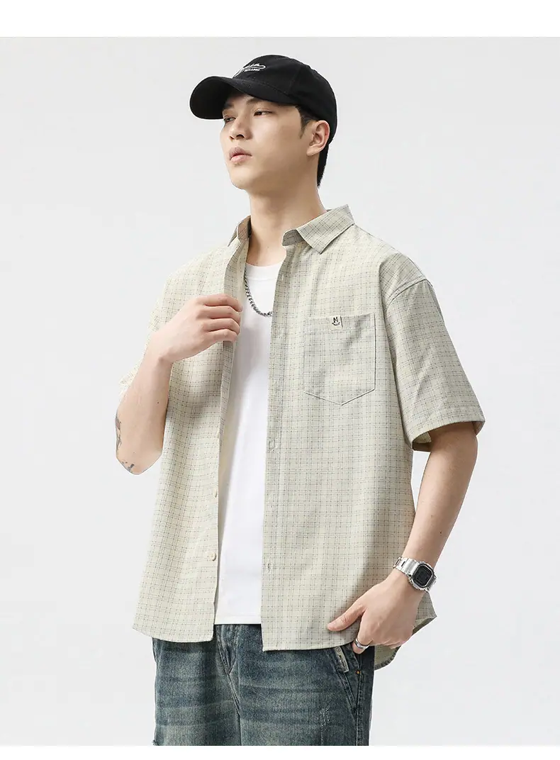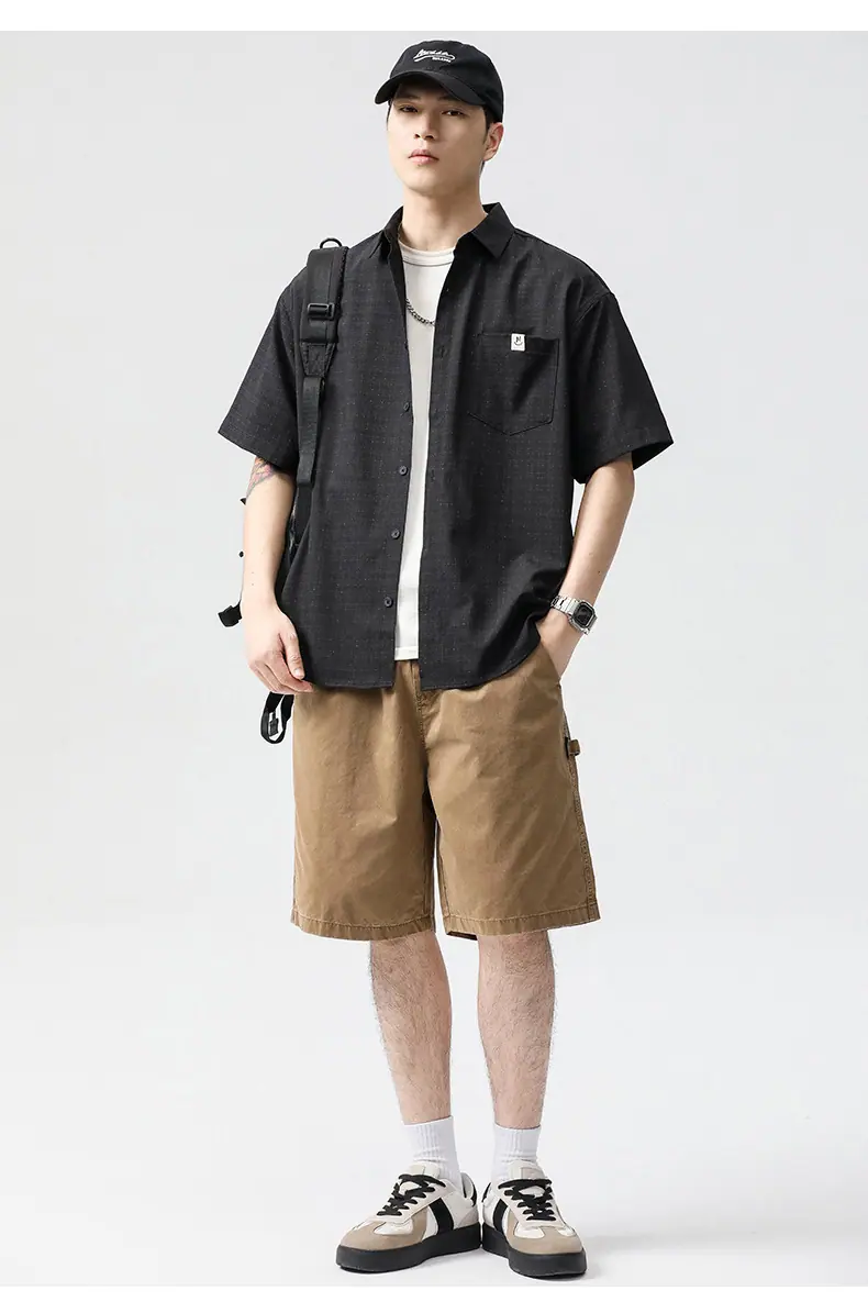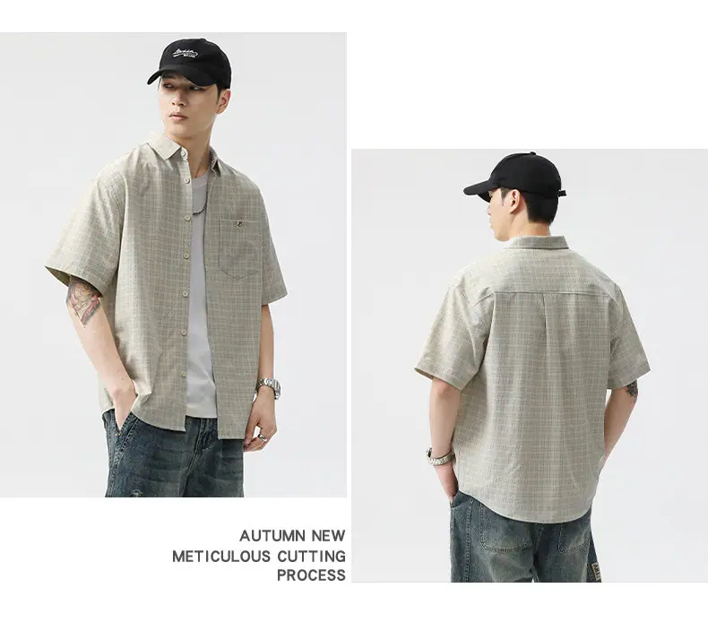 Camisa de Trabajo a Cuadros Jacquard de Verano 2024 para Hombre, Verano, Solapa, Holgada, Casual, Combinable con Todo, Camisa de Manga Corta para Hombre