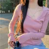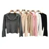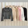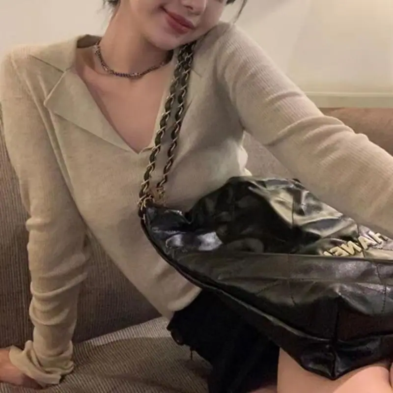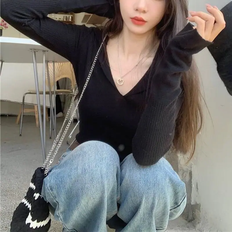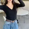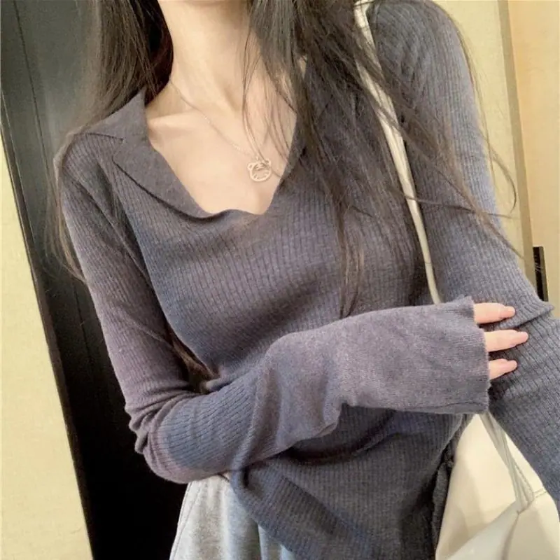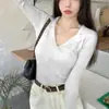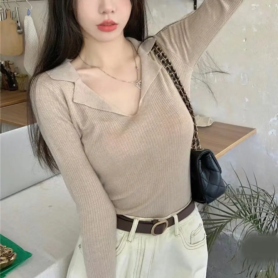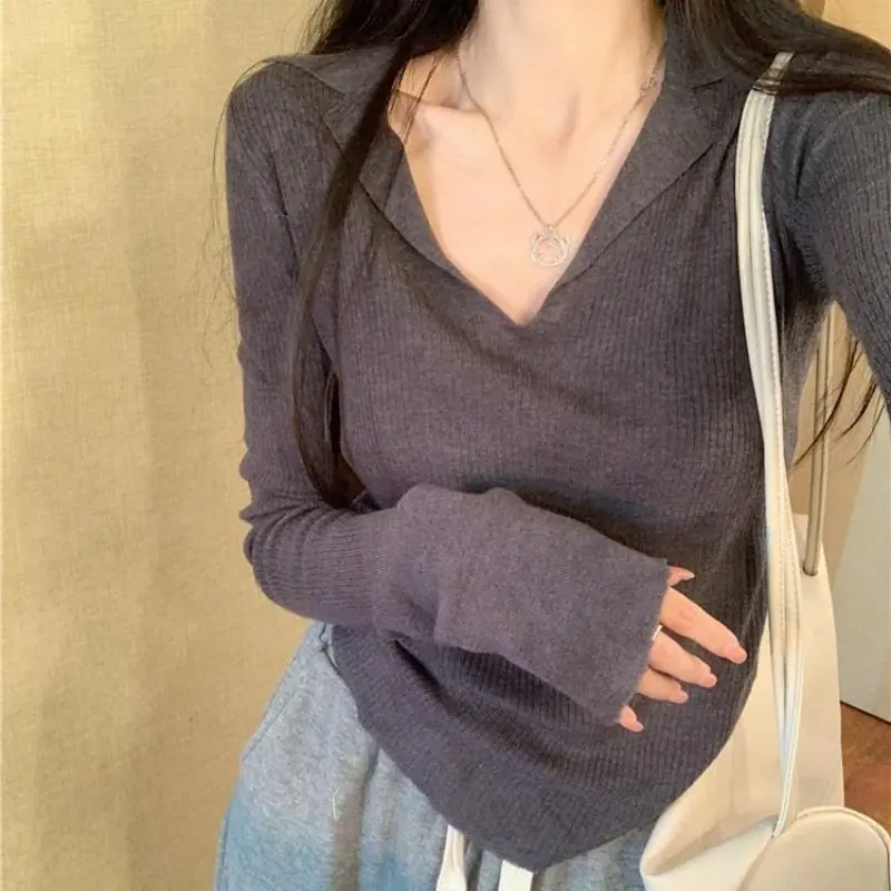 Principios de Otoño para Mujer Nuevo Delgado Cuello Polo Sexy Sexy Cuello en V Ajustado Manga Larga Top de Punto Camiseta Básica