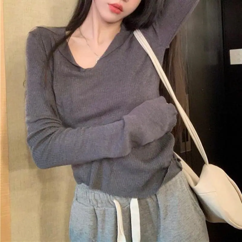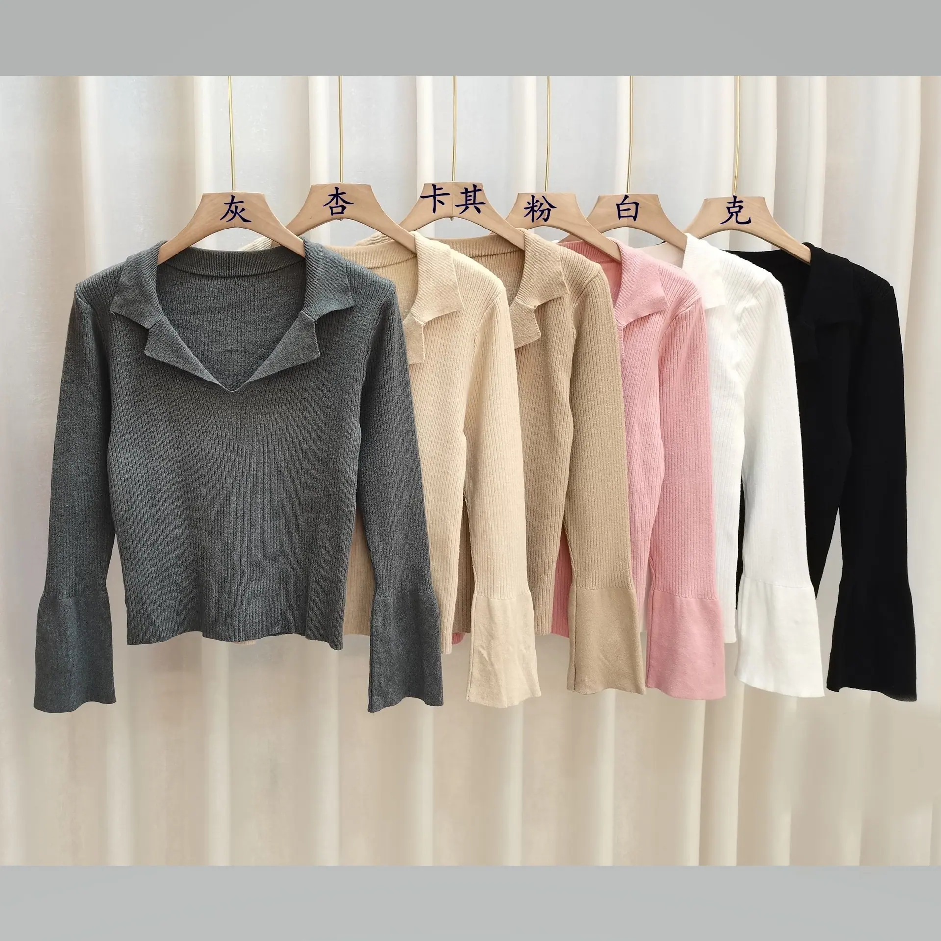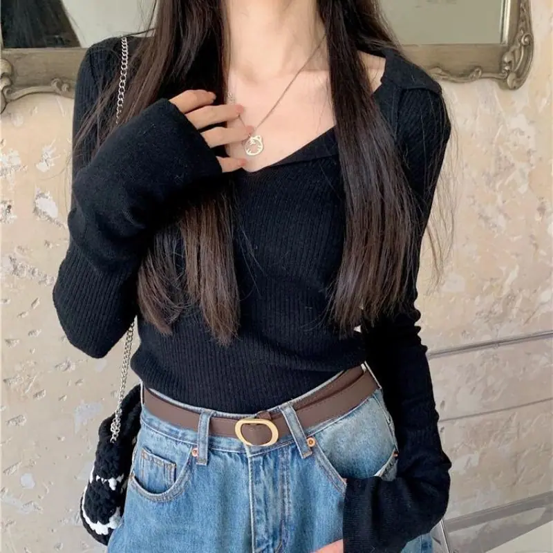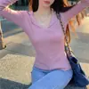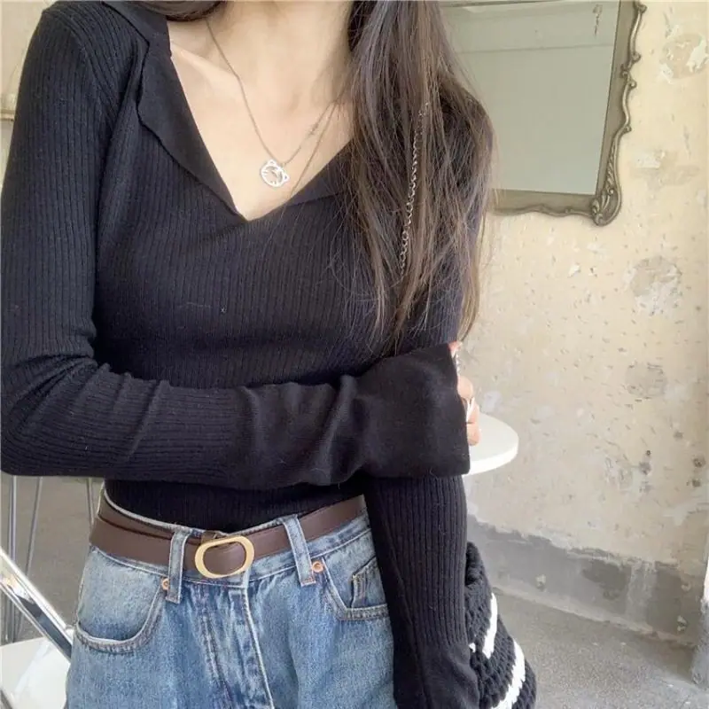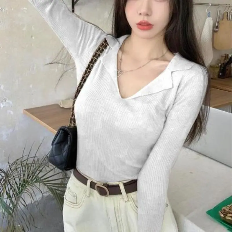 Compra Principios de Otoño para Mujer Nuevo Delgado Cuello Polo Sexy Sexy Cuello en V Ajustado Manga Larga Top de Punto Camiseta Básica al por mayor en Joom.pro