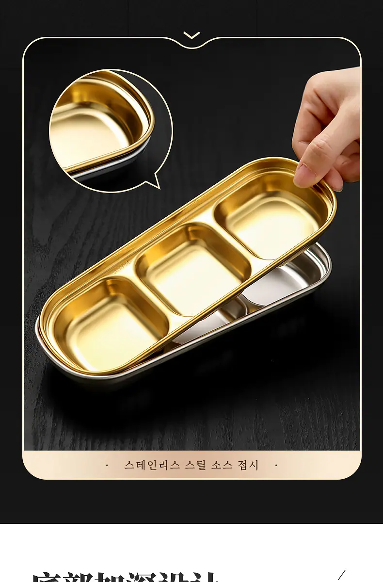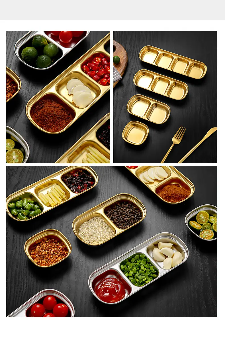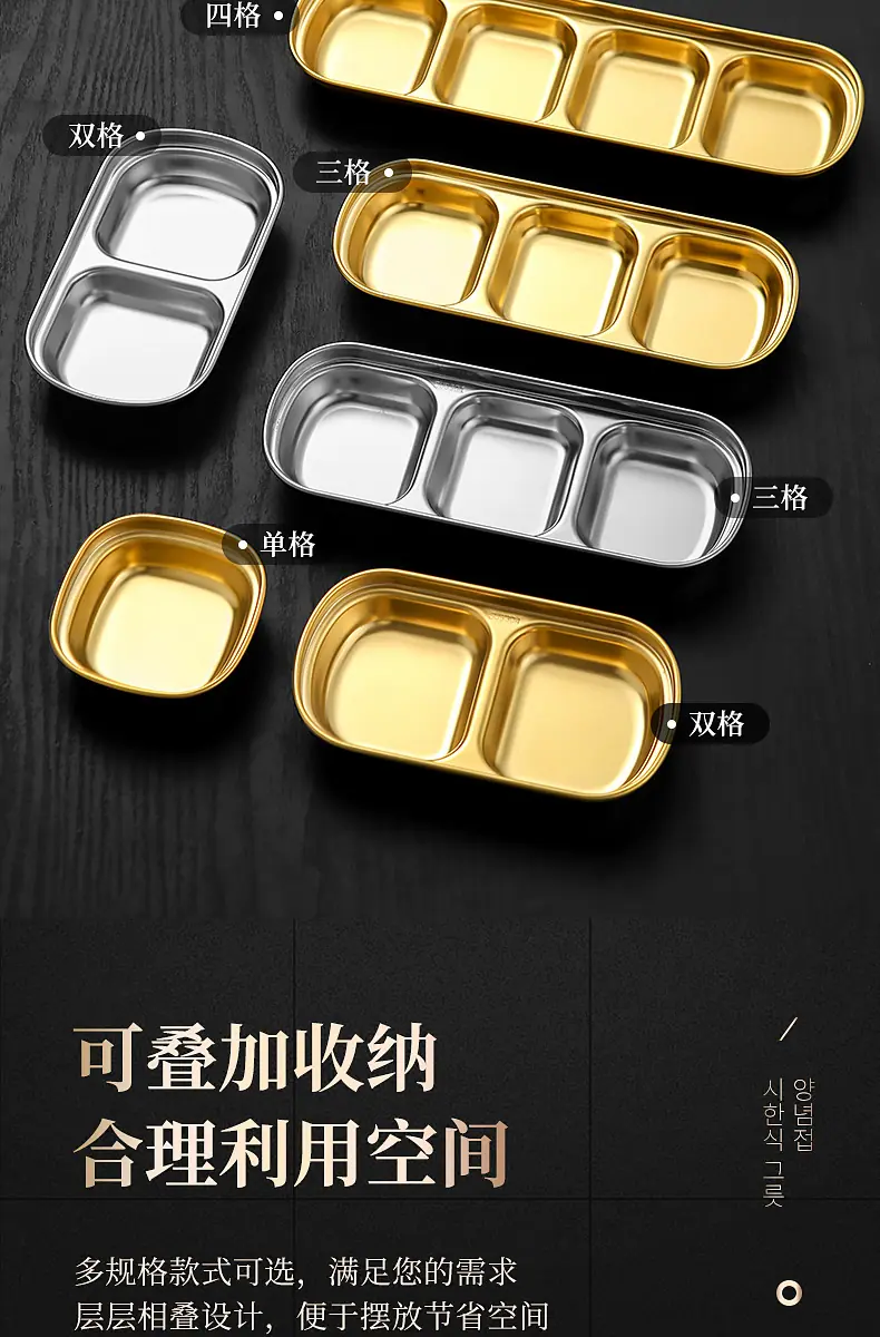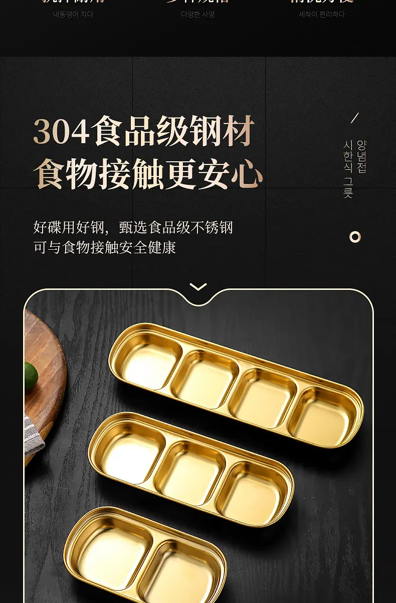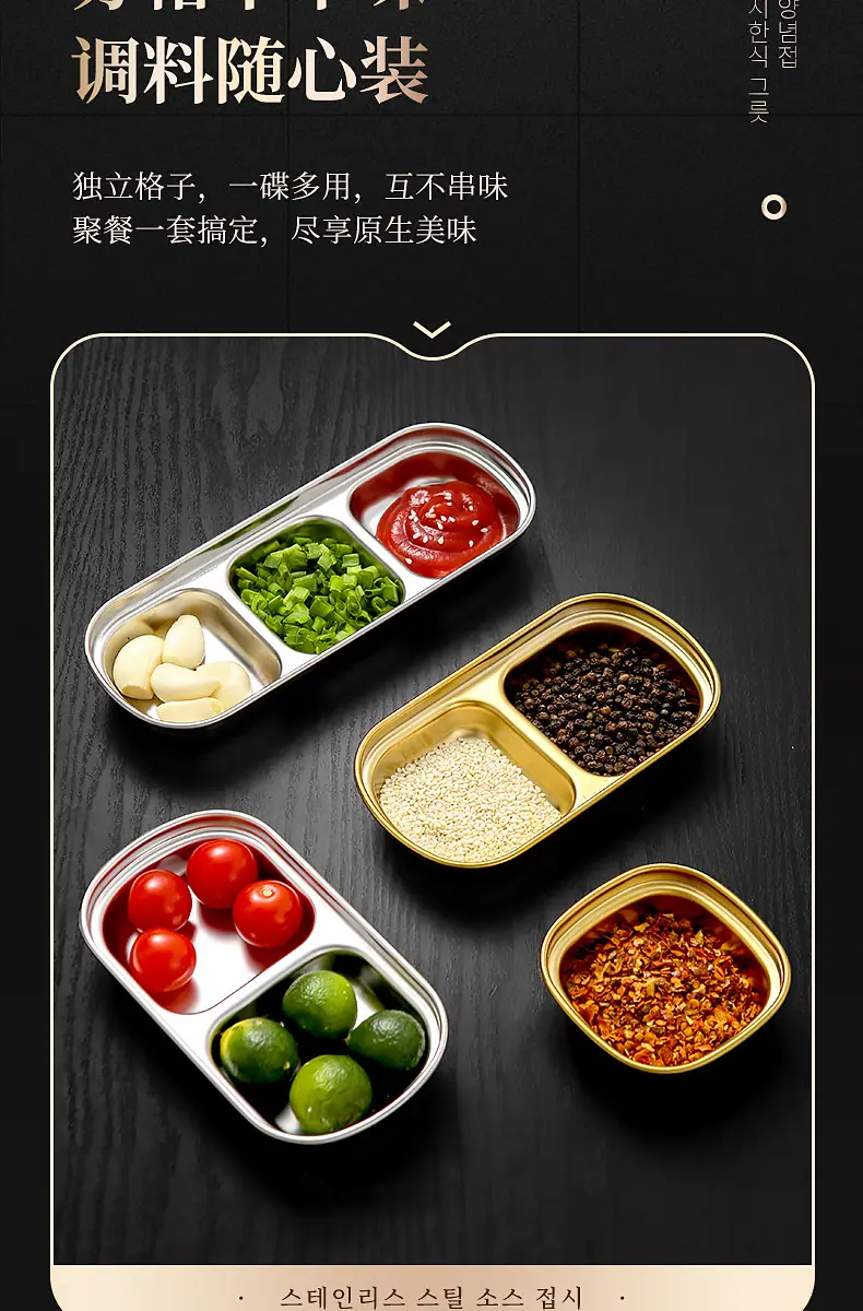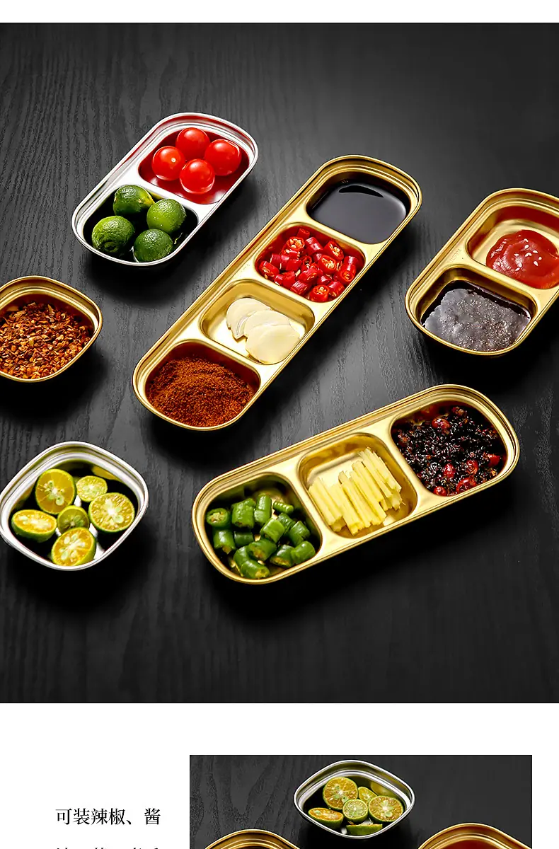Compra Plato para mojar de acero inoxidable 304, rejilla para mojar platos, plato para saborizar platos, plato grueso para condimentos dorados para barbacoa, dos compartimentos, tres compartimentos, plato para salsa, estilo coreano al por mayor en Joom.pro